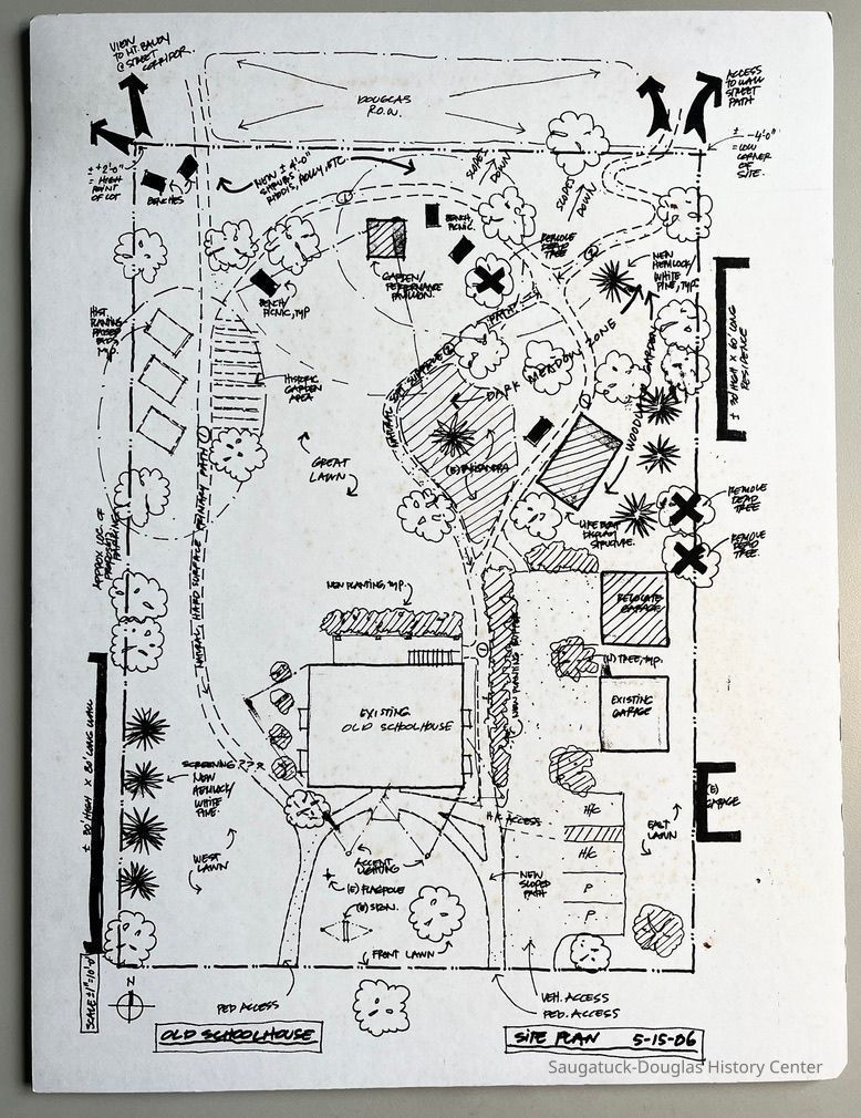 Copy of an initial site plan for the landscaping around the Douglas Union School, aka the Old School House, to create the Saugatuck-Douglas History Center. The plan is mounted on black foam-cor board and dated May 15, 2006.