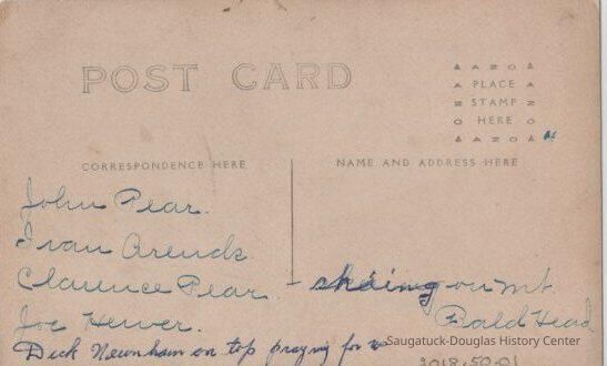 Print, black and white photograph(5.5x3.5") Skiers on Mt. Baldhead dated 1911. The names on the back are: John Pear, Ivan Arends, Clarence Pear, Joe Herver, "Dick Newnham on top praying for us."