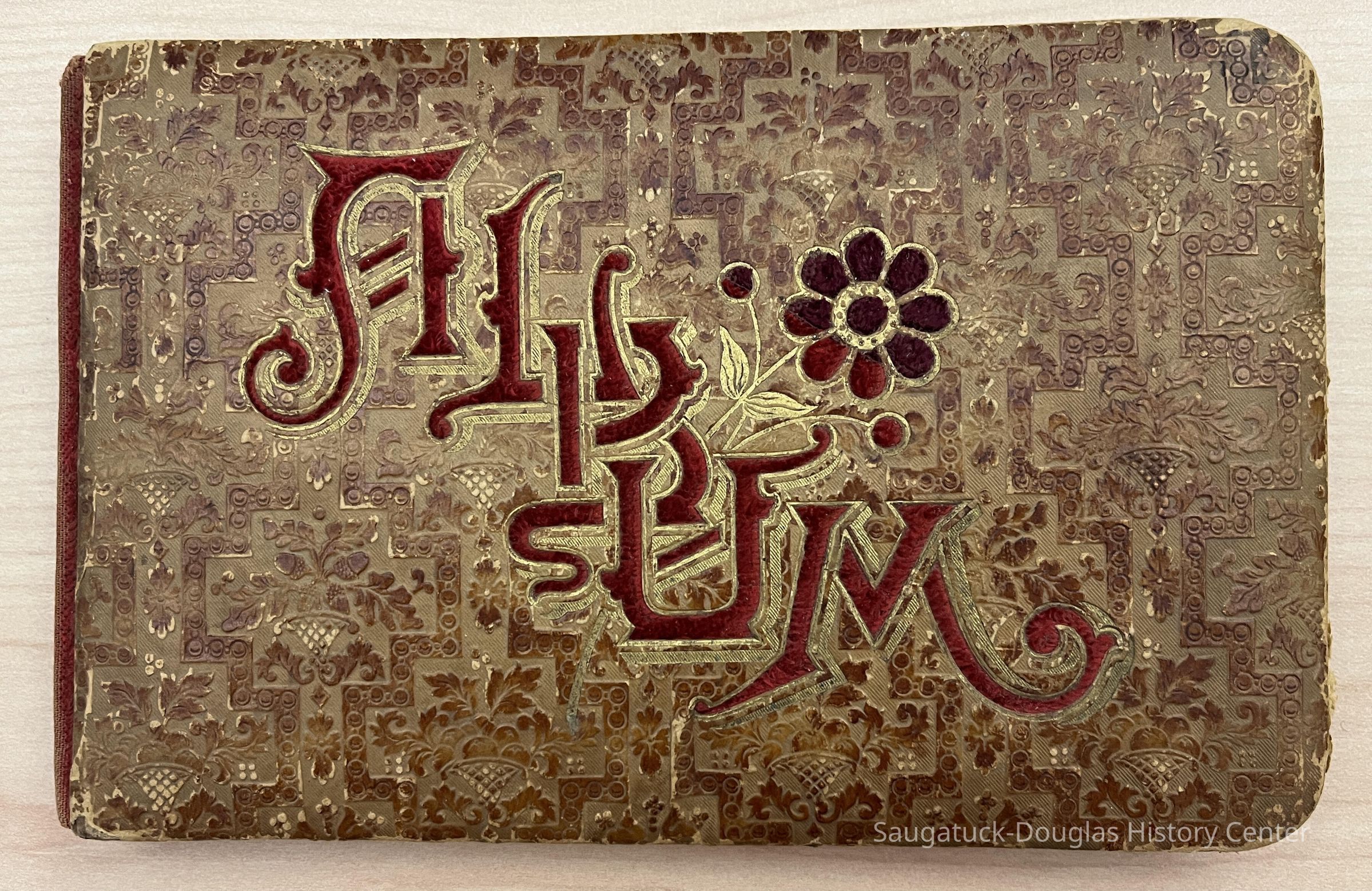 Cover is embossed red and gold with intertwined letters spelling "Album" over a dense, Victorian background pattern.