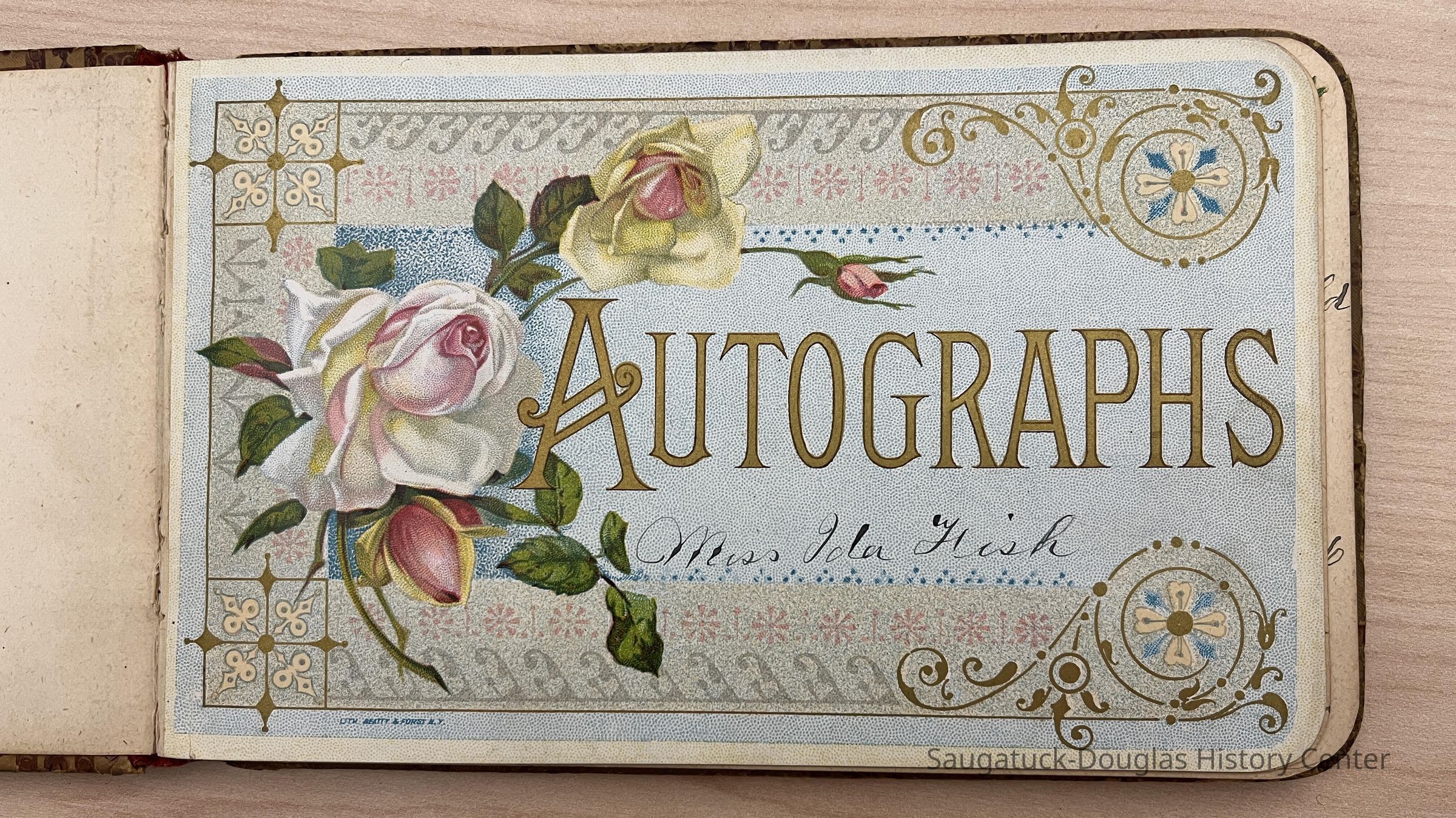 Ornate album autograph with name "Miss Ida Hish" on ornate front page.