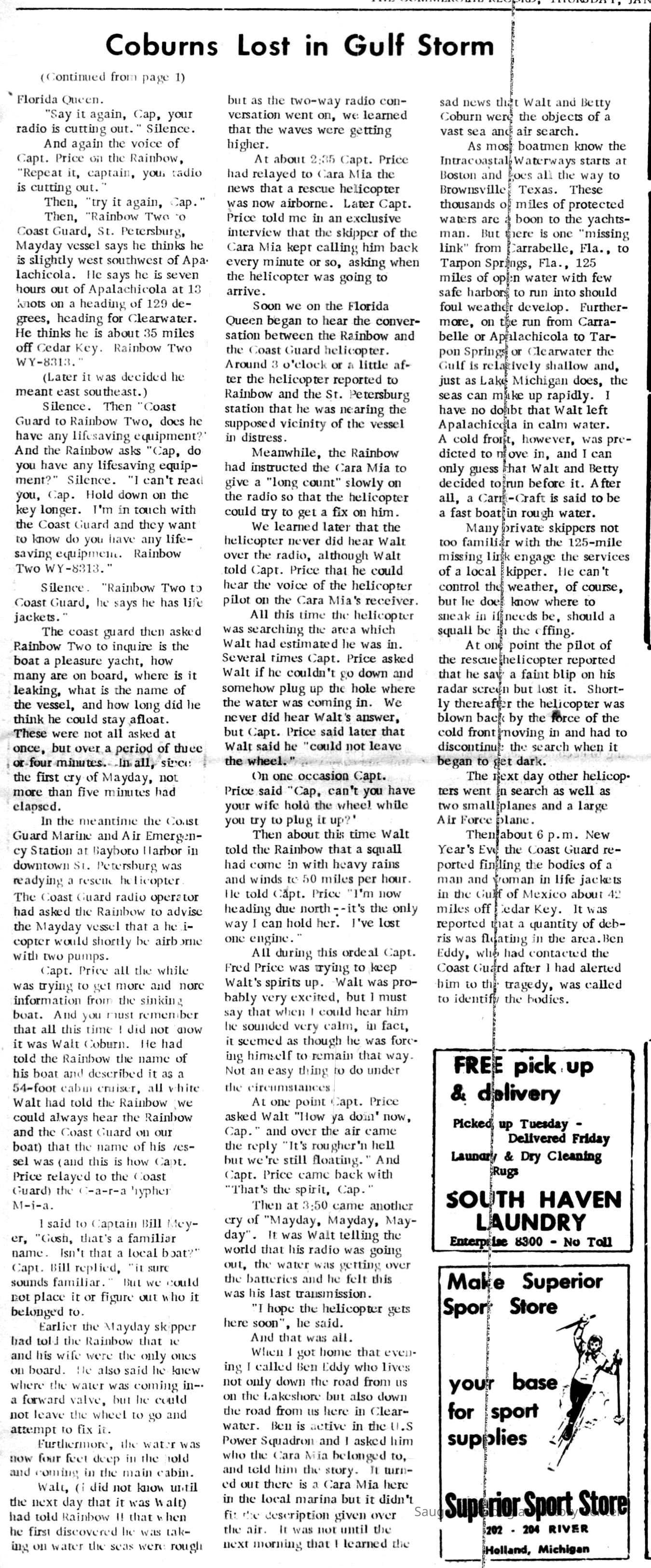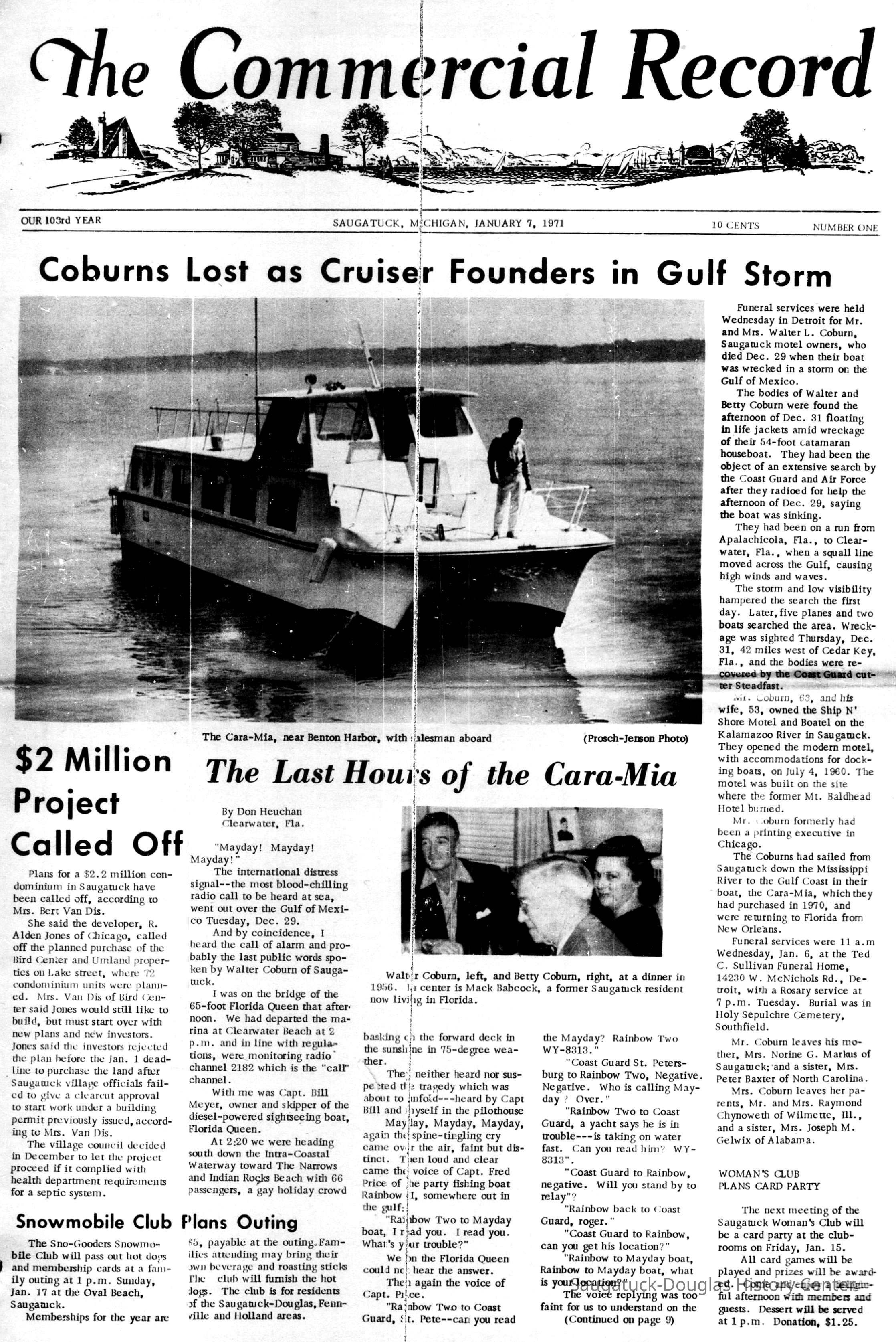 Articles about the deadly "Cara-Mia" boat accident on December 29, 1970.
