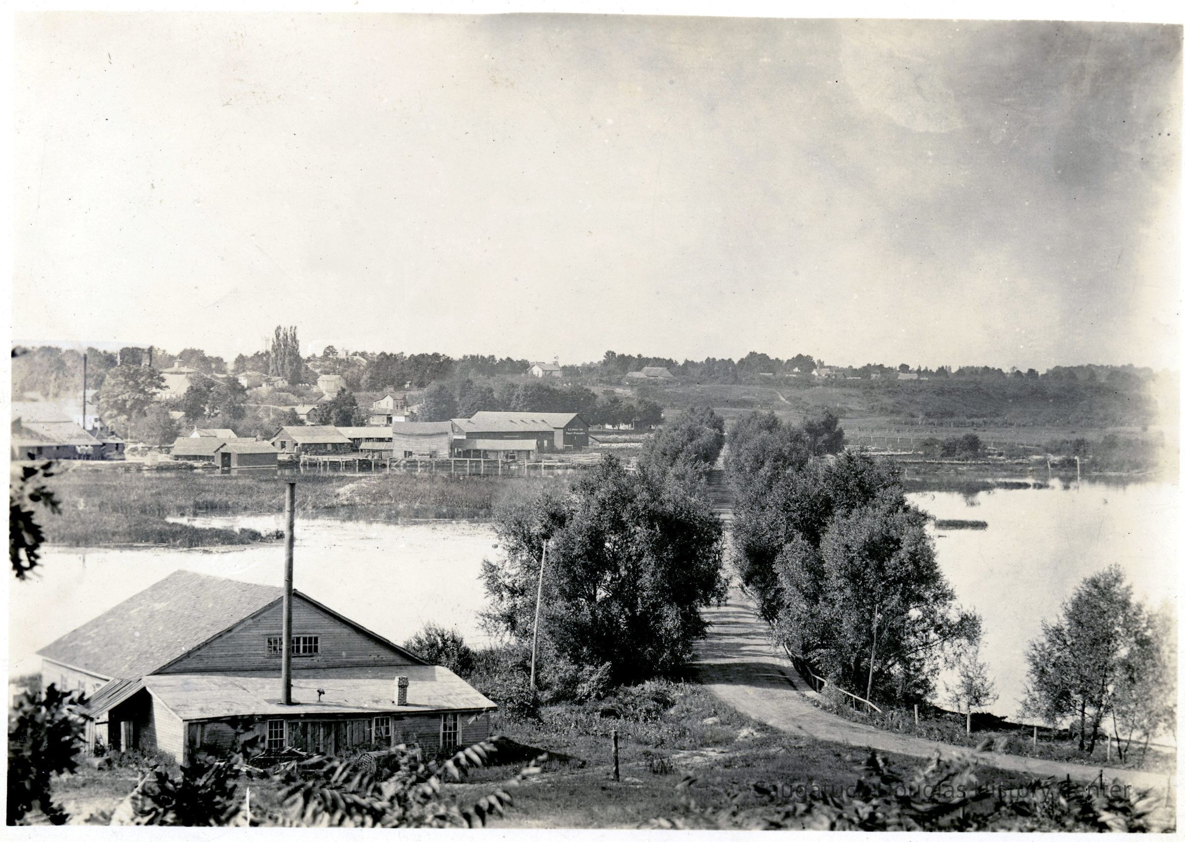 This image was featured as History Mystery #63 with the question "An exceptional photo of Douglas ca 1895. Name five historic structures in the scene." and the solution "This ca 1895 photo of Douglas shows five historic structures ... Clipson mill - Brewery - Basket factory - Dutcher Hall - Union School - Spencer farmhouse (later the Tara)"