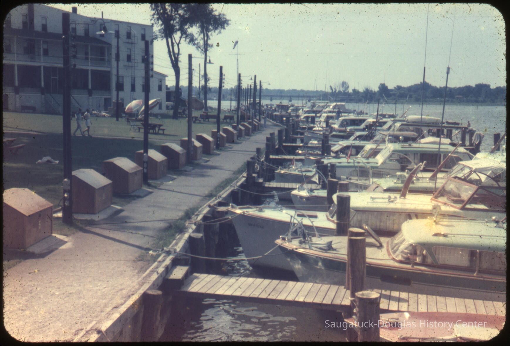 Two 35mm positive slides showing the boats and docks behind the Butler Hotel/Restaurant before the building's upper floors were removed. Visible are many mid-Century pleasure boats, boat boxes and a grassy park area. In the distance the Blue Star bridge crossed the Lake Kalamazoo. Jack Sheridan dates the photos circa 1960-65.