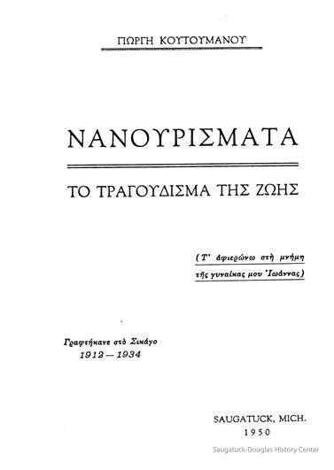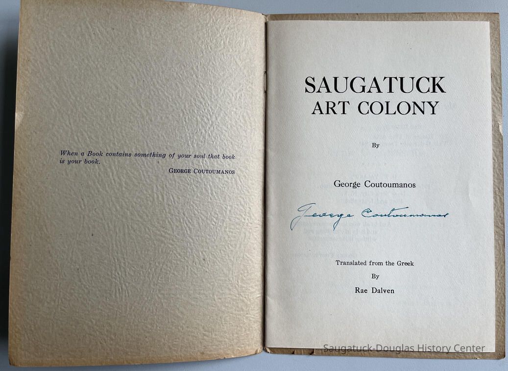 Saugatuck - Douglas History Bookshelf Featuring publications on area history, both present day and in the past. Offered as a guide and inspiration for those who peruse used book stores. "Saugatuck Art Colony" [1945?] n.p., 5 1/2 x 8 1/2, saddlestitched. Translated by Rae Dalvin. George Coutoumanos was part owner of the Athenian Tobacco Co of Chicago tobacco that went out of business during the Depression and moved to Saugatuck in 1939. He was born in Greece and, although he learned enough English for ordinary conversation, he continued to write poetry in his native tongue. His poems were published in America for the Greek-speaking reader. A later collection by an Athens publisher received considerable critical acclaim in Europe. In 1944 the "Greek American Tribune" of New York City published a small prose work written by George Coutoumanos called "Saugatuck Art Colony," in several installments. Greek literary critics called it a new literary style, prose with a touch of poetry. The following year it was translated into English by Rae Dalvin, formerly of the theater department of Yale University. Coutoumanos was a much-loved fixture in Saugatuck. He was tall, with a straight back, and always wore a full suit. With his cane punctuating the way he would walk for miles, often hanging out at park benches along Butler Street. He was considered the town philosopher. Wally Peirce, who rowed the ferry scow in the 1940s wrote later that on slow days Coutoumanos would sometimes go back and forth on the boat. "We would talk about beautiful things that surrounded us that he could see and I was tripping over. It was rather like rowing Plato across the river, and coming back with Bernard Baruch." George and Jenny had seven children. A daughter, Anna, opened a restaurant in Saugatuck and a son, Clarence, was for a while associated with the Sand Bar on Butler Street. Jennie died in 1942 and George later moved to a house on Lake Street where he lived with his brother Annis. "The place always smelled strongly of Greek-style lemon soup," a young neighbor recalls. In the 1950s he published three books of Greek poetry. Their titles are translated Songs of the Soul, The Lullabies and Trilogy: Truth, Life, Money. All were printed by the Cosmos Greek-American Printing Co., but their title pages listed "Saugatuck, Mich." as the place of publication. The designation was the only English on a page of Greek. A number of these Greek poetry books still exist in Saugatuck, especially among Coutoumanos' friends at All Saints Episcopal Church, though few who were honored with copies of the volume know what the words within it say. The small volume Saugatuck Art Colony received much wider distribution in town, and some of the copies that have been located have notations that would indicate that at least two resorts placed a copy in each room. The imagery is poetic: "The romantic and magic Kalamazoo River, crowned by its morning and evening shadows and by the uninterrupted proud watersheds of the sand dunes around it, leaves the great modern bridge, laughing, and enters joyfully into the tiny crystalline lake baptized with its name. Then it crosses triumphantly through Saugatuck, makes two or three serpentine, smooth curves that close the triangle, gazes thrice-desolate, sullen and sad at its familiar river bed that greeted her for thousands of years ... crosses the new arms of the harbor, bidding a fond farewell to the lighthouse, then spills like the plaintive tears of a small tot slowly rolling around his mother's apron, into the freshwater sea Lake Michigan." George died in 1962 following a fall at the age of 82. He and Jenny are buried in Riverside Cemetery, Saugatuck. Just before Christmas, 1996, the widow of the youngest Coutoumanos son, Steve, and her son who is now a resident of Oregon, visited the area seeking family roots. They have, and will share for the upcoming exhibit, a painting done by Chris, another son of George and Jenny. Also, tucked away in a big cardboard box, is a large body of correspondence, in Greek, written by George during his time in Saugatuck. The grandson is now taking steps to have it translated and promises to share relevant results with Saugatuck, the Greek poet's adopted home. Copies of the little booklet Saugatuck Art Colony are quite common in Saugatuck, but few who knew him want to part with their copy. In organized book stores they sell for $7 to $10. In less organized stores a copy can often be found in an ephemera box for less. Source: SDHS newsletter insert, page 18-19
