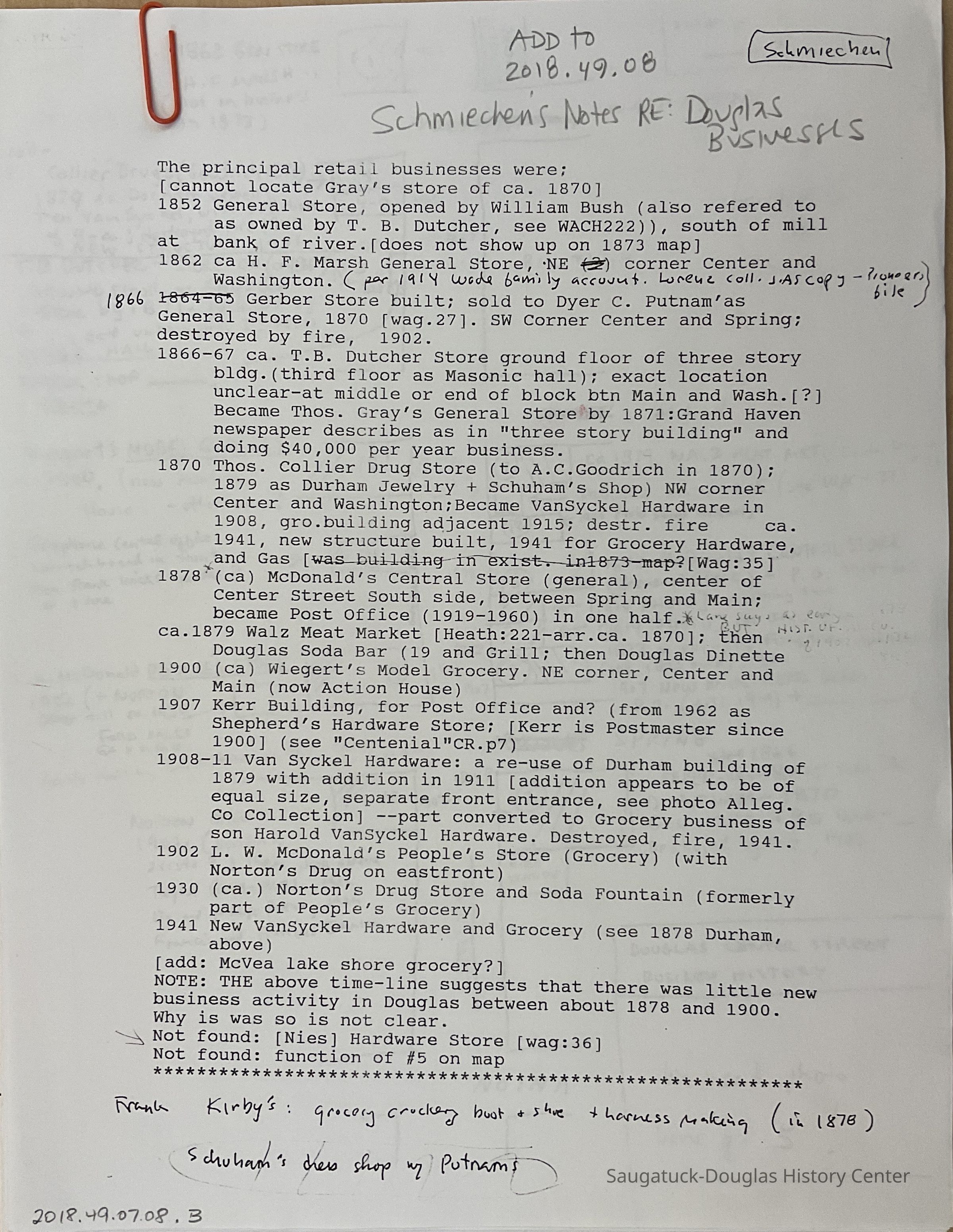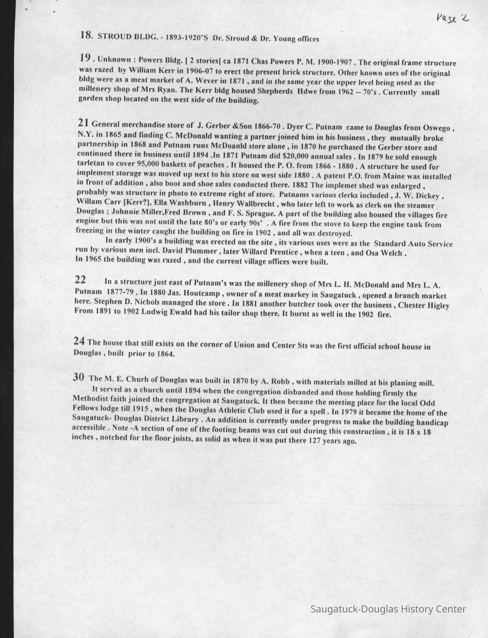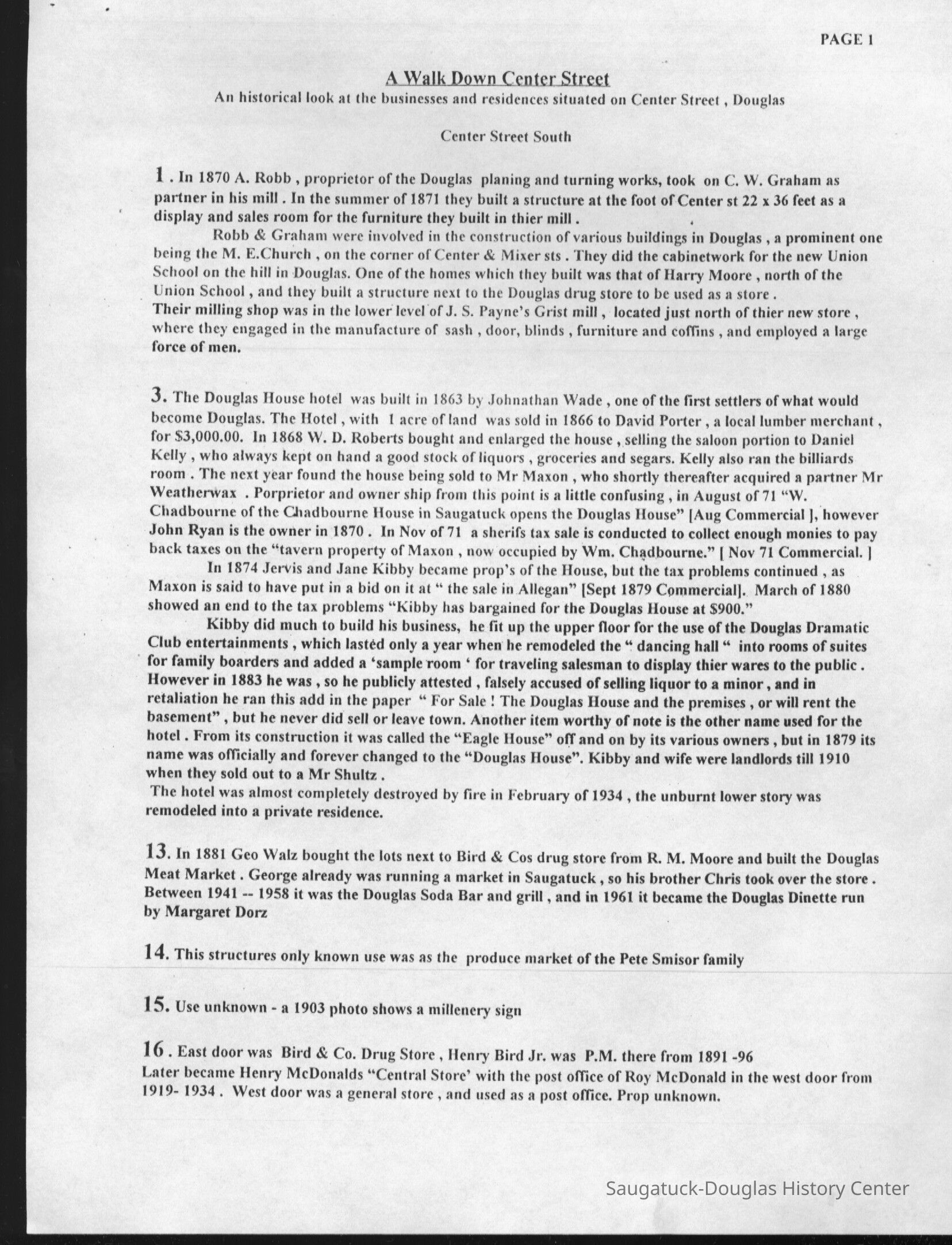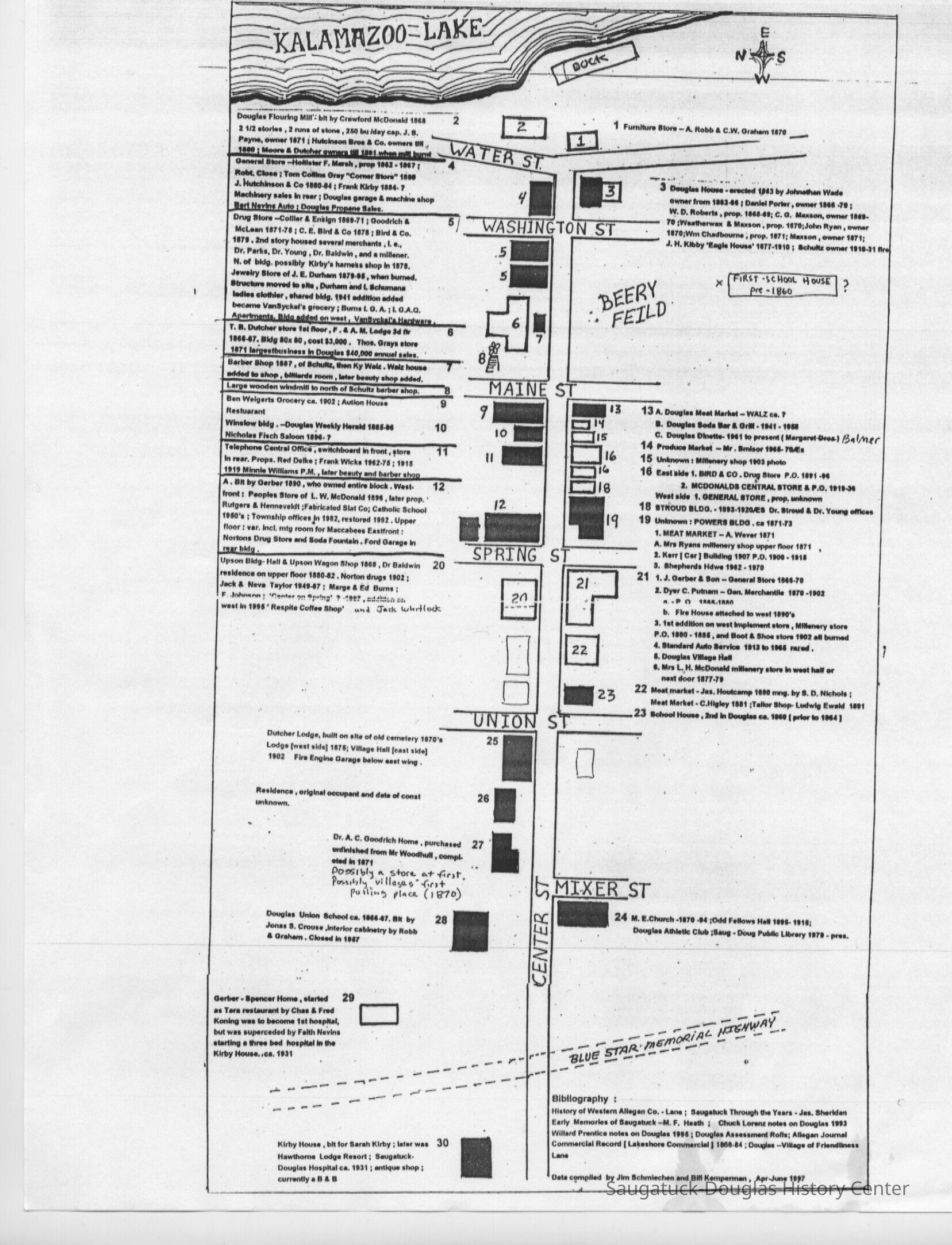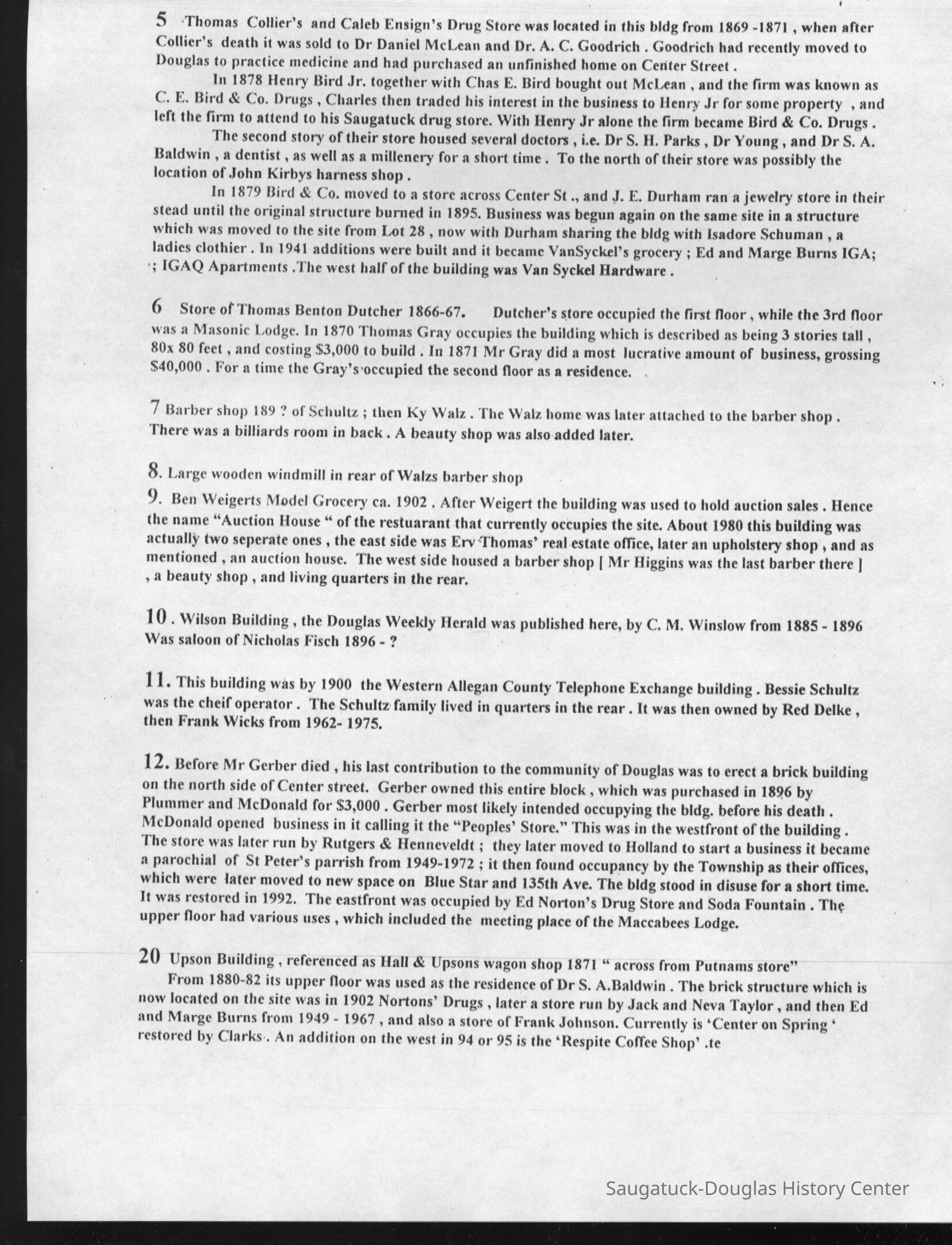 Bert Nevins, AutoBird & Co. Drug StoreC.E. Bird & Co. DrugsDouglas Athletic ClubDouglas Flouring MillDouglas Gas SalesDouglas House HotelEagle House (Douglas House)Ed Norton's Drug Store and Soda Fountain.Henry McDonalds Central StoreJ.S. Payne's GristmillKirby Harness shopOdd Fellows Lodge (old library)Rutgers & Henneveldt - Peoples StoreVanSyckel's groceryKirby, Sarah House (Hospital)Spencer-Gerber House TaraDouglas Union School