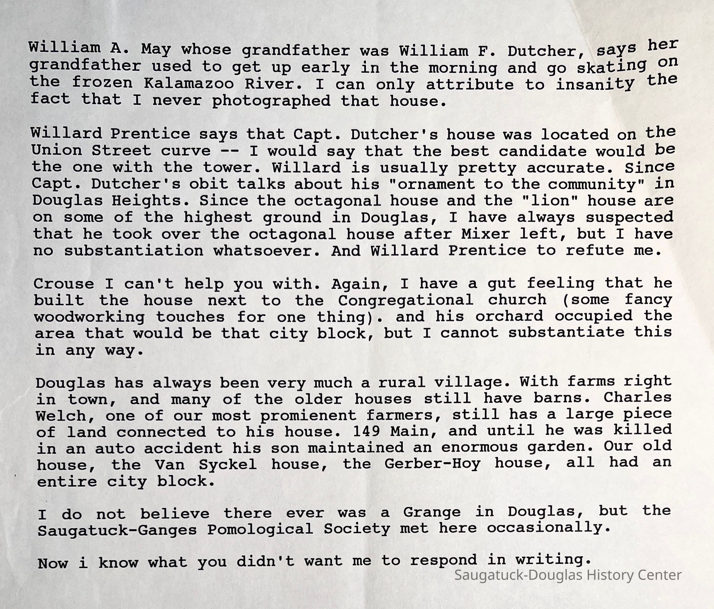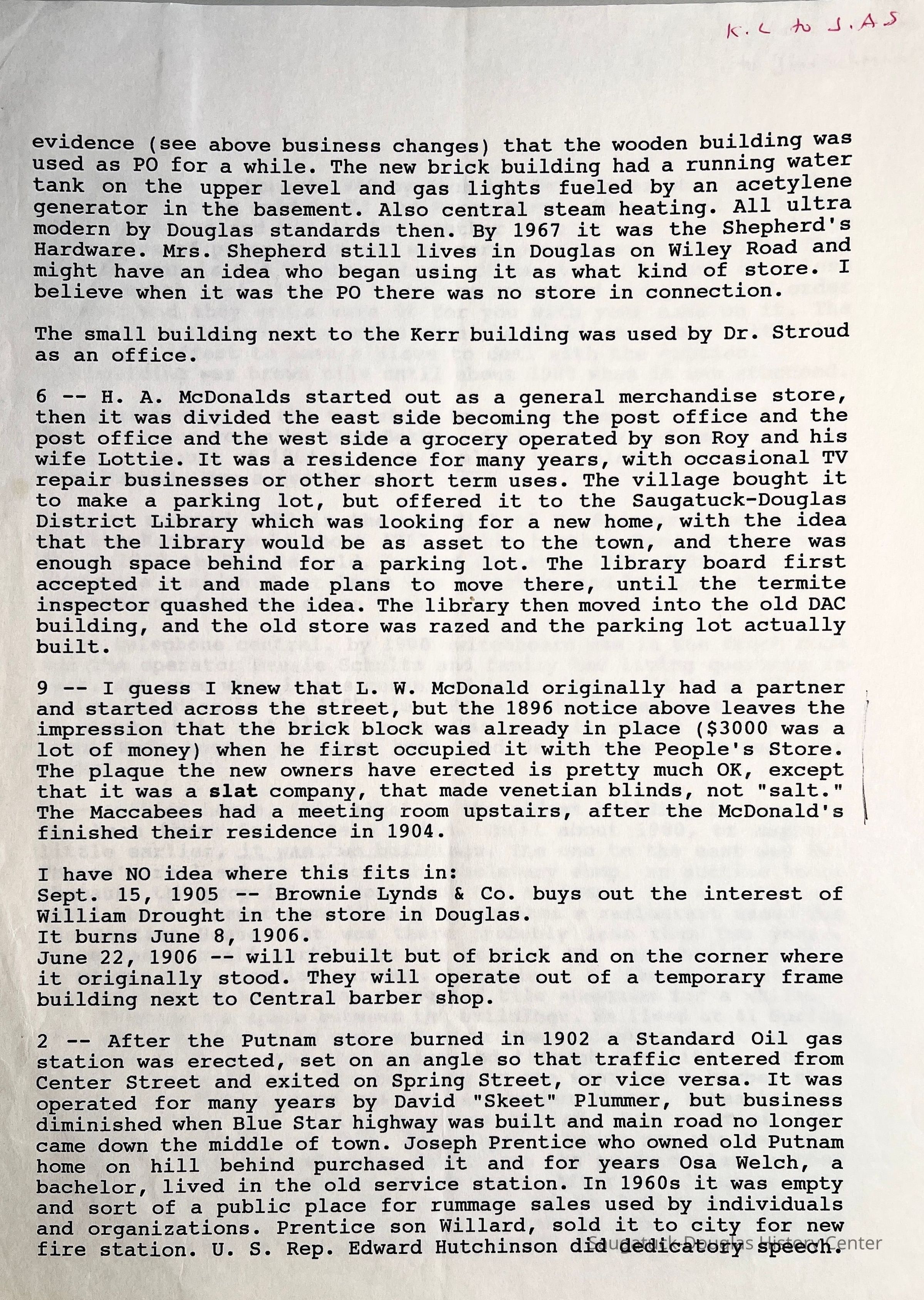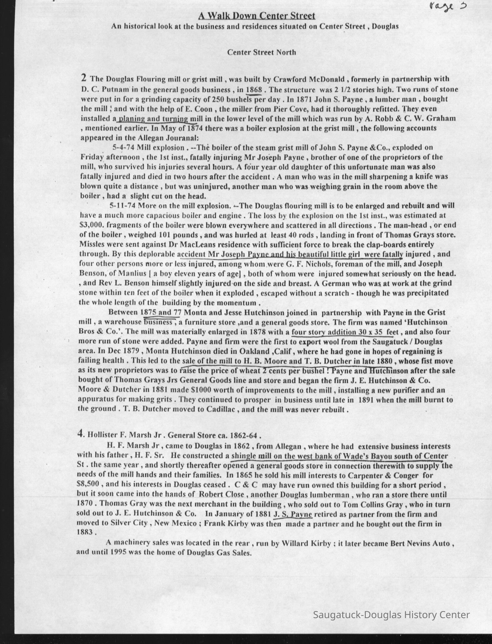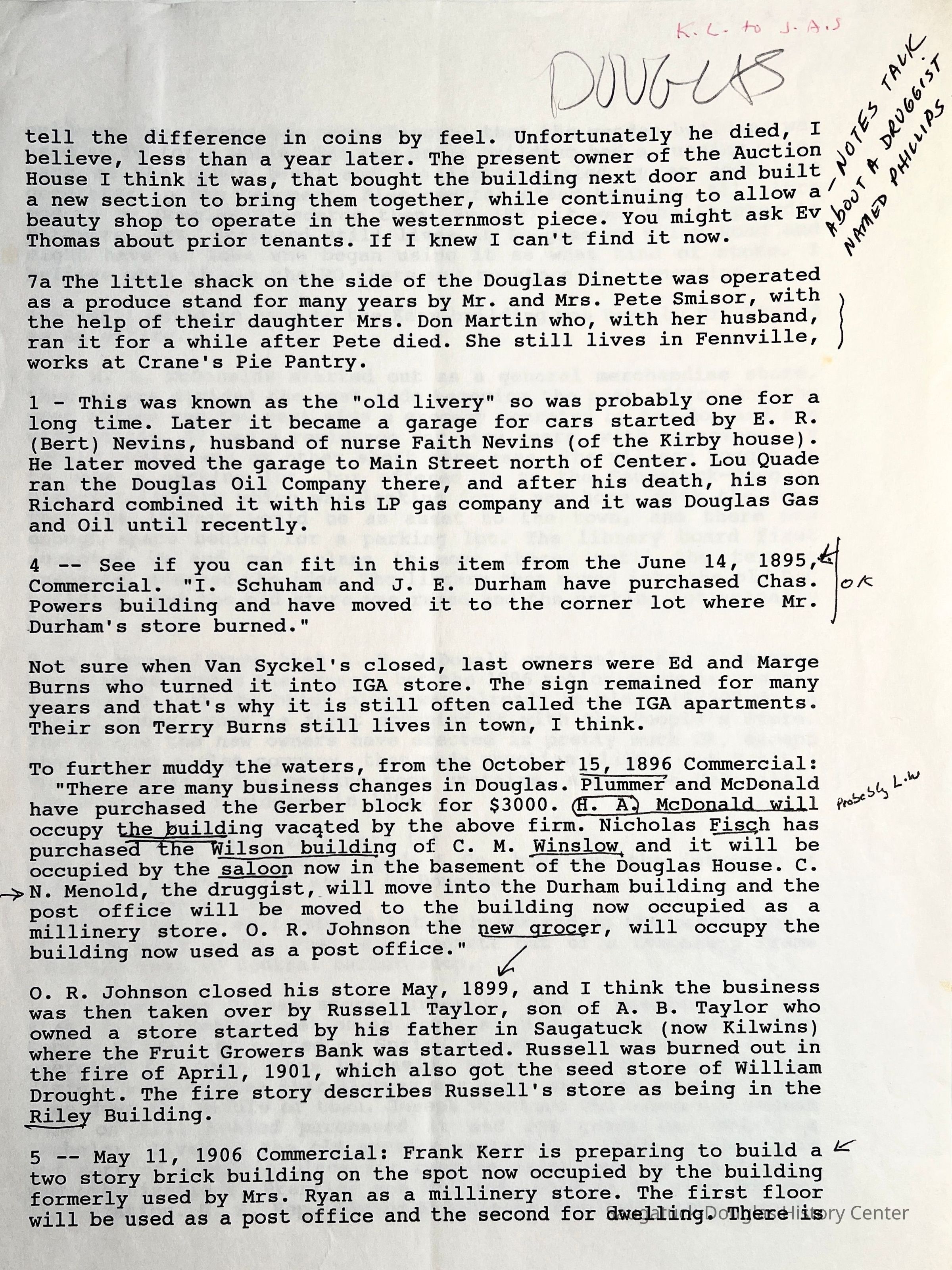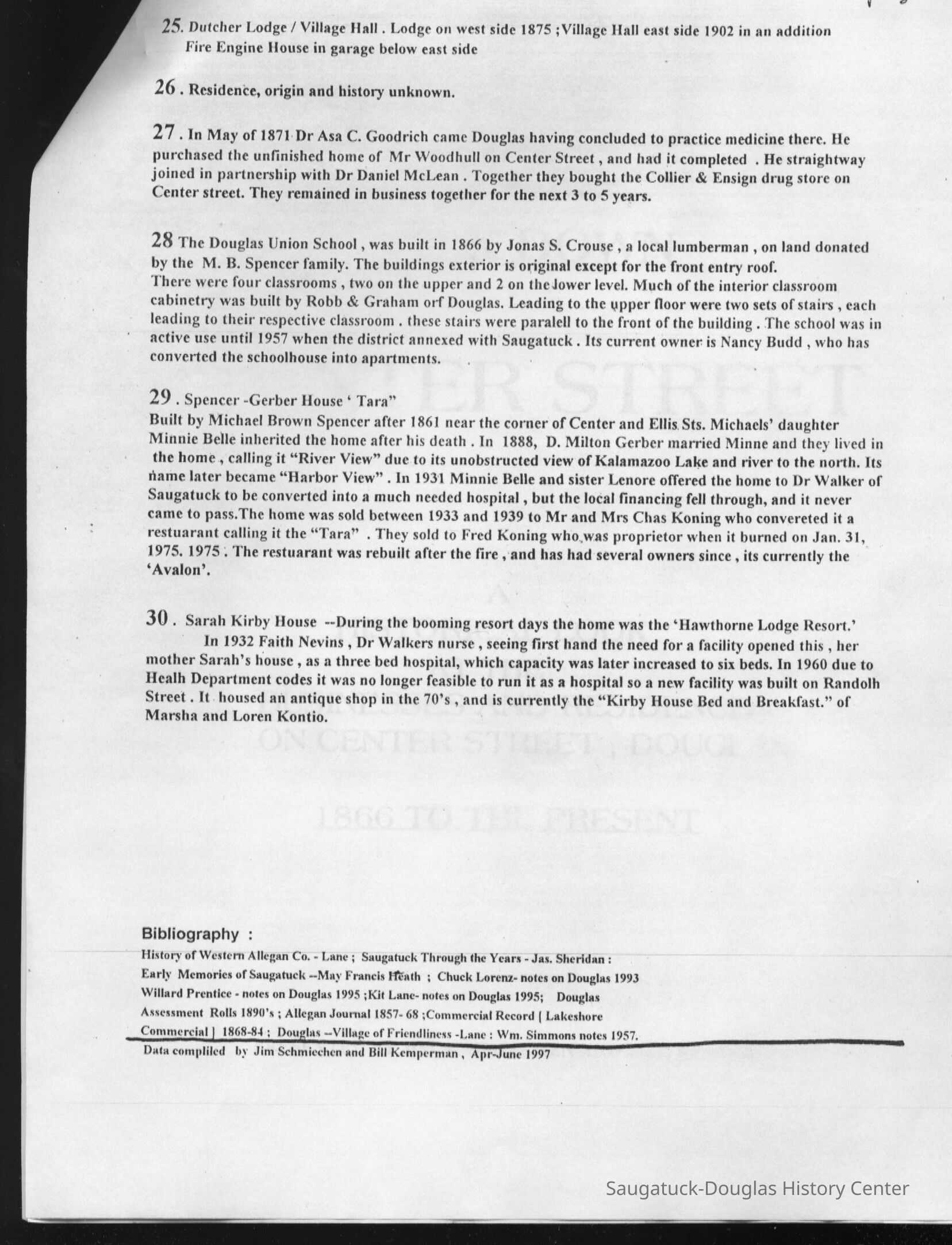 Bert Nevins, AutoBird & Co. Drug StoreC.E. Bird & Co. DrugsDouglas Athletic ClubDouglas Flouring MillDouglas Gas SalesDouglas House HotelEagle House (Douglas House)Ed Norton's Drug Store and Soda Fountain.Henry McDonalds Central StoreJ.S. Payne's GristmillKirby Harness shopOdd Fellows Lodge (old library)Rutgers & Henneveldt - Peoples StoreVanSyckel's groceryKirby, Sarah House (Hospital)Spencer-Gerber House TaraDouglas Union School