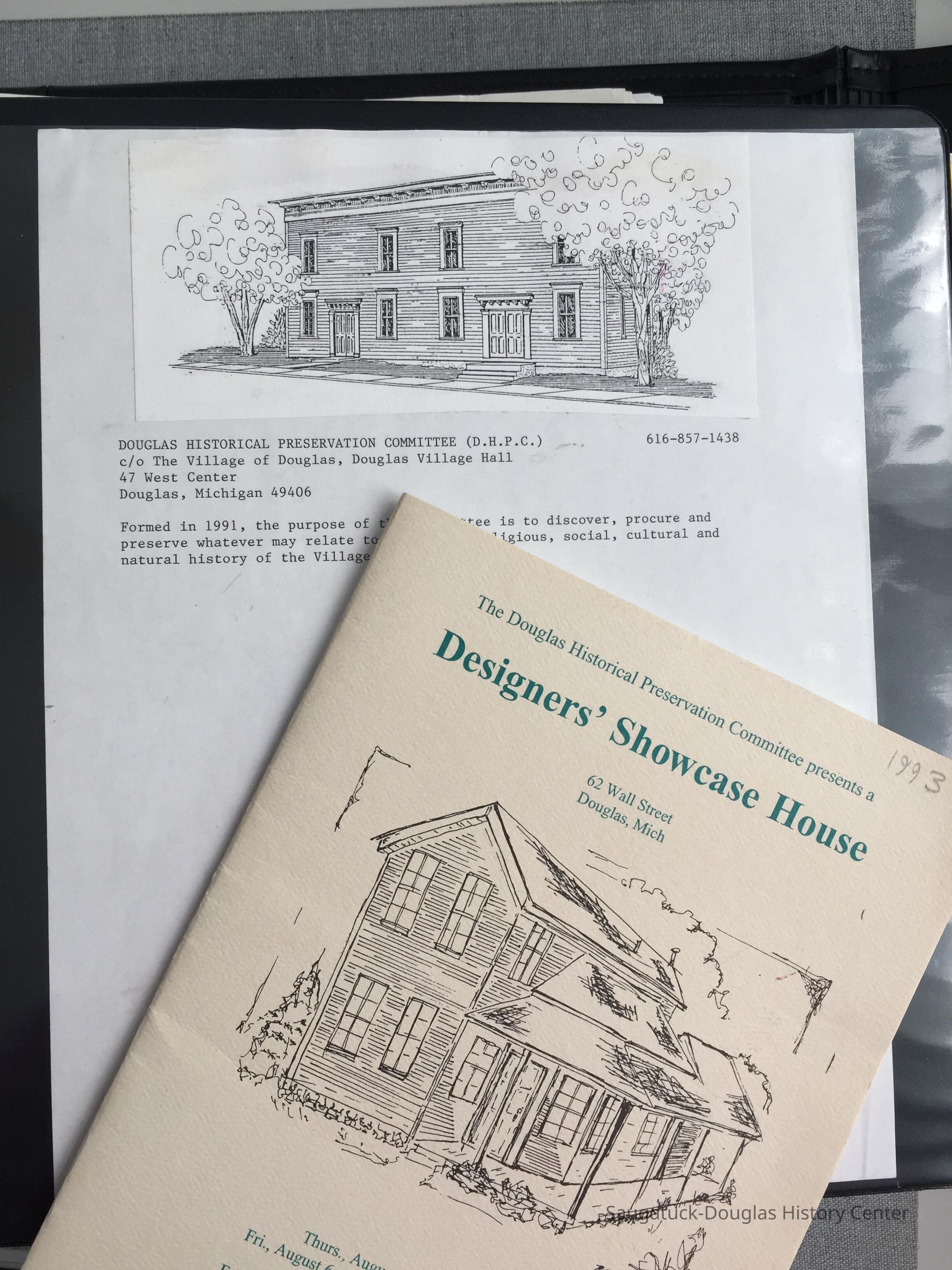 This 3-inch binder that includes the DHPC constitution, by-laws, press clippings, a history outline, Dutcher Lodge award winners, rosters, fundraisers (Sidewalk sales, Bowl-a-thon, Showcase houses, Home tours, Octoberfest, Blue Star Bridge Walk, Stan Wilson's pictorial afghan), historic marker dedication program and photos, architectural plans by Randers Engineering, letters of support, Douglas walking tour brochure and article, press releases, correspondence, and a certificate of recognition for Judy Anthrop, who likely compiled the documents.