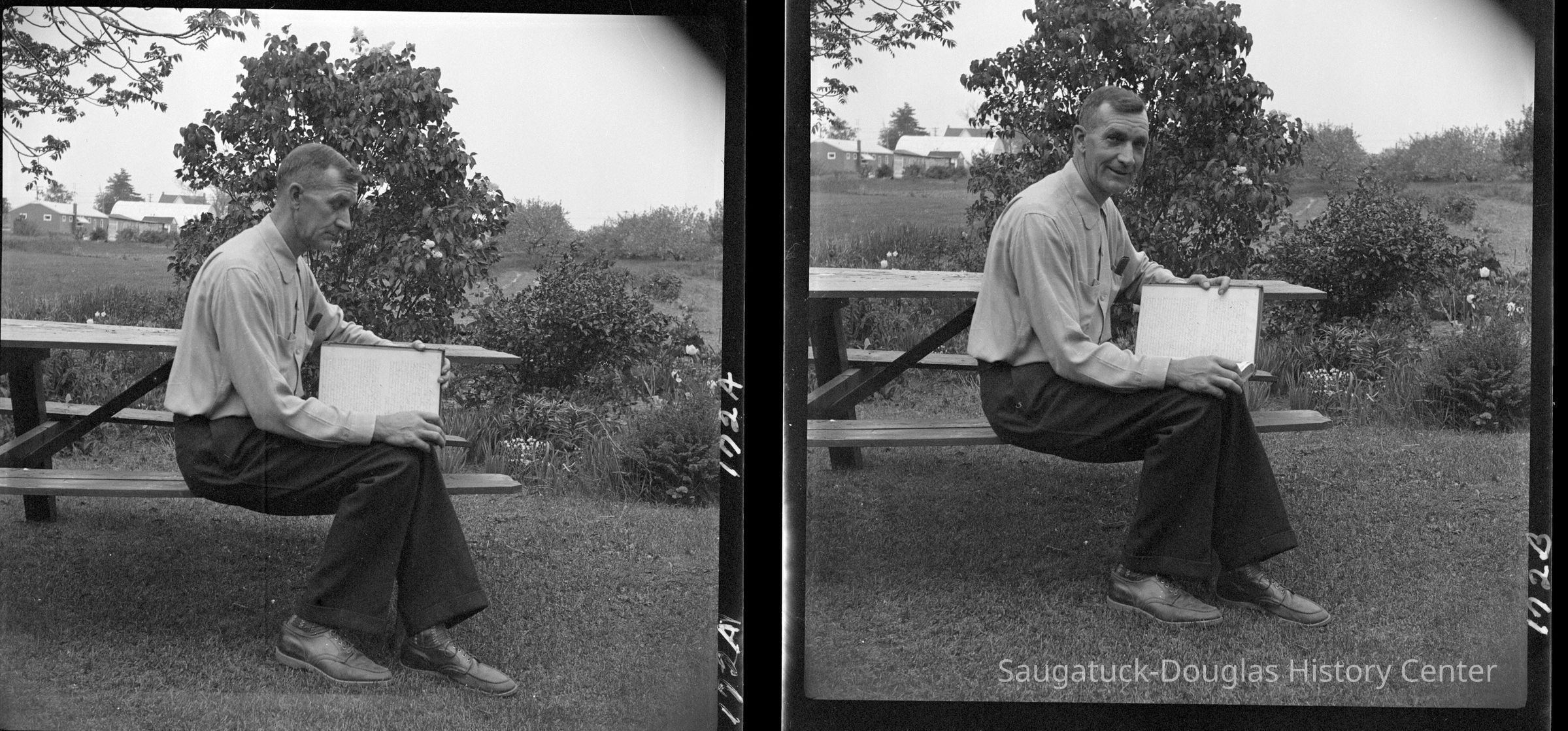 Douglas village clerk Howard C. Schultz siting on a picnic table with a notebook filled with handwritten text on his lap. Behind him a garden with a lilac shrub just beginning to blossom and a farm.