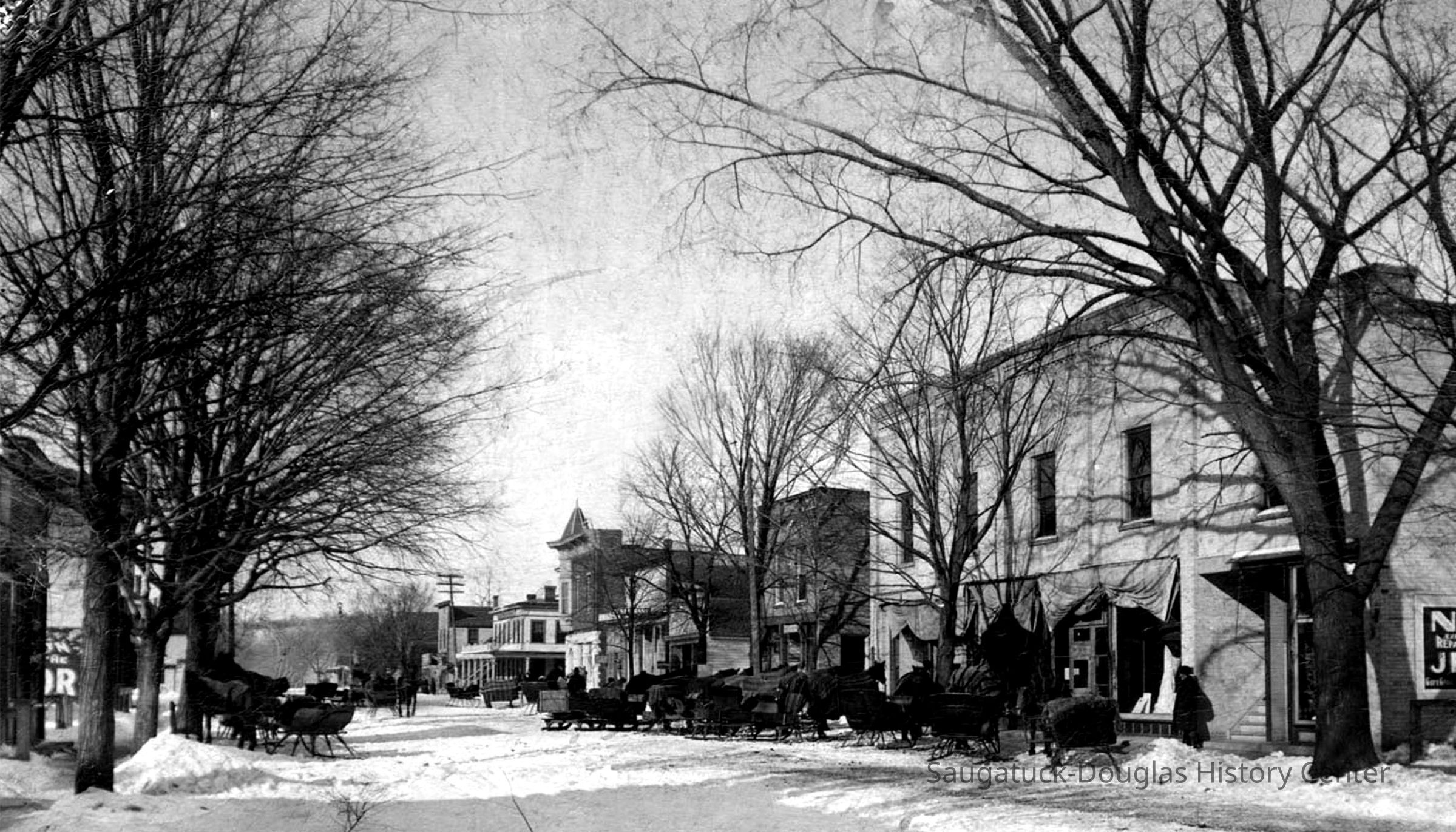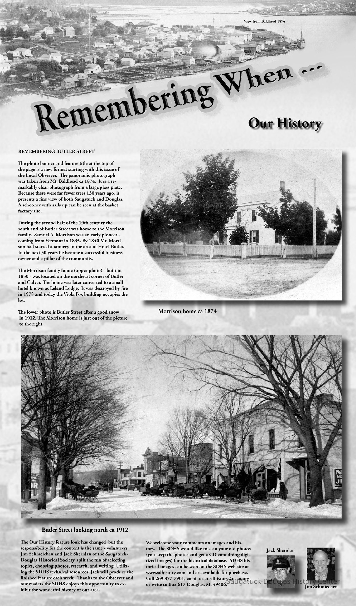 During the second half of the 19th century the south end of Butler Street was home to the Morrison family. Samuel A. Morrison [sic - Stephen] was an early pioneer - coming from Vermont in 1835. By 1840 Mr. Morrison had started a tannery in the area of the Hotel Butler. In the next 50 years he became a successful business owner and a pillar of the community. The Morrison family home (upper photo) - built in 1850 - was located on the northeast corner of Butler and Culver. The home was later converted to a small hotel known as Leland Lodge. It was destroyed by fire in 1978 and today the Viola Fox building occupies the lot. The lower photo is Butler Street after a good snow in 1912. The Morrison home is just out of the picture to the right.