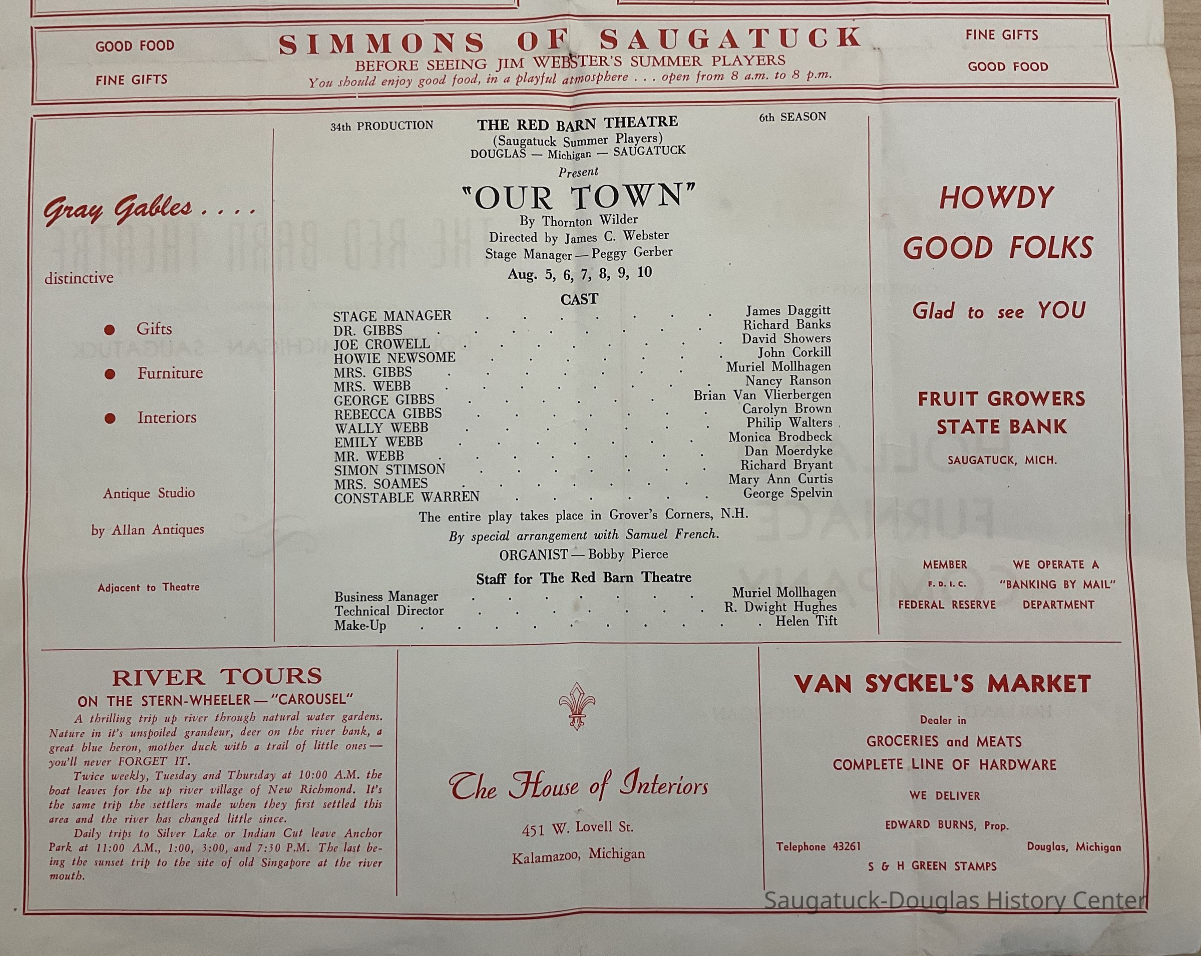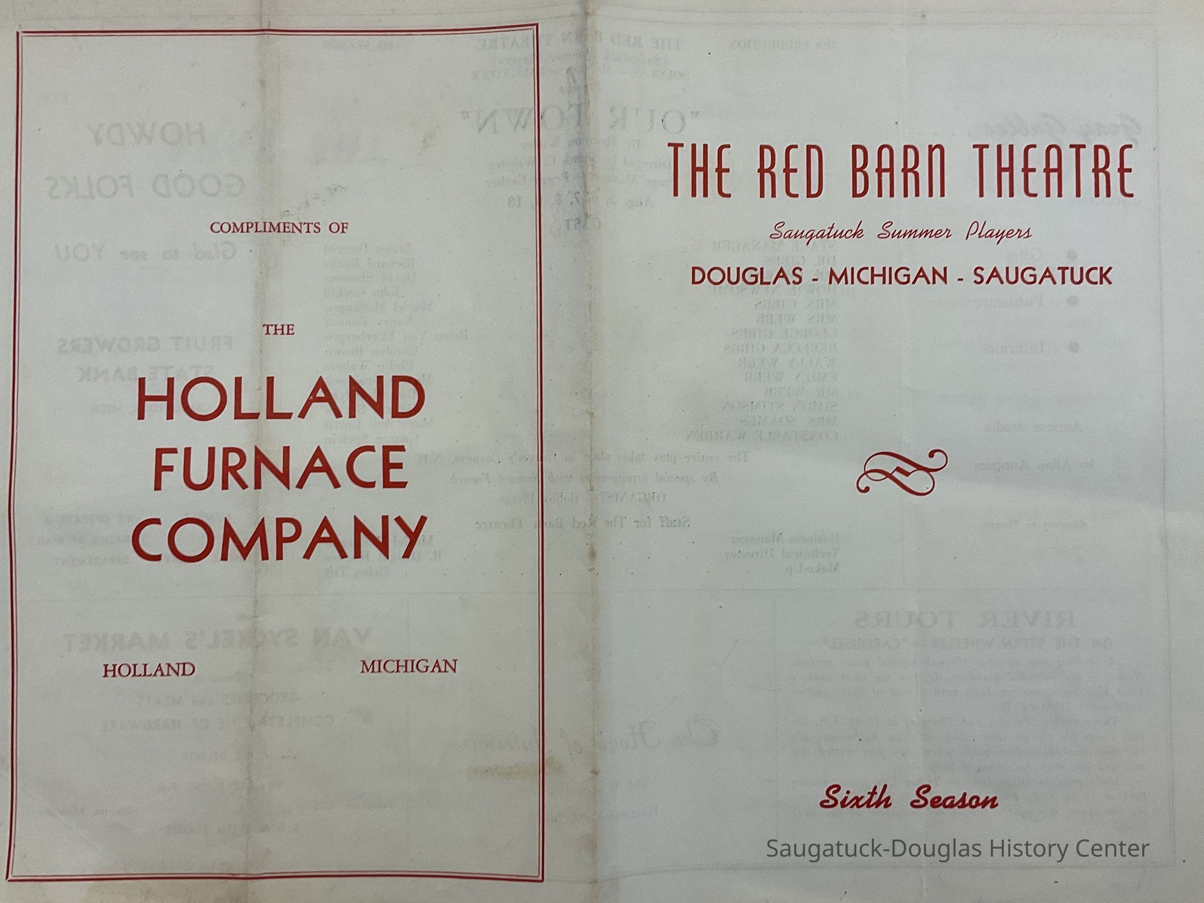 One page folded brochure of the sixth season of the Red Barn Theater (year unknown) Featured production is "Our Town" the 34th production.
