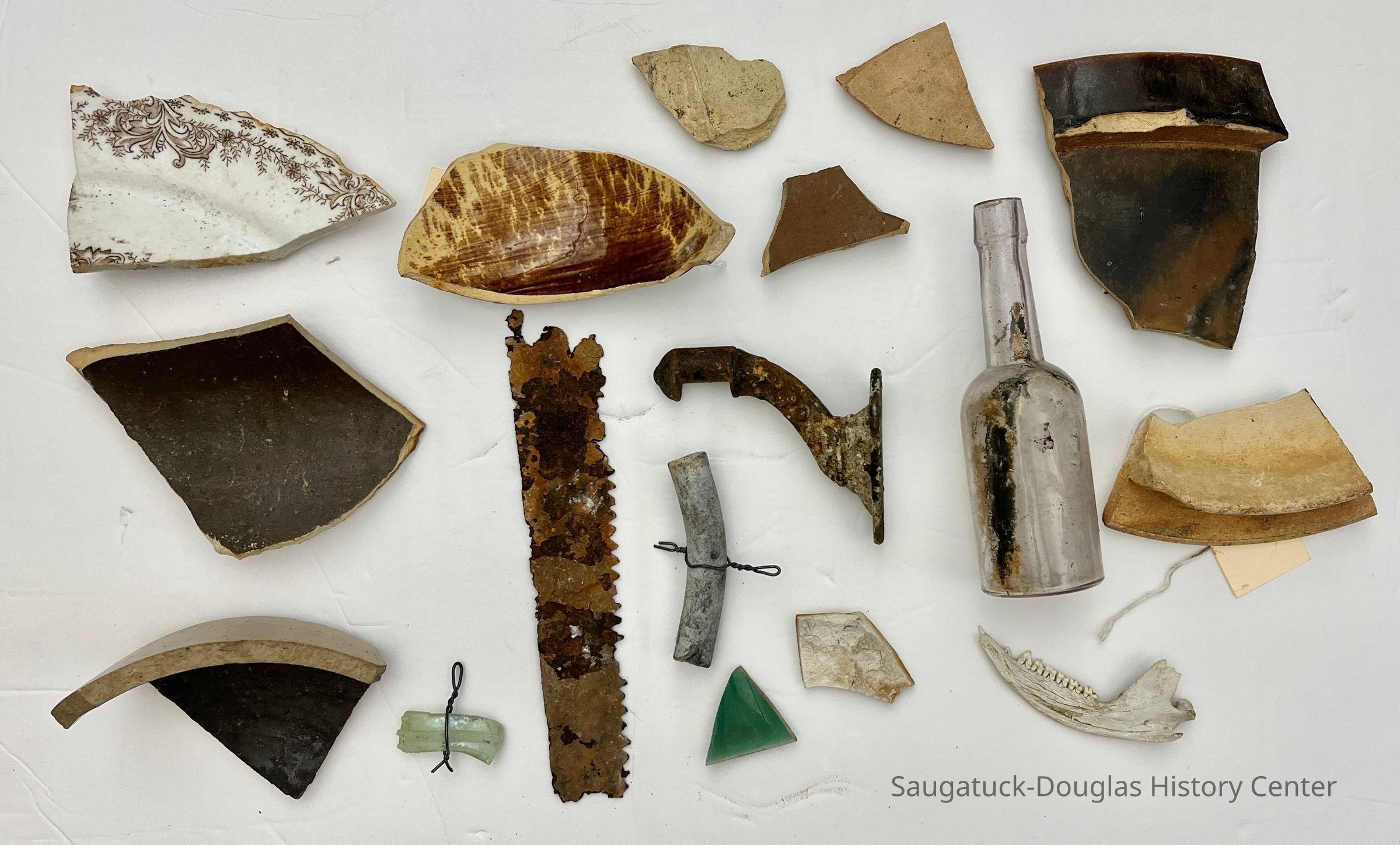 Eleven pottery shards, a partial saw blade, a glass fragment, a metal (possibly lead) fragment, a metal bracket, a glass bottle and half a small animal jawbone.
