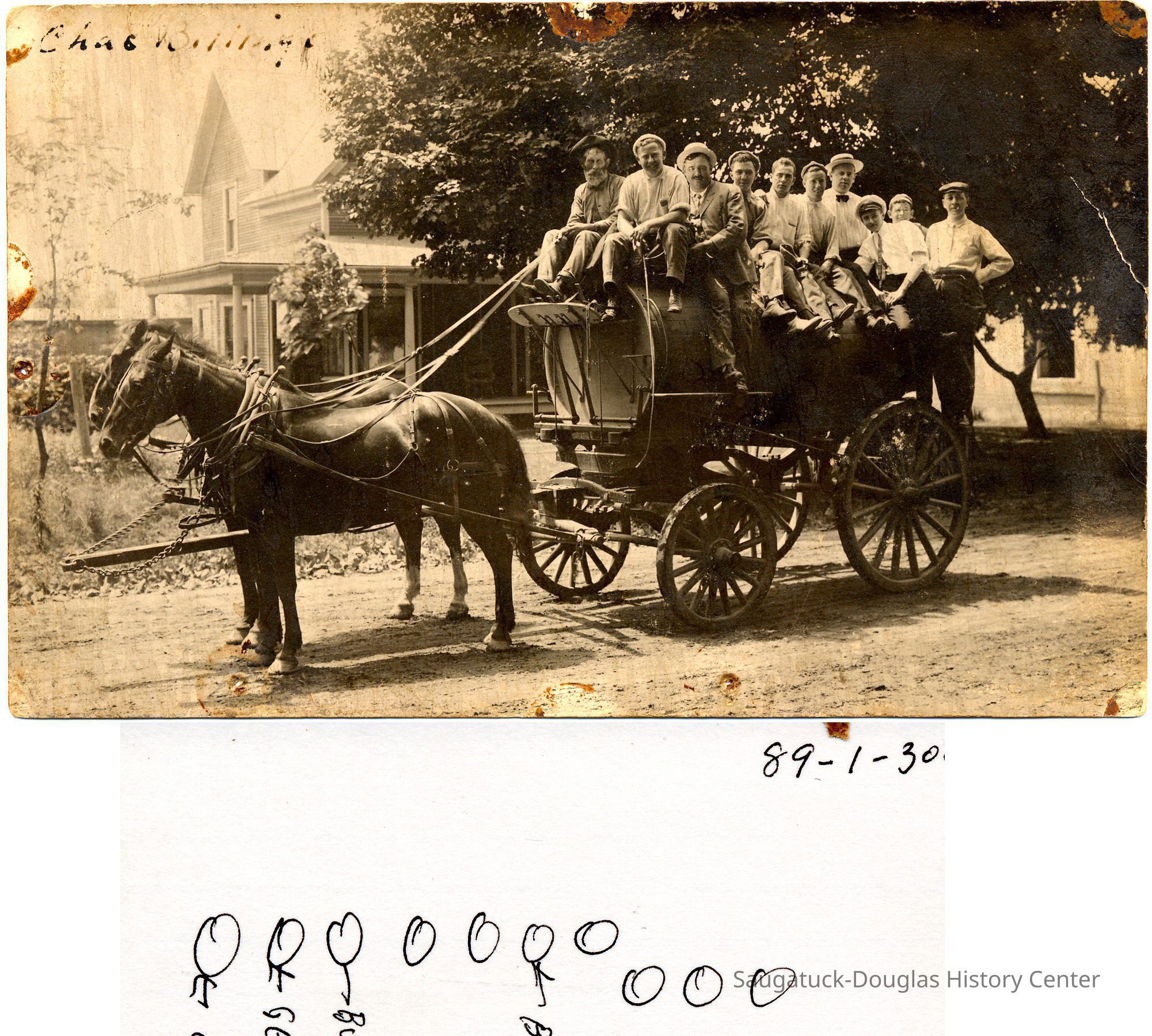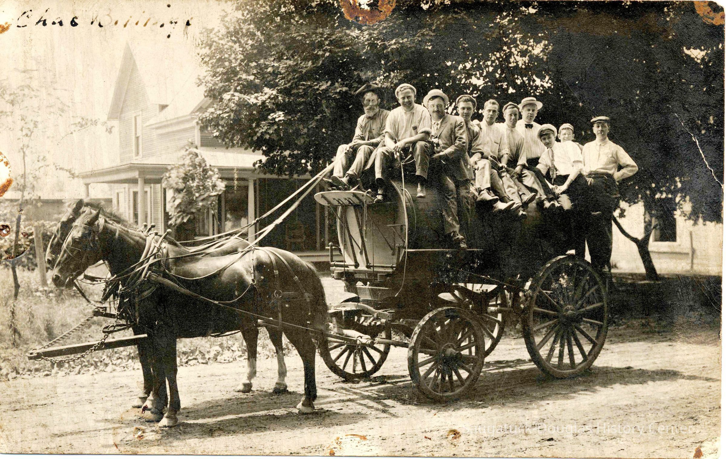 Two horses are harnessed to a water tanker wagon that has a crowd of people riding on top. Written on the upper corner of the print is "Chas. Billings"