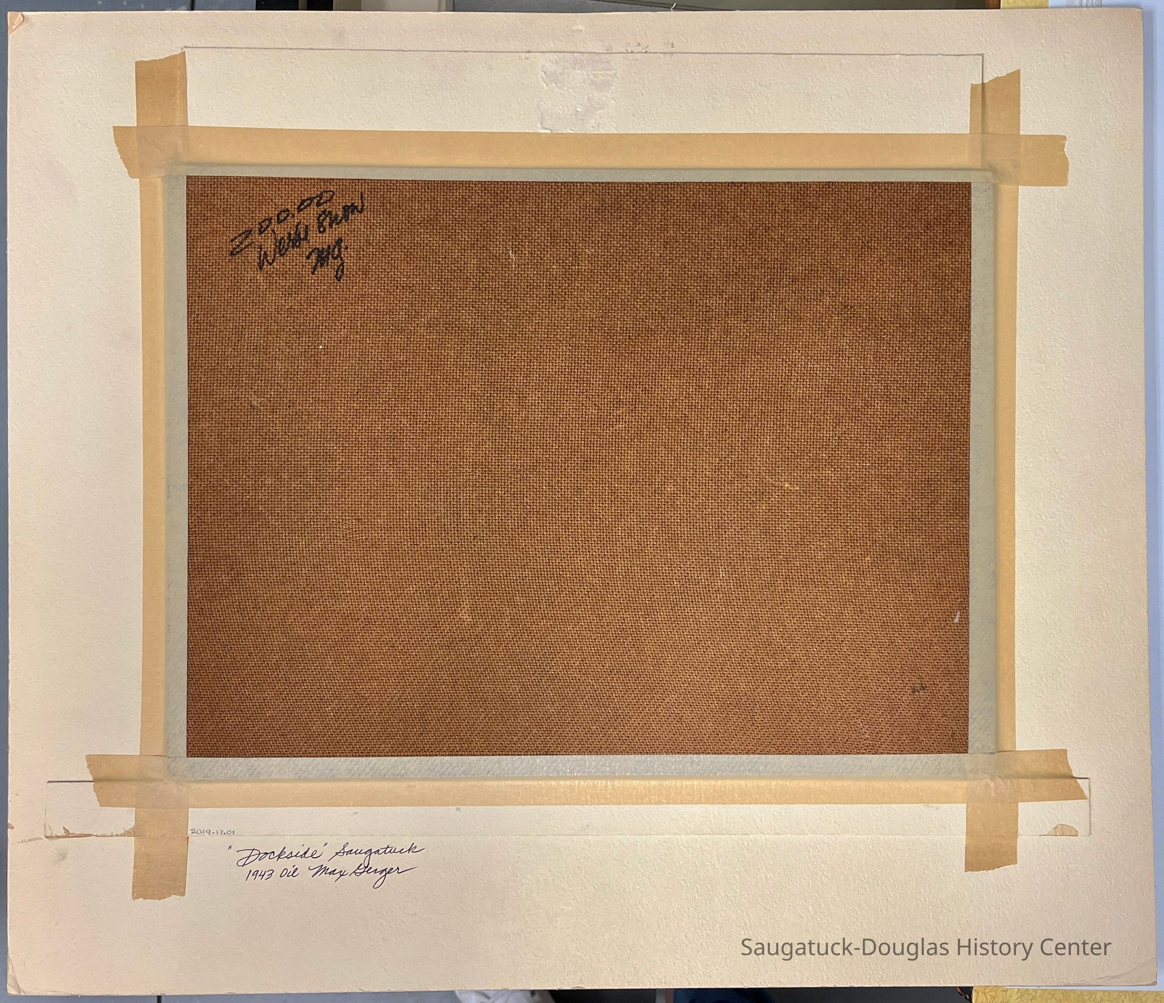 Matted but unframed oil painting of a dock and part of a building 16"x12" by Max Gerger, 1943