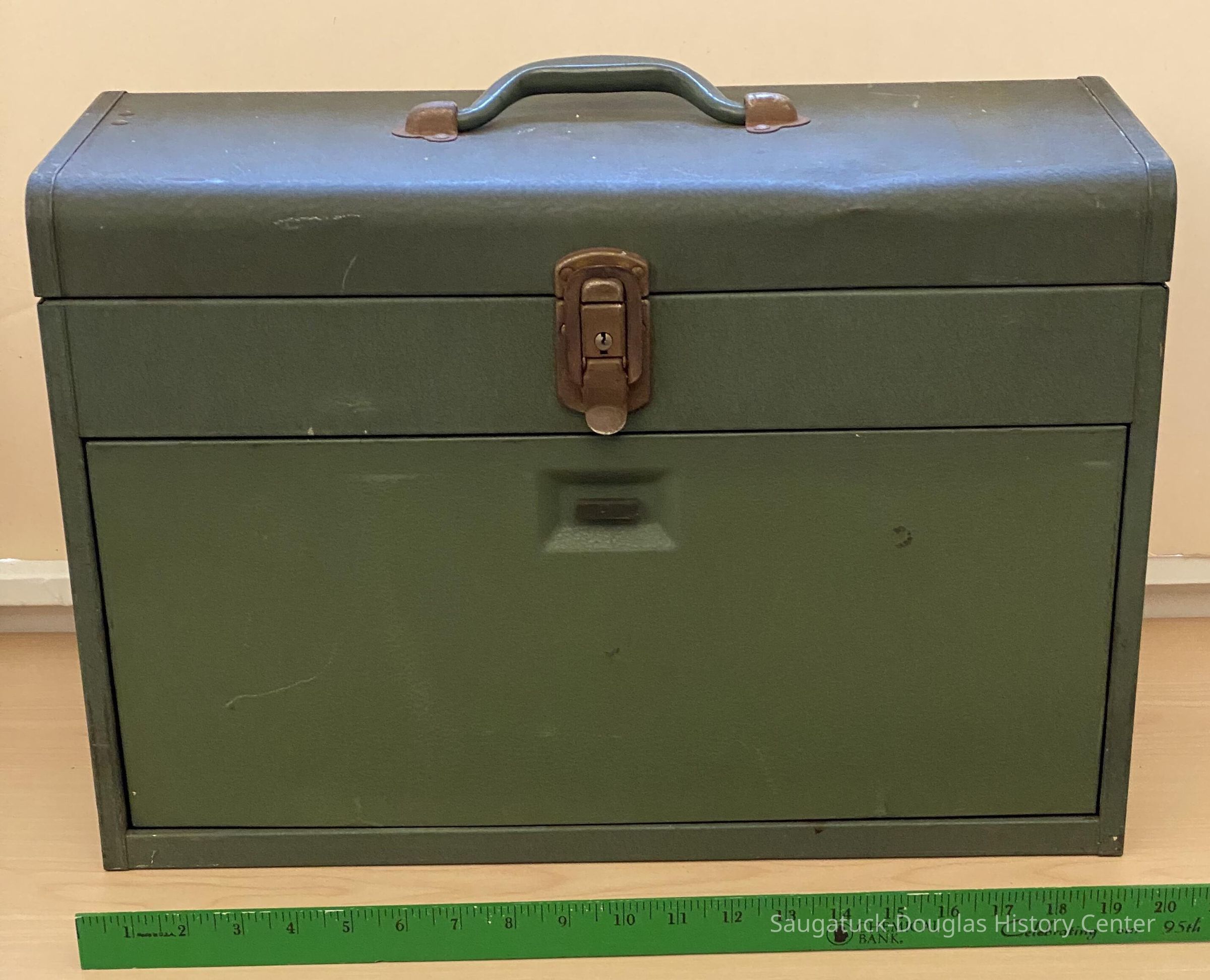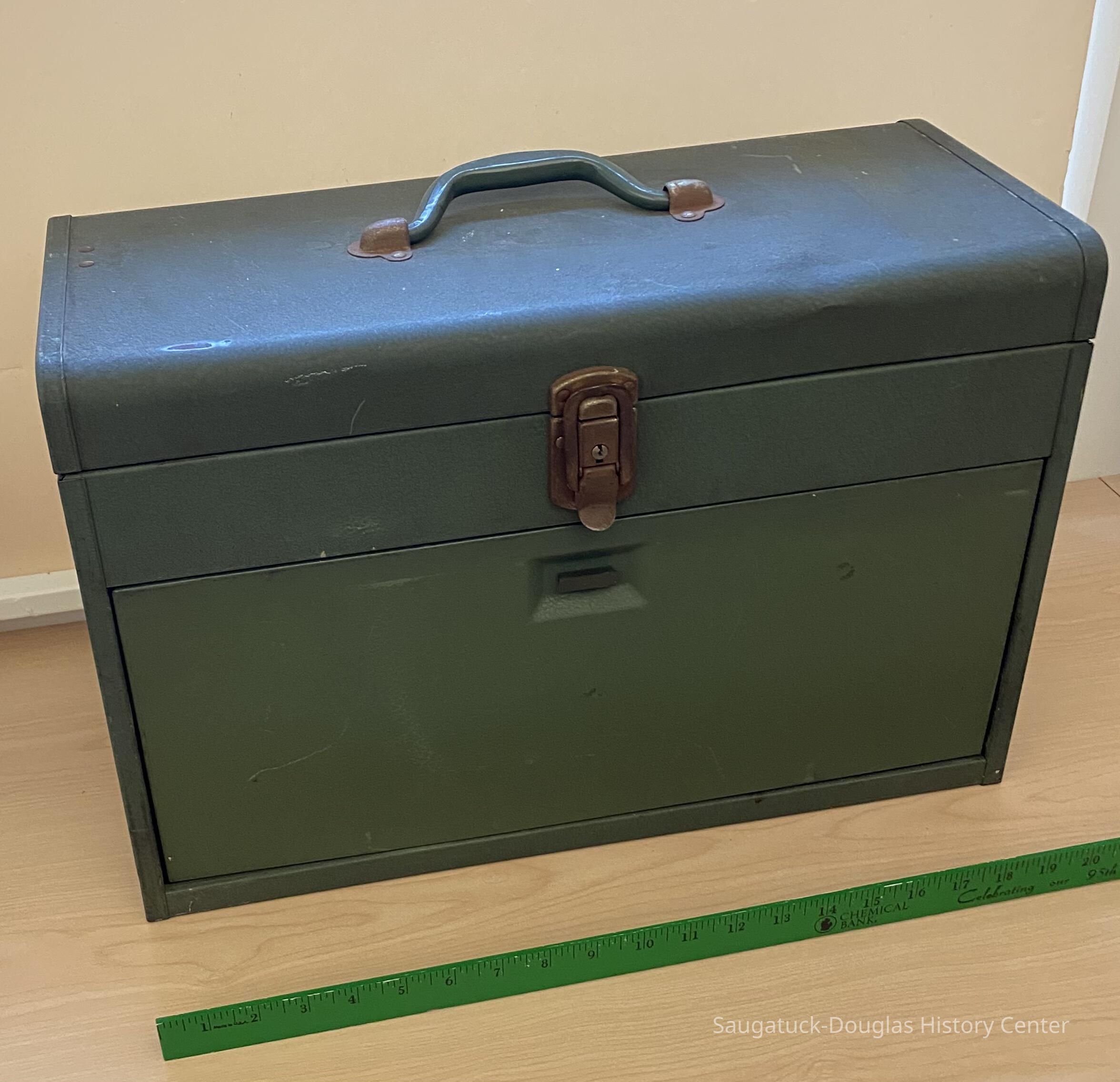 A metal toolbox and sewing kit designed for puppet making. This kit contains the materials used by Burr Tillstom for creating and repairing his puppets. It is a sturdy green metal chest, the type of tool chest used by mechanics. It is 18 inches wide, 16 inches high and consists of a top compartment with three slide out drawers.