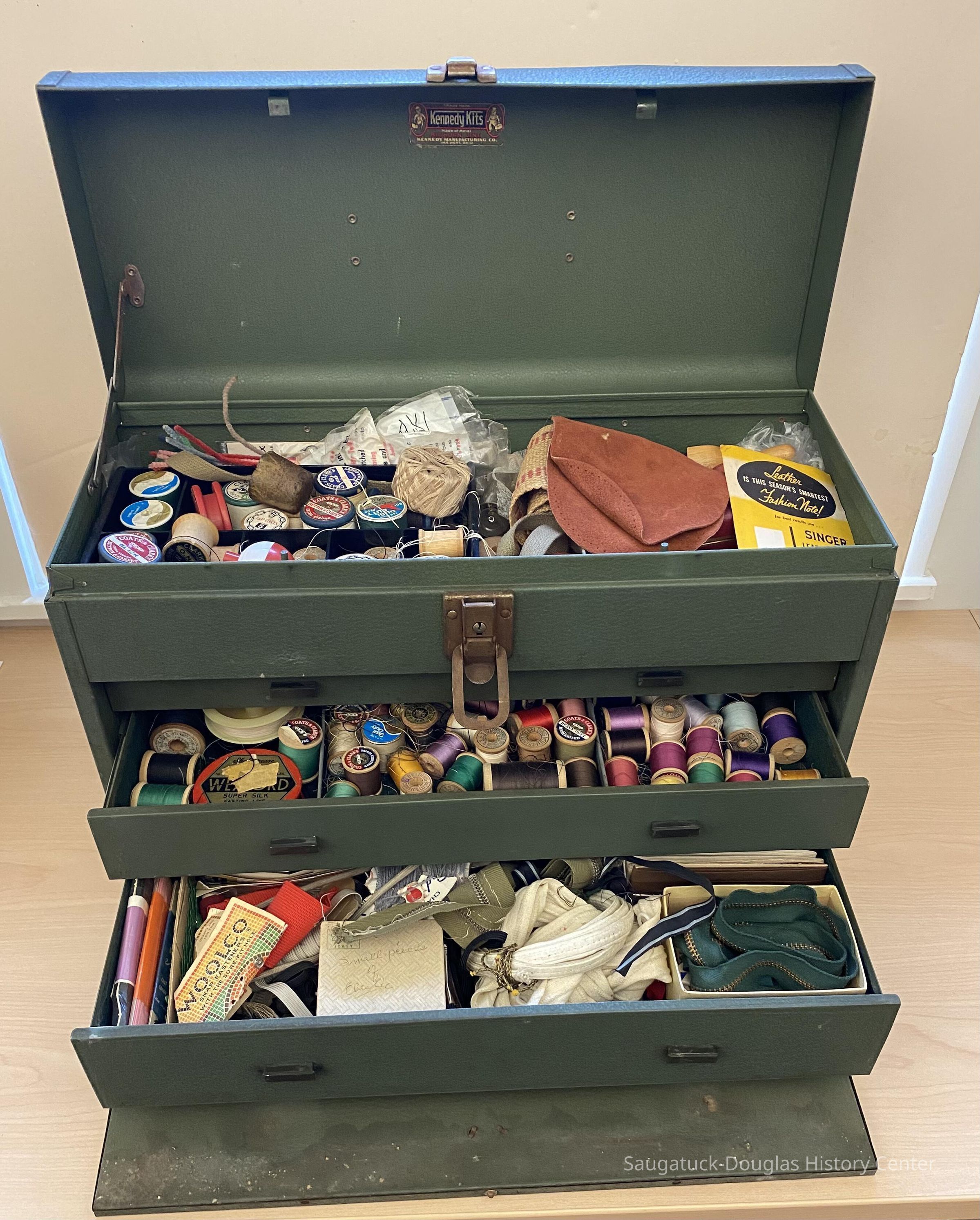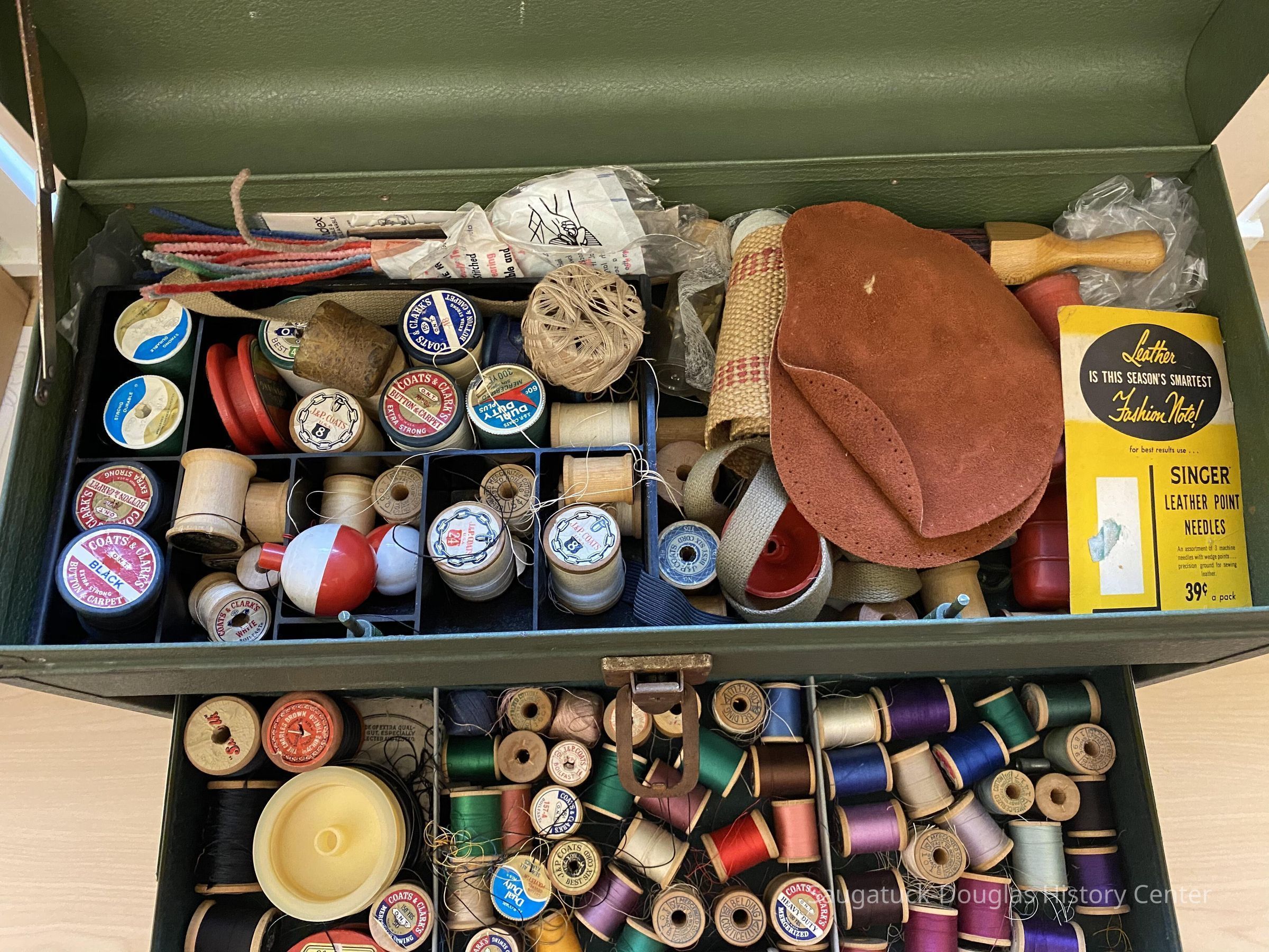 The top compartment contains spools of thread, sewing needles, pipe cleaners, measuring tapes, a brush, snaps, pipe cleaners, and some fishing bobbers.