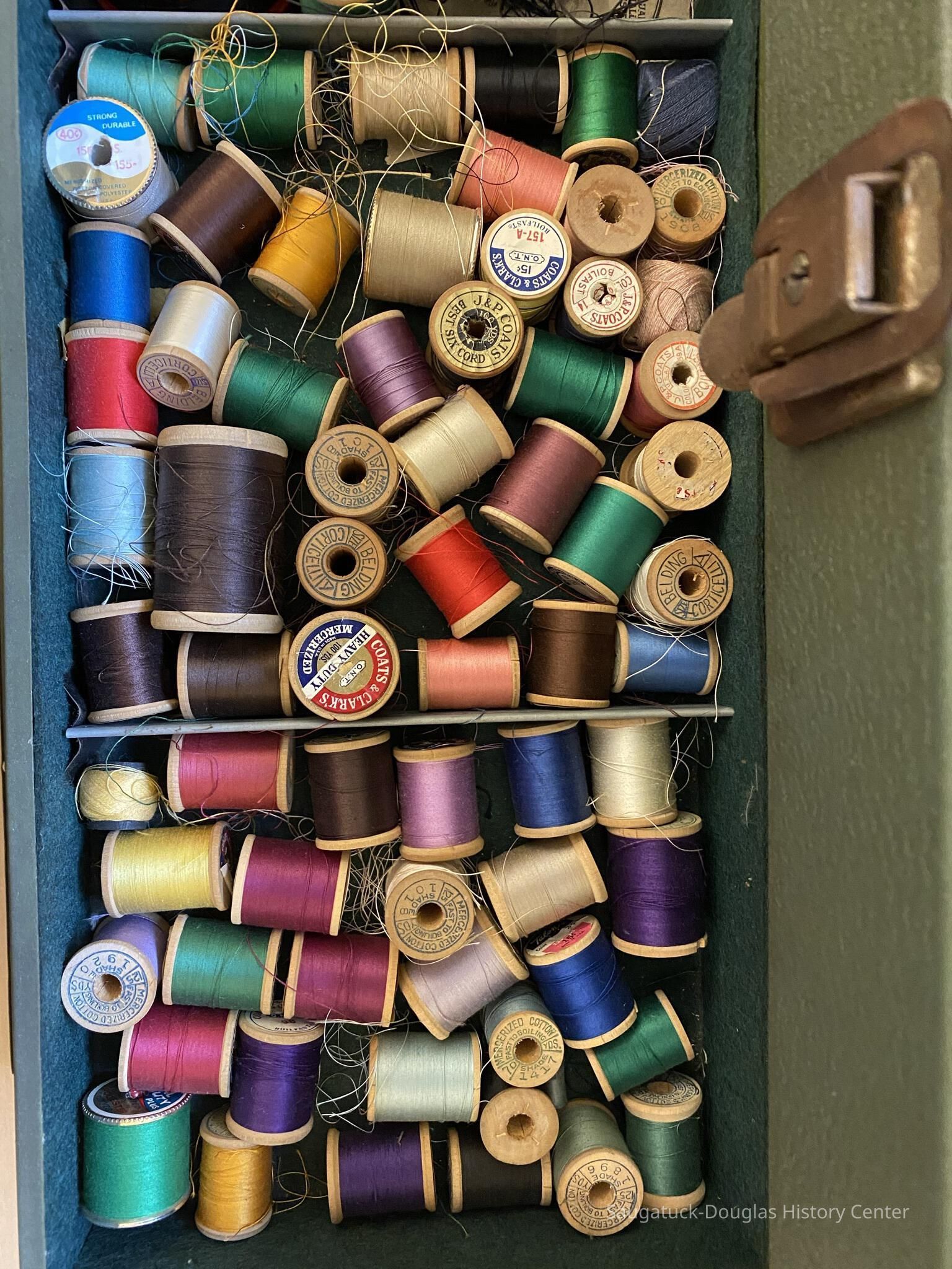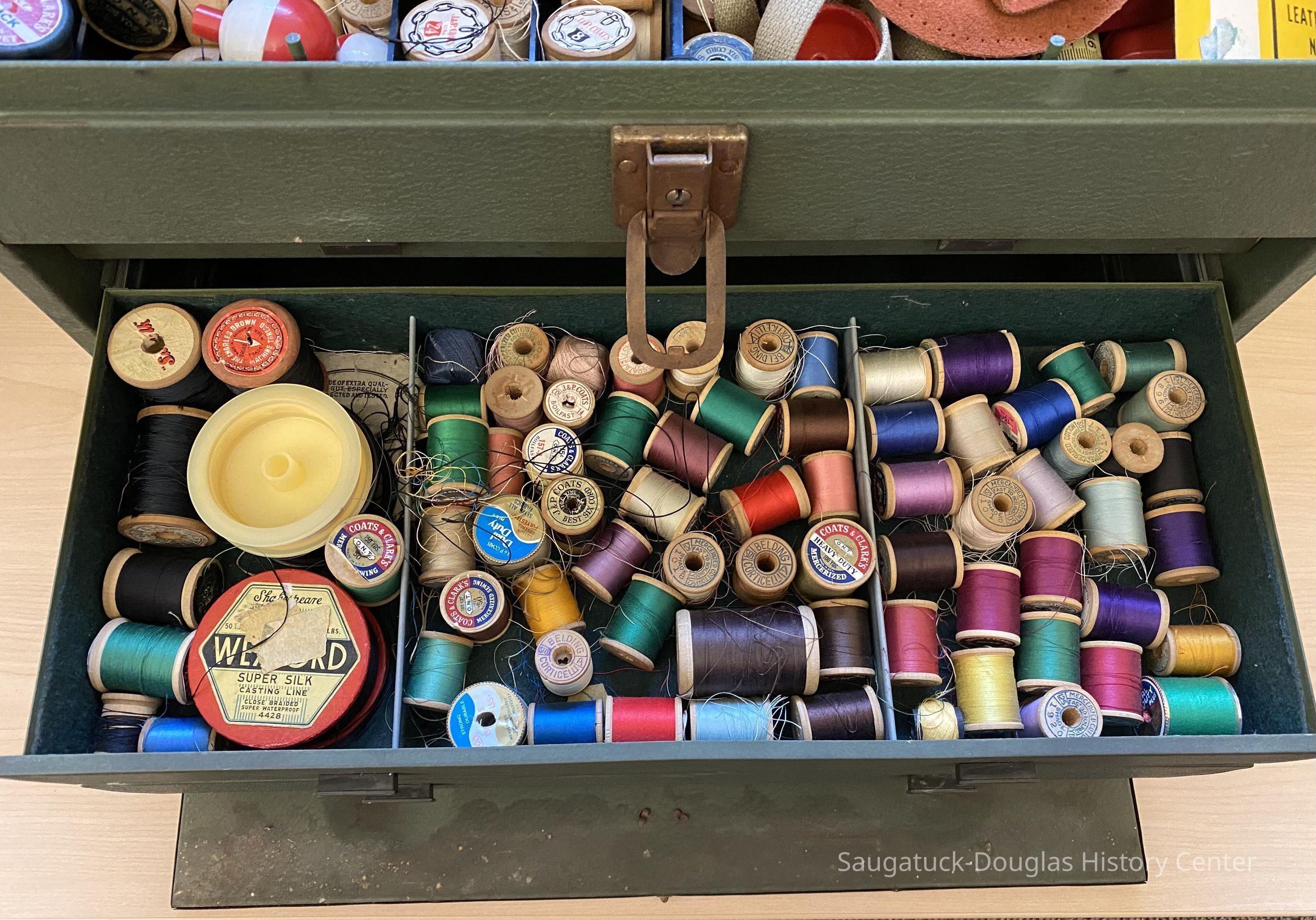 The second drawer contains approxamayely 100 wooden spools of silk and cotton threads, and two spools of fishing line.