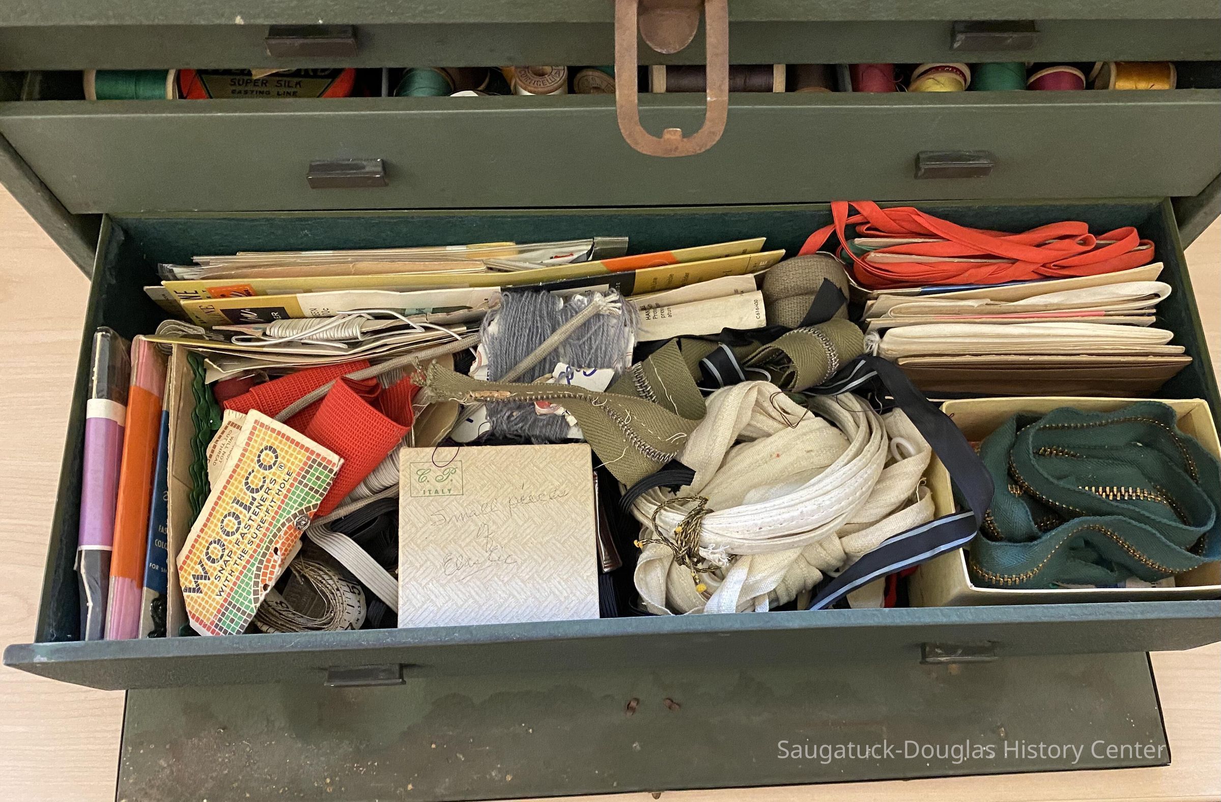 The third drawer contains about twenty packets of bias tape, eight zippers, round elastic string, and white metal zipper tape.