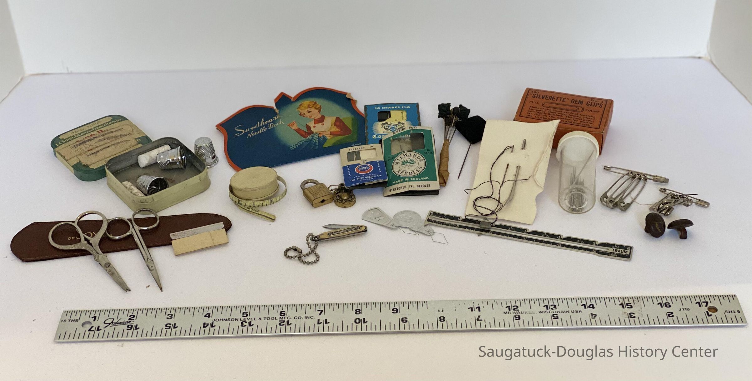 The first drawer contains two small scissors, thimbles, needles, safety pins, a tiny pocket knife, single edged razor blade and some hat pins.