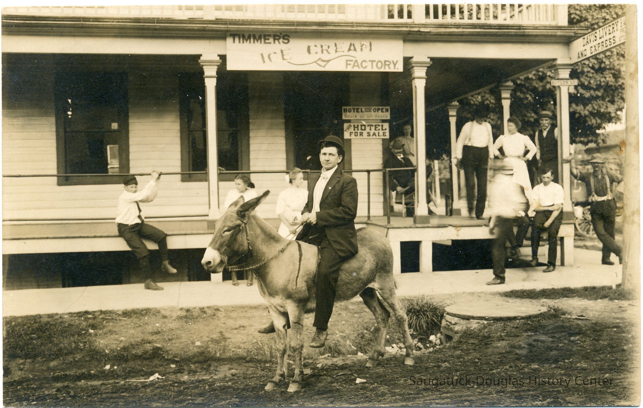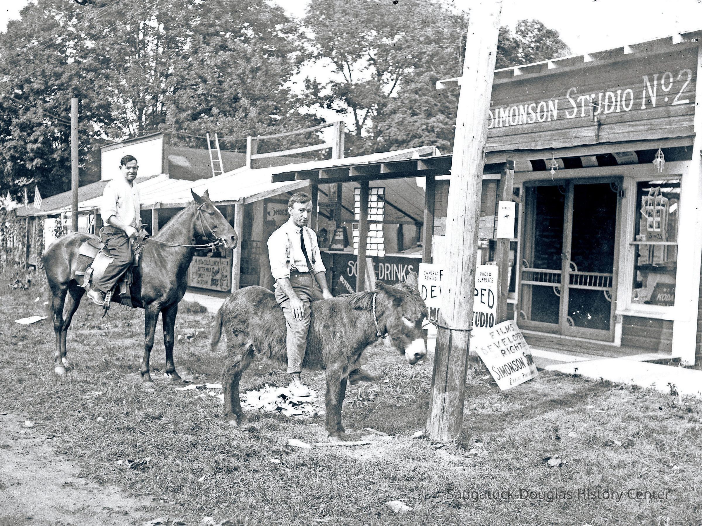 Dynamite was a series of stoic donkeys that were used by the Simonson studio as photo props. Cameramen would march around town offering to take a photo of visitors sitting on or near the animal. The visitor would later drop by the Simonson studio to pick up their print. According to Kit Lane in the Summertime exhibit, "Every donkey was named Dynamite."