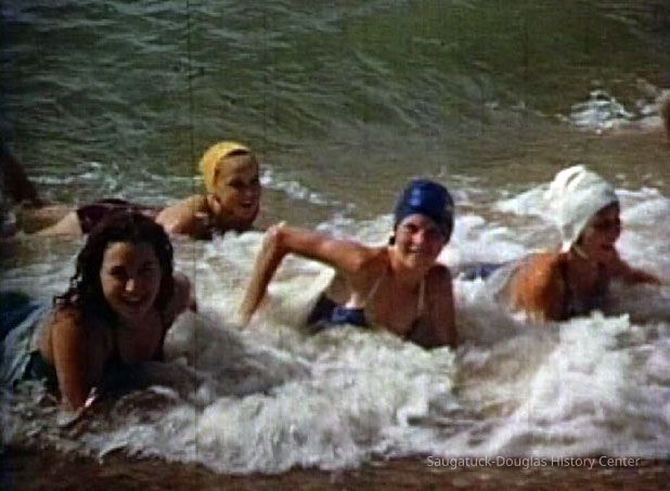 Narration mentions Florence Wright, Gertrude Ray and Florence Ray. Footage includes scenes at the Recreation Hall, fishing trip to the Ox-Bow lagoon, boats on the Kalamazoo rowing upriver to New Richmond to stay overnight and float back the following morning, making crafts like clay sculptures, candle holders, lanyards, sawing, swimming, playing in the beach, getting sun burnt, walking to dinner at Westminster lodge, playing baseball, and watching sun set.
