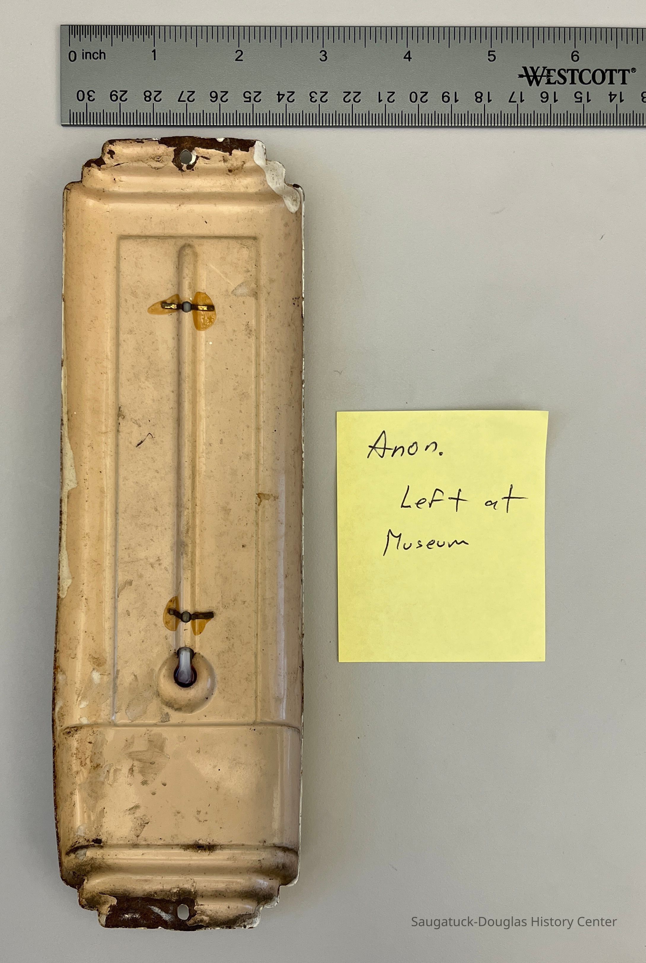 The thermometer frame is painted with pale yellow enamel paint and printed with a temperature scale that goes from -40 to 120 degrees Fahrenheit. The temperature is indicated by a glass tube filled with a red liquid that is held in place with two tiny metal straps. The bottom quarter of the thermometer has a flat surface for the application of the branding message in red paint.