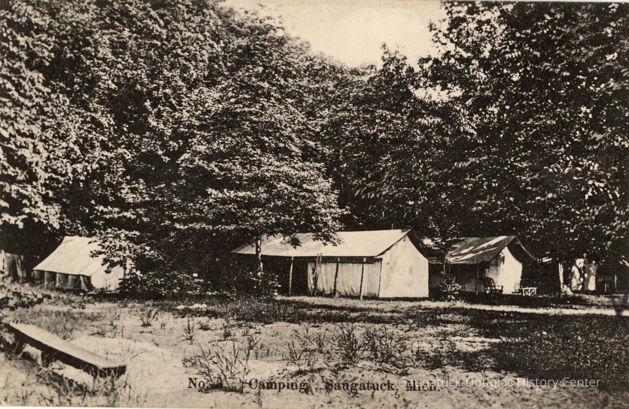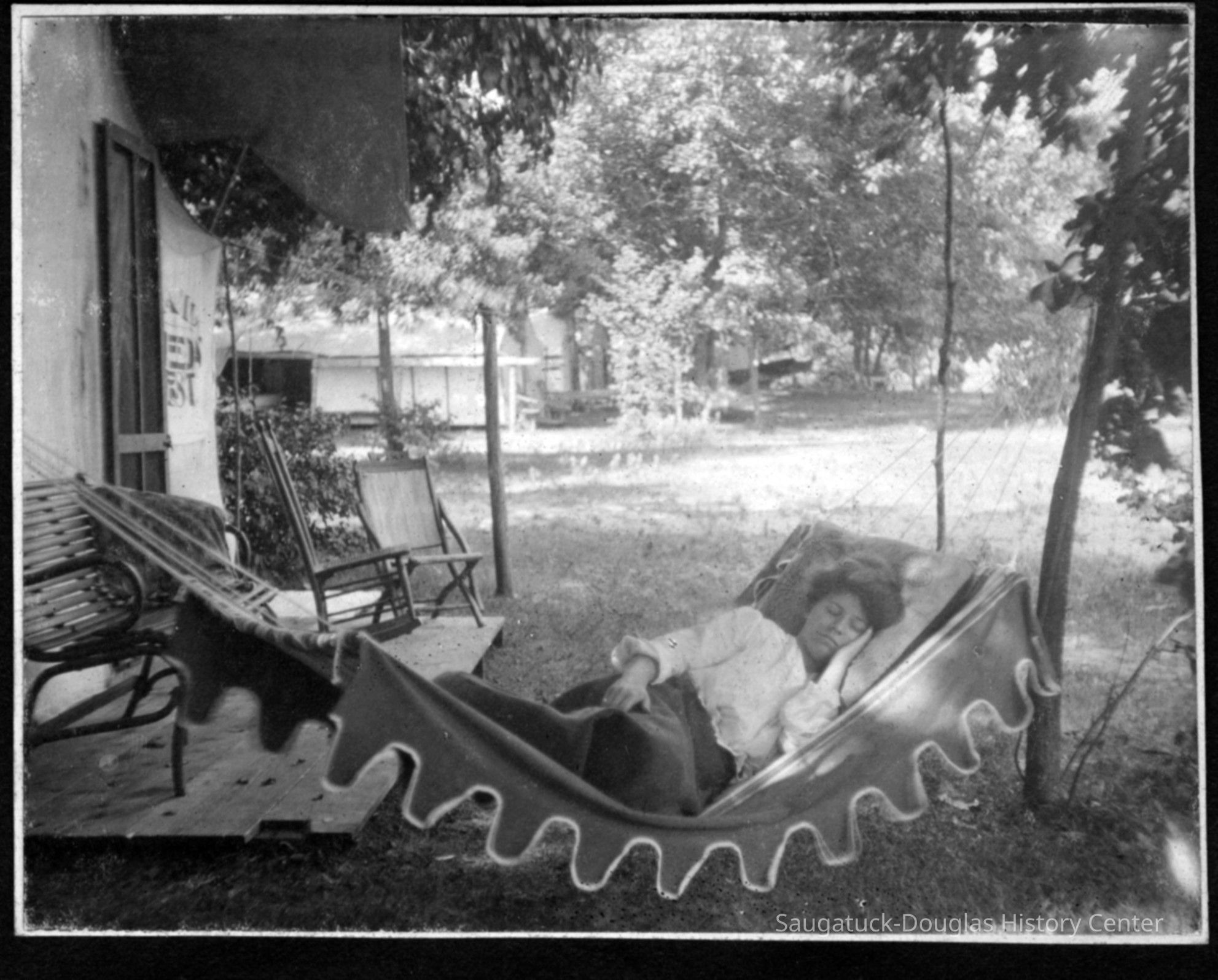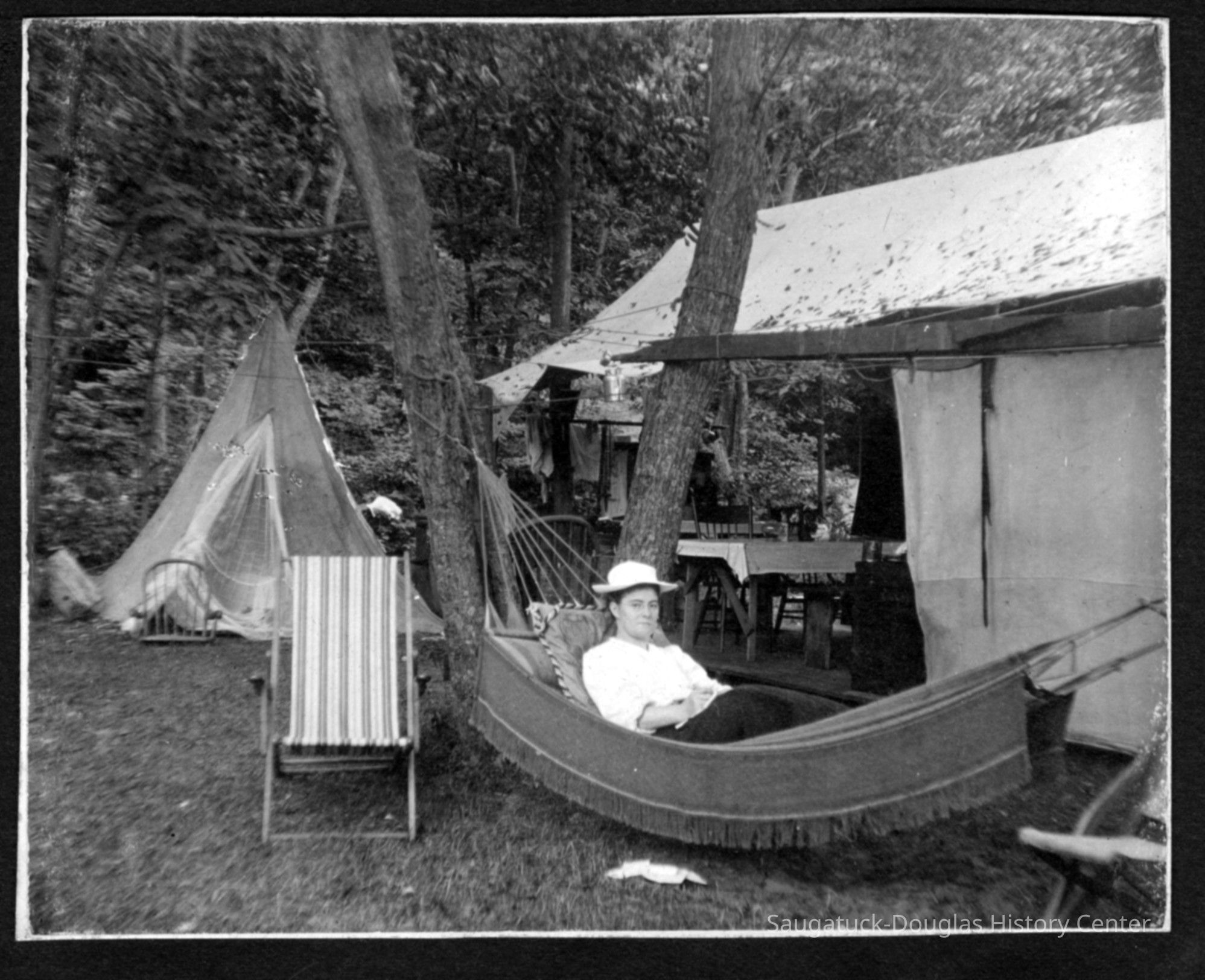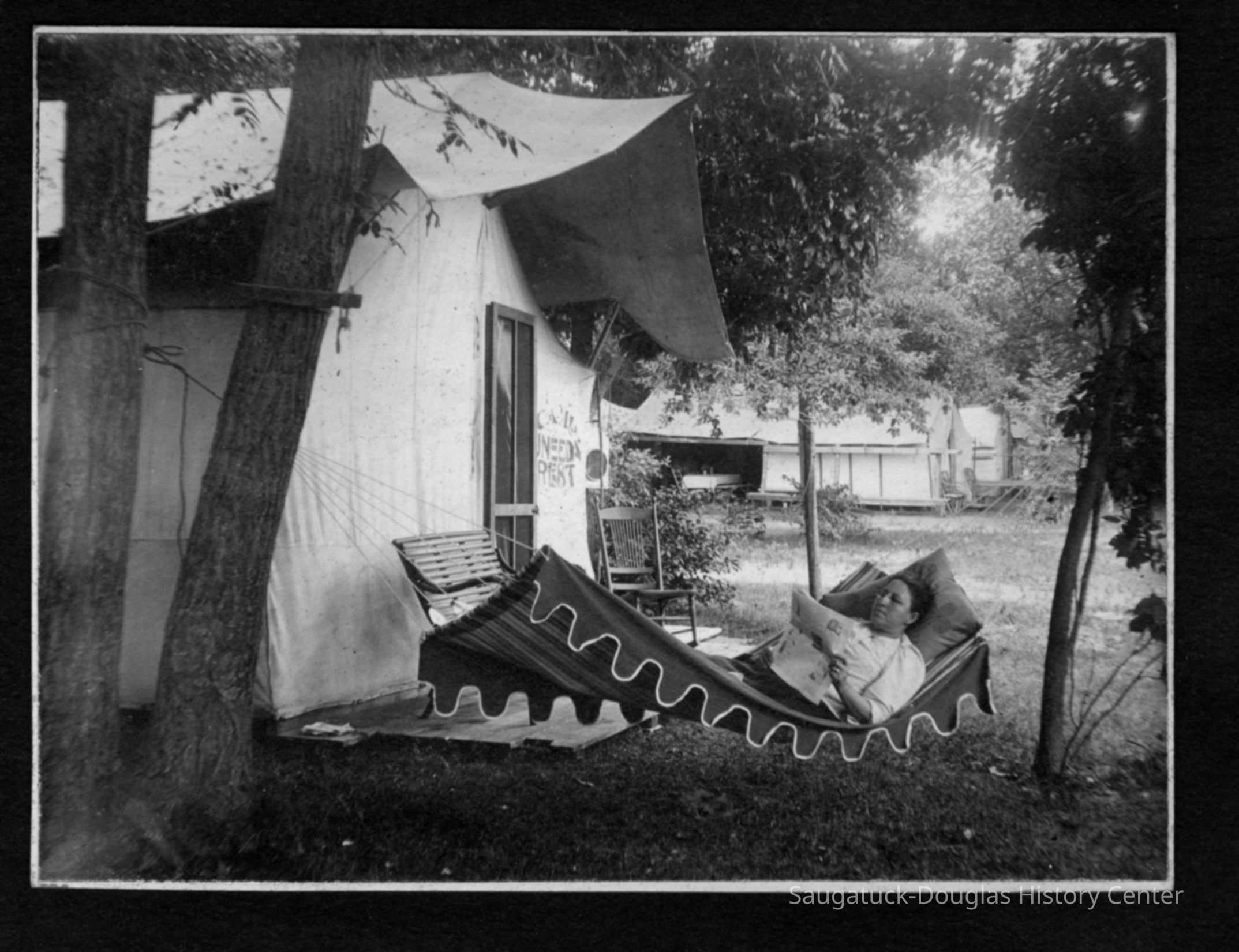 Digital scans of photos and postcards of people getting the rest they need at a tent camp located at the foot of Mt. Baldhead. Many of these scans were from a photo album loaned by Erik Peterson. The album was stamped as property of the Saugatuck Marine Museum and donated by Herman Hirner.