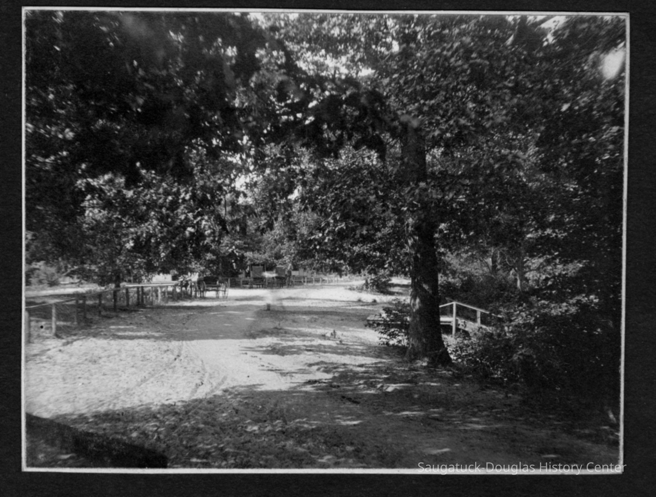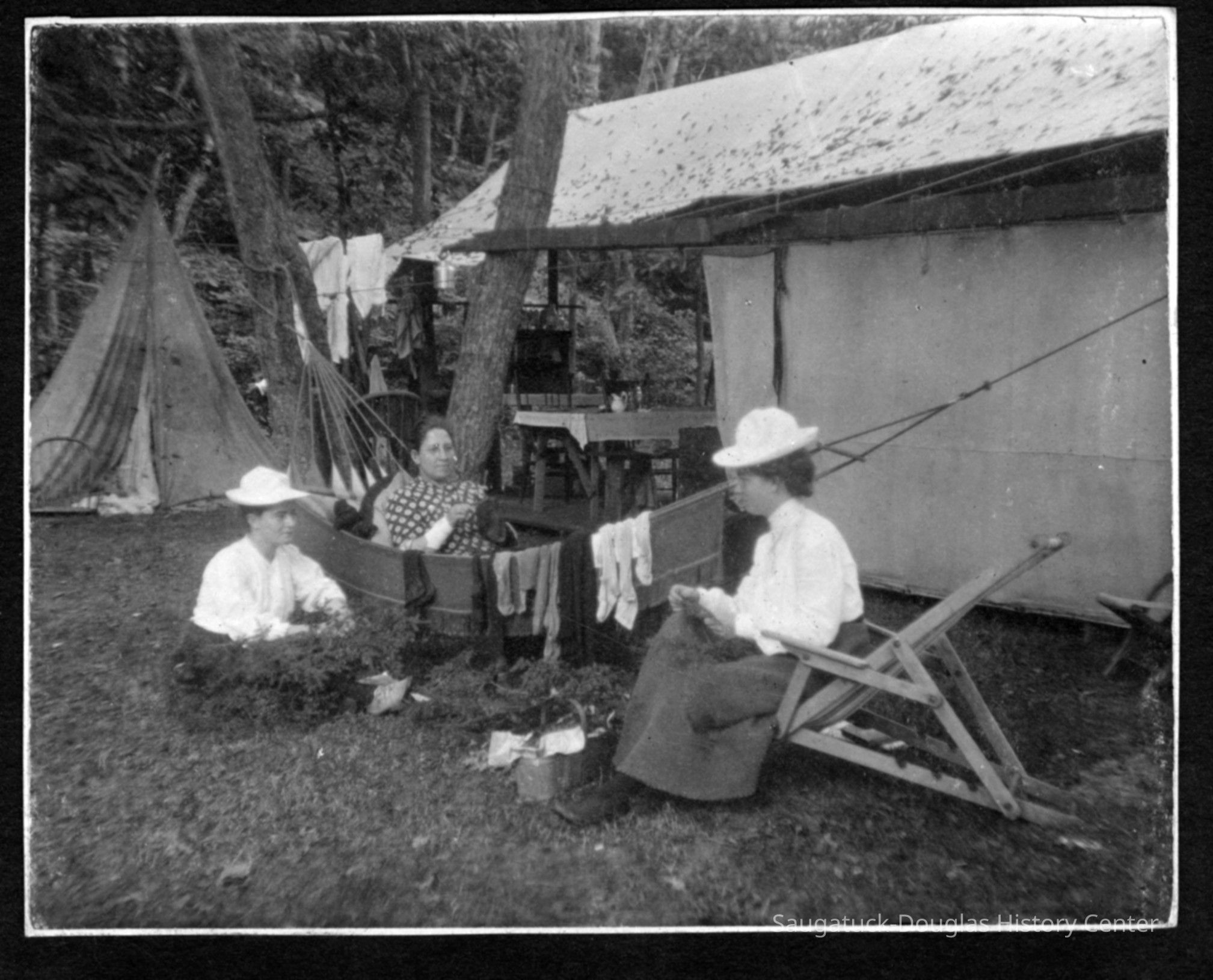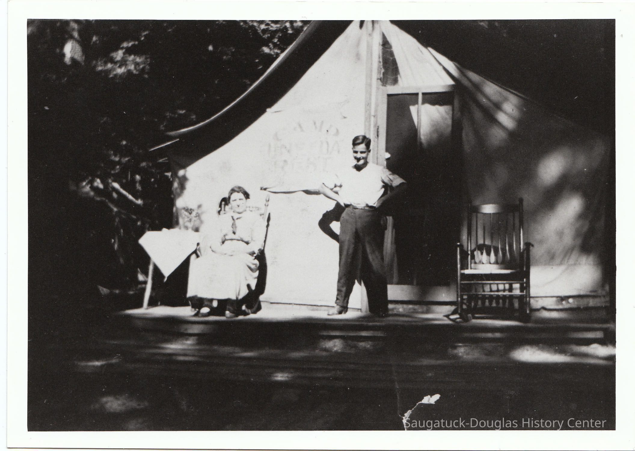 Digital scans of photos and postcards of people getting the rest they need at a tent camp located at the foot of Mt. Baldhead. Many of these scans were from a photo album loaned by Erik Peterson. The album was stamped as property of the Saugatuck Marine Museum and donated by Herman Hirner.