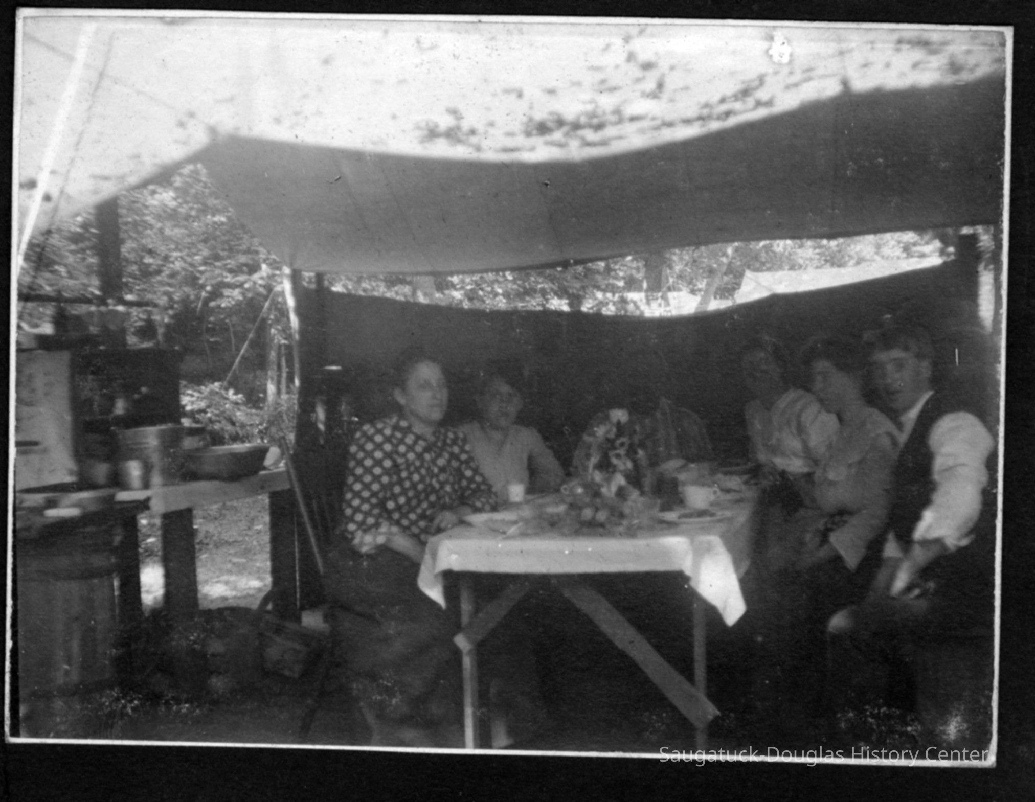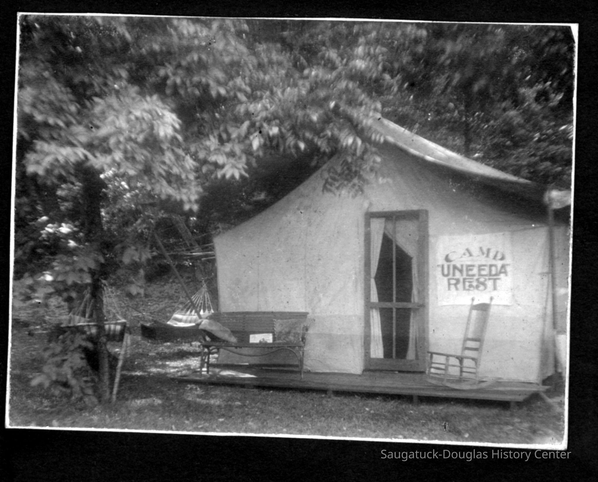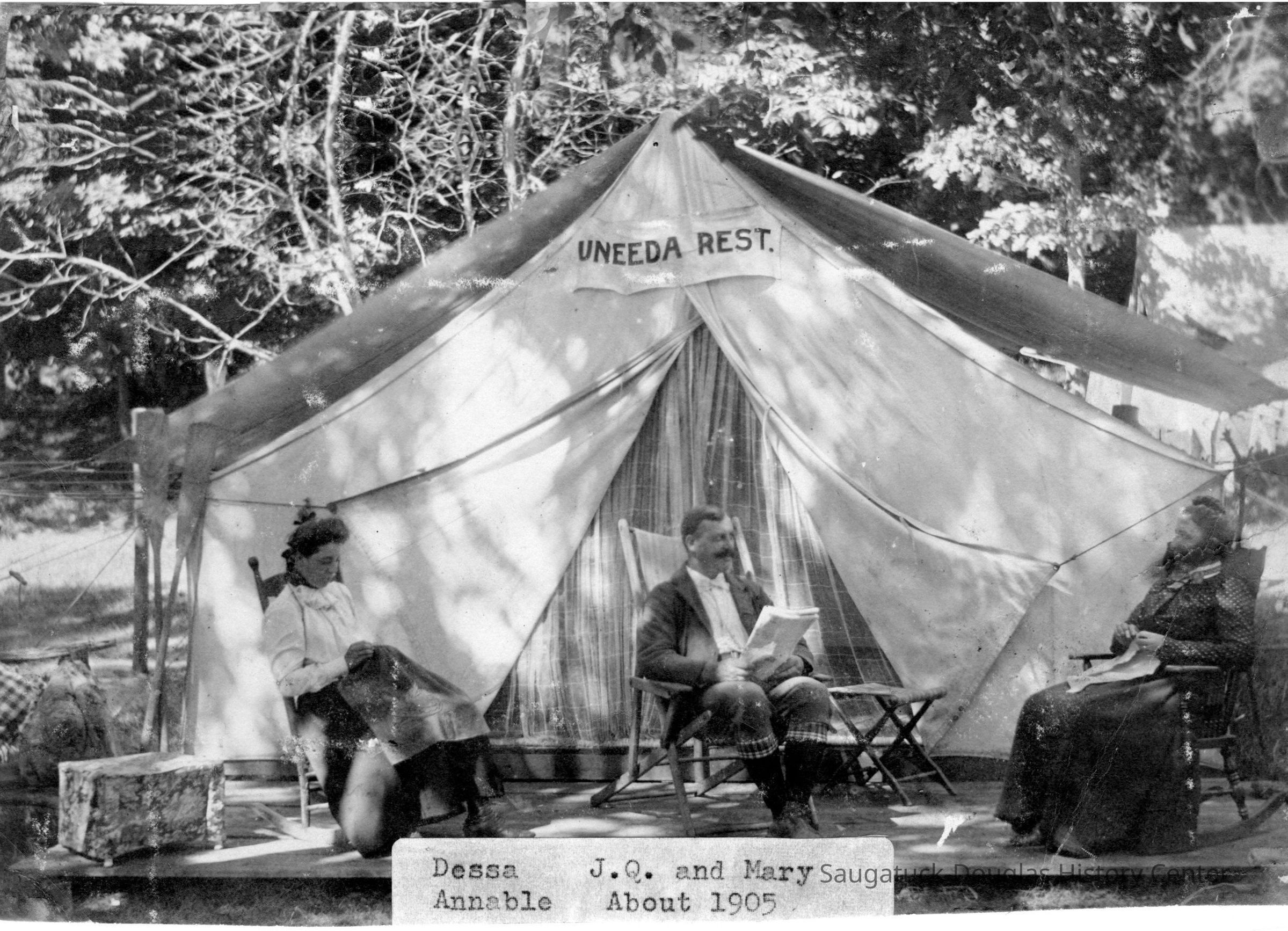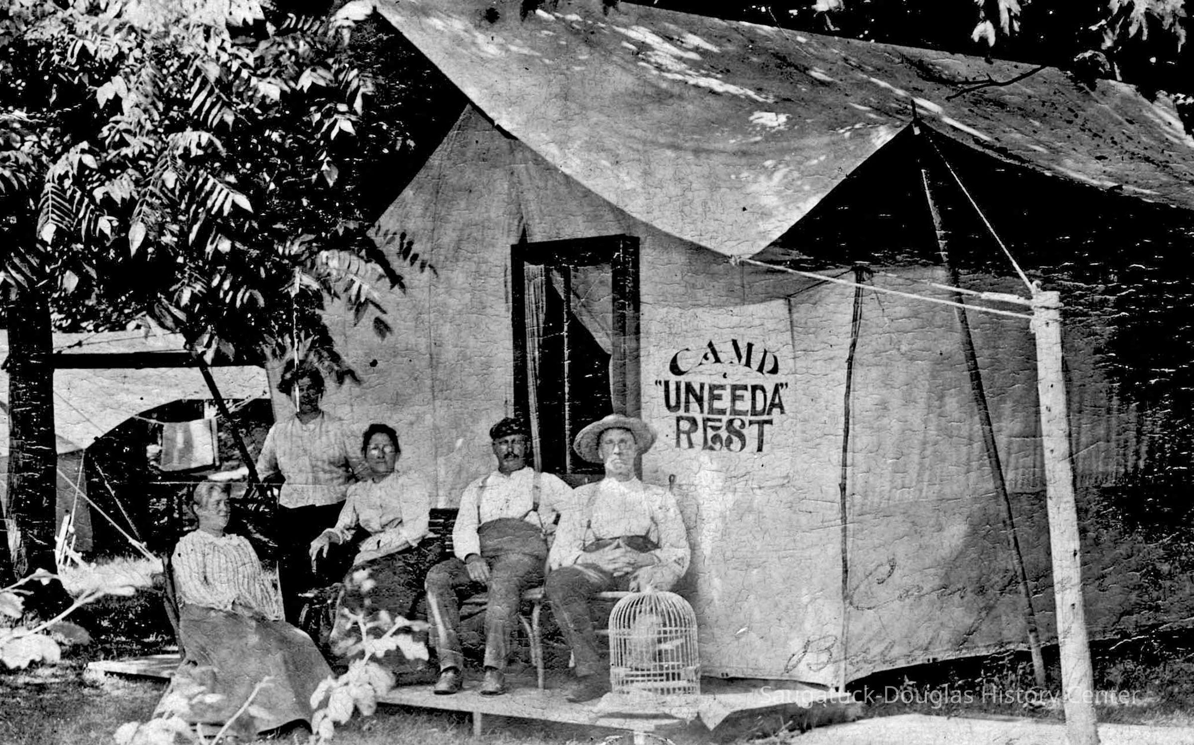 B/W photo of the Annable family tent dubbed "Camp Uneeda Rest," a pun on the name of a popular cracker at the time called a Uneeda Biscuit