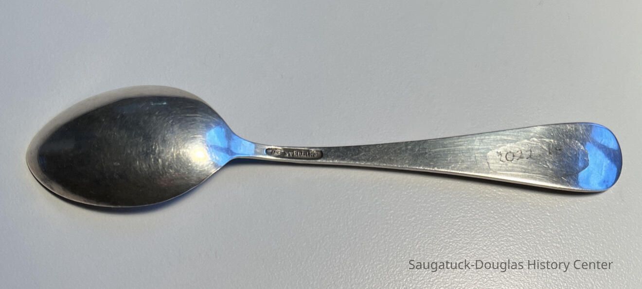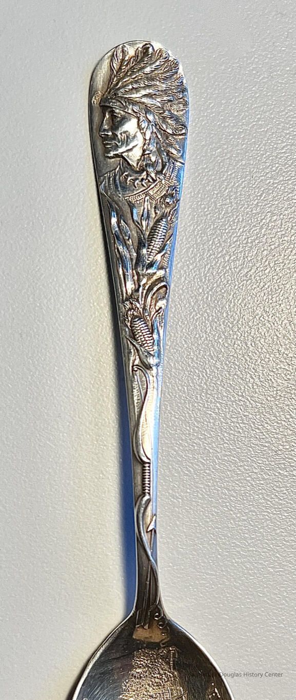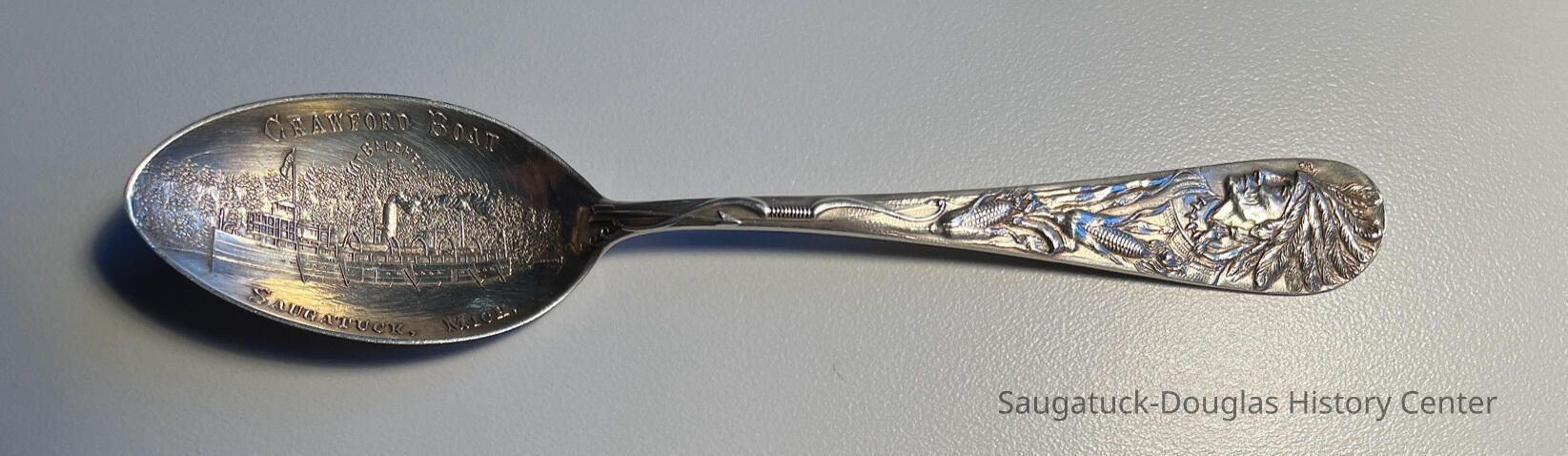 Silver spoon with the handle end decorated with a profile of a Native American/Indian man with feathered headdress and necklaces The shaft of the handle features a stalk with two ears of corn and a bow and arrow. The bowl of the spoon is adorned a steamship on the Kalamazoo River with Mt. Baldhead in the background. Text on the spoon is "Crawford Boat", "Mt. Baldhead" and "Saugatuck, Mich."