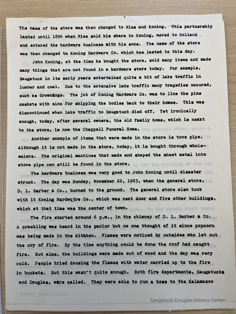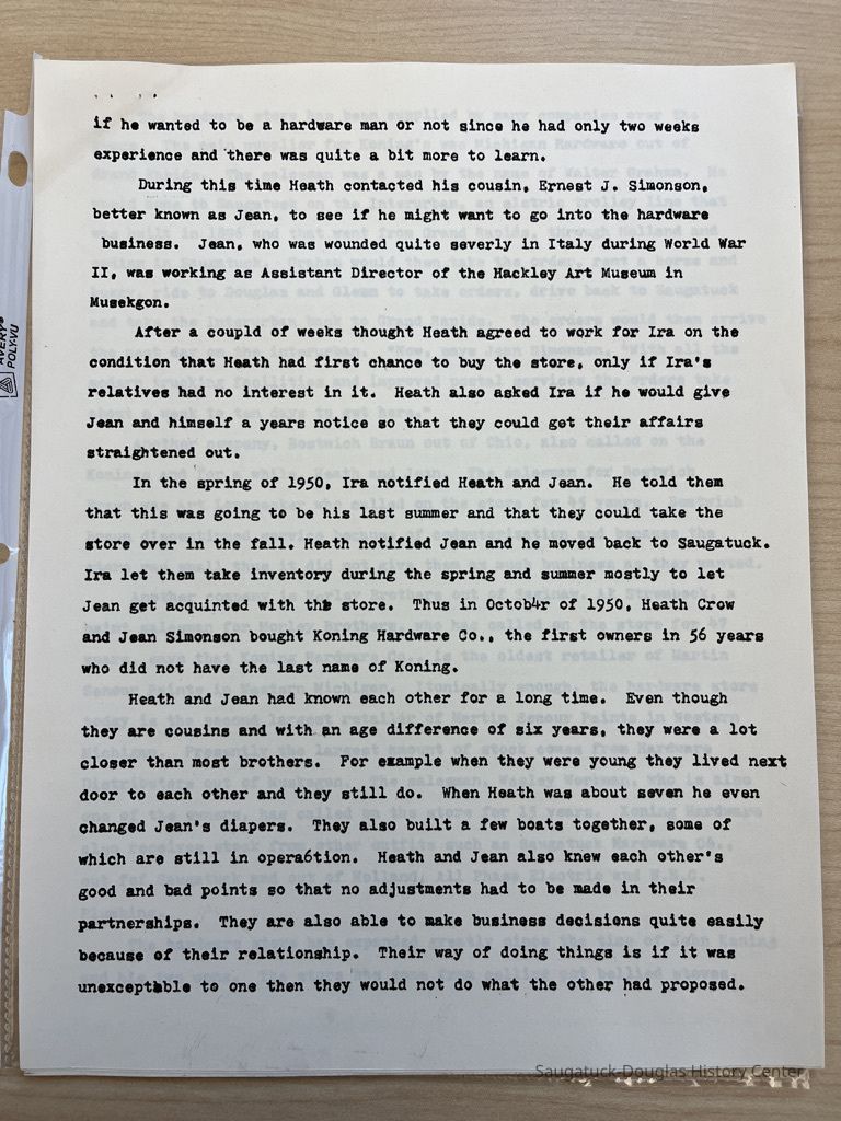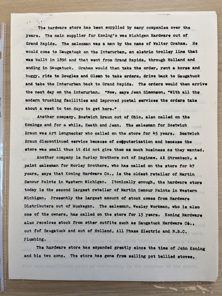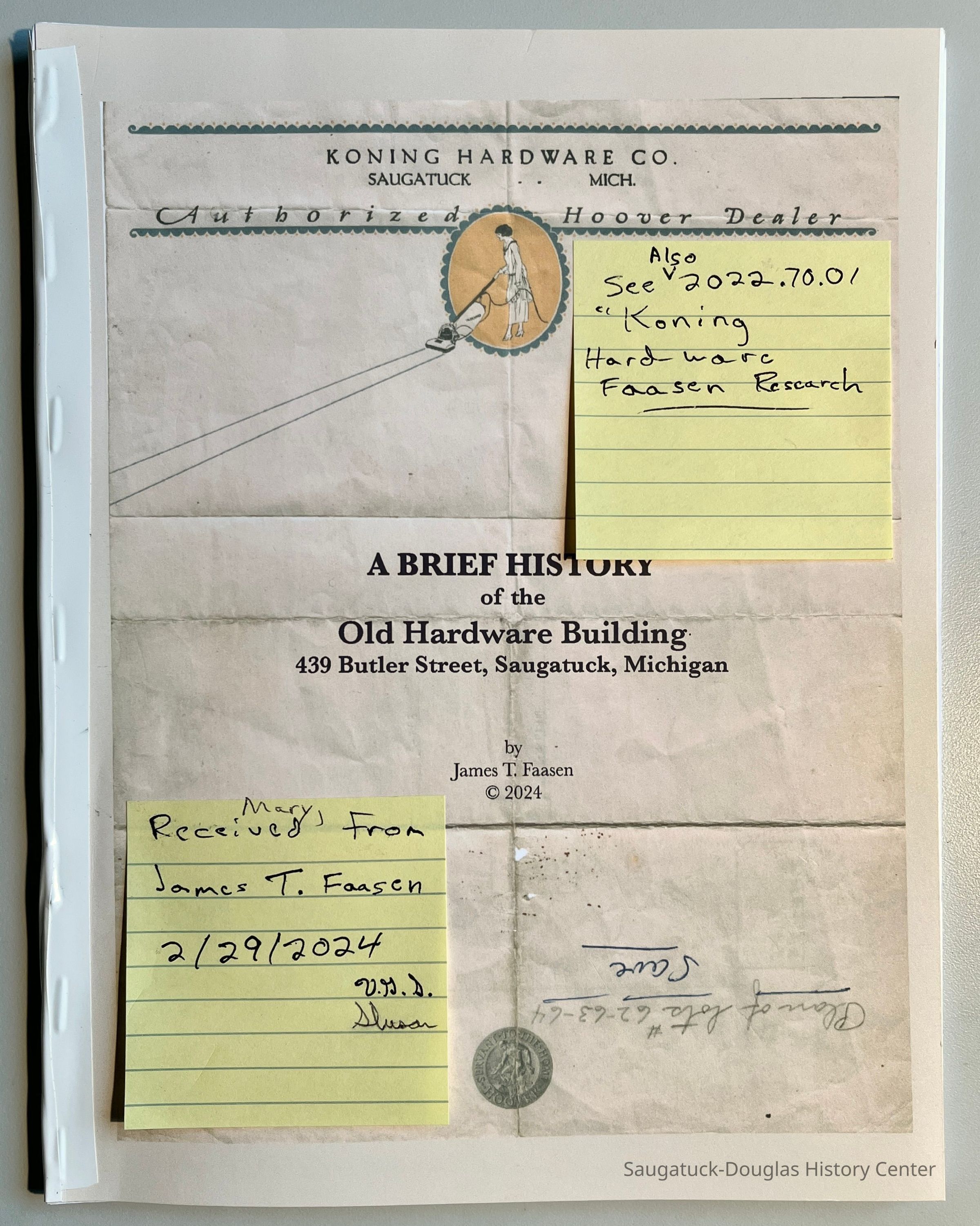 "The History of Koning Hardware Co. by Frederik H. Geerdink," was brought by Mr. Faasen to the Archive for photocopying and placement in the properties files.