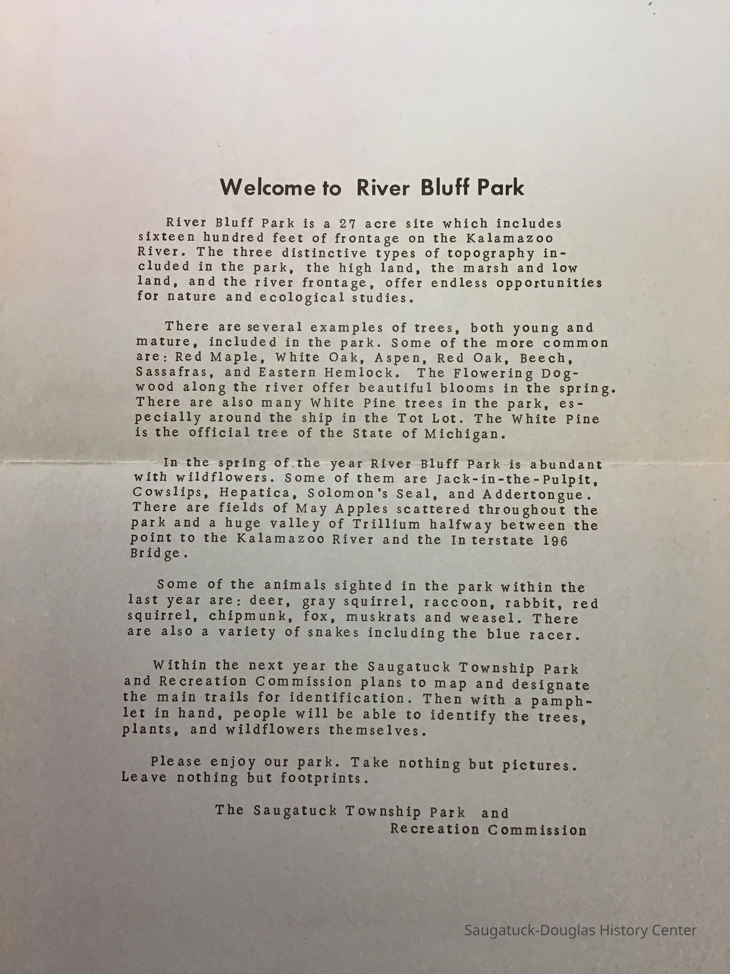Text written by Kit Lane for the 2009 Summertime exhibit: About 1971 citizens interested in parks found out that the highway department, had a 27-acre piece of riverfront which was leftover. They met and asked the township board to set up a township park commission. The board acquiesced on the condition that seven members of the group would accept appointment to the first park commission.” The newly-minted body applied for a grant to cover the design of River Bluff Park, and got a one-year millage on the ballot to cover the matching funds. They also built two other small parks and used federal revenue sharing funds to hire a caretaker and a recreation director. Saugatuck Township Park Commissioner was the first political office held by Patty Birkholz of Saugatuck Township, who, later served in the state legislature for 14 years, the maximum time allowable. As State Senator she was the first woman elected president pro-tem of the Michigan Senate.
