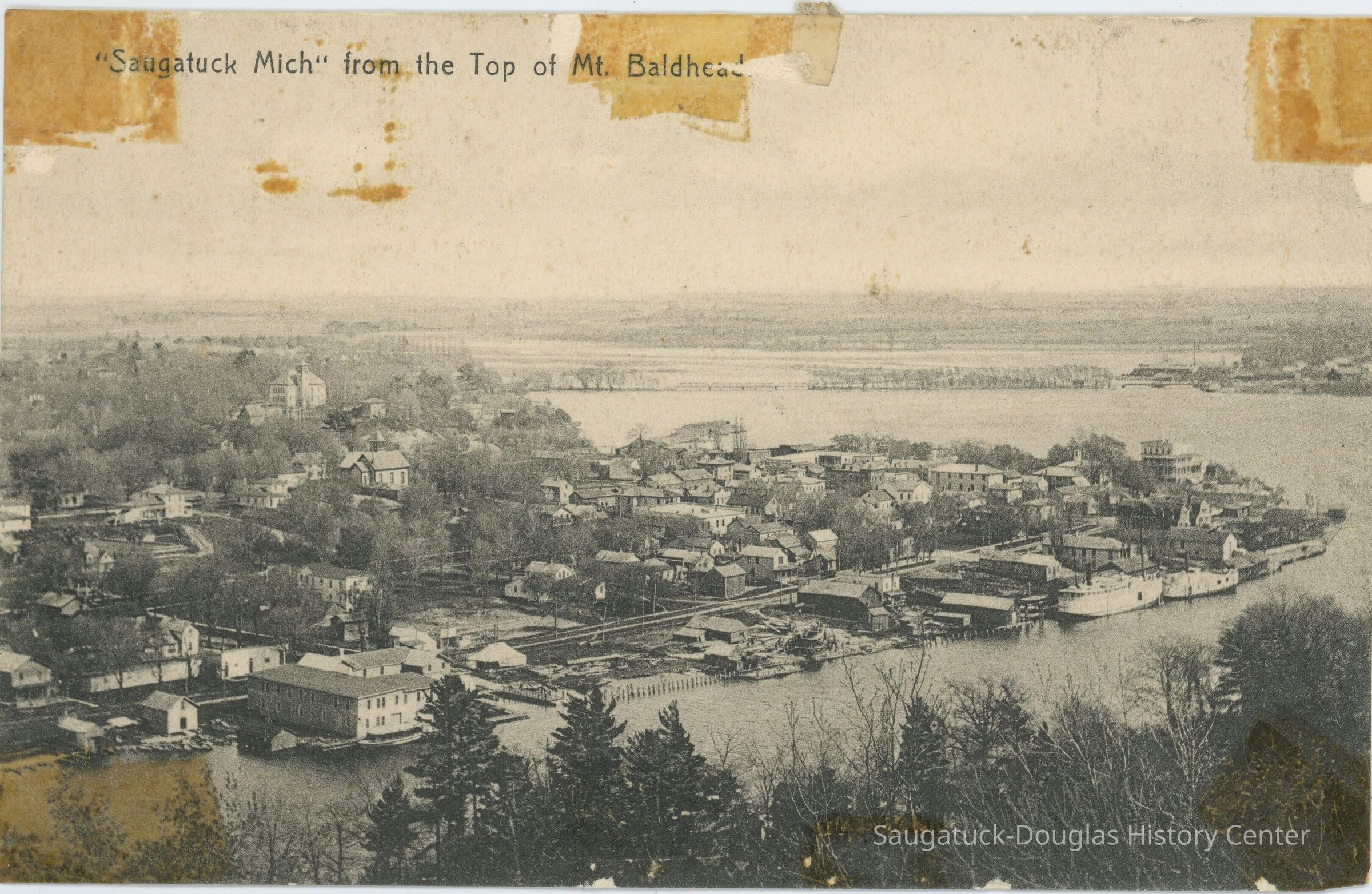 A black and white postcard showing a view of Saugatuck from the top of Mt. Baldhead. It is calm on the Kalamazoo River.