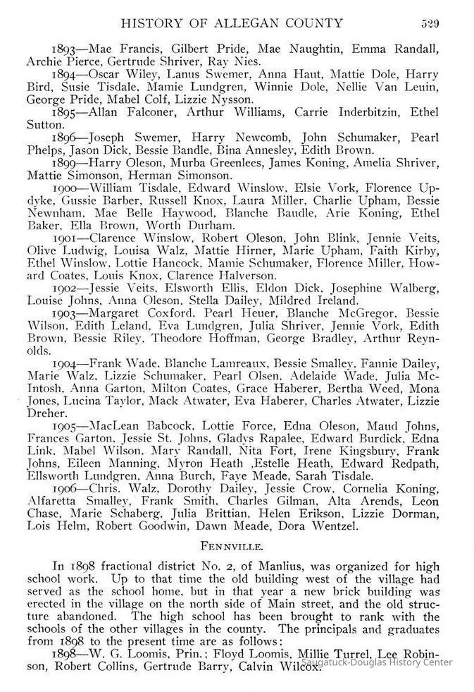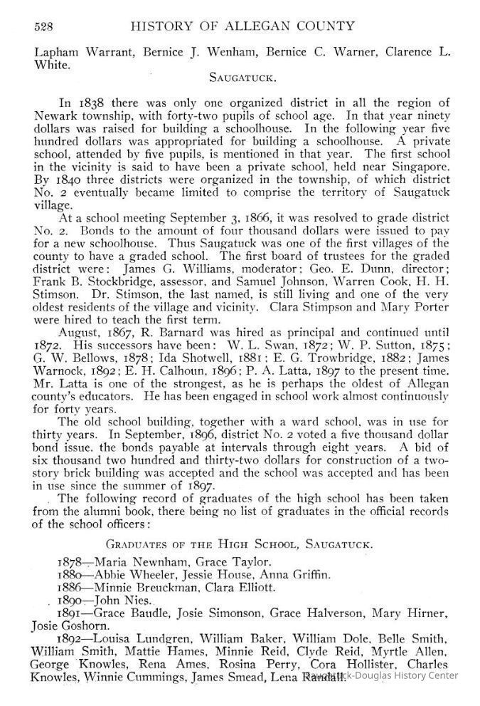 OCR scan of the pages: In 1838 there was only one organized district in all the region of Newark township, with forty-two pupils of school age. In that year ninety dollars was raised for building a schoolhouse. In the following year five hundred dollars was appropriated for building a schoolhouse. A private school, attended by five pupils, is mentioned in that year. The first school in the vicinity is said to have been a private school, held near Singapore. By 1840 three districts were organized in the township, of which district No. 2 eventually became limited to comprise the territory of Saugatuck village. At a school meeting September 3, 1866, it was resolved to grade district No. 2. Bonds to the amount of four thousand dollars were issued to pay for a new schoolhouse. Thus Saugatuck was one of the first villages of the county to have a graded school. The first board of trustees for the graded district were : James G. Williams, moderator ; Geo. E. Dunn, director ; Frank B. Stockbridge, assessor, and Samuel Johnson, Warren Cook. H. H. Stimson. Dr. Stimson, the last named, is still living and one of the very oldest residents of the village and vicinity. Clara Stimpson and Mary Porter were hired to teach the first term. August, 1867, R. Barnard was hired as principal and continued until 1872. His successors have been: W. L. Swan. 1872; W. P. Sutton, 1875; G. W. Bellows, 1878; Ida Shotwell, 1881 : E. G. Trowbridge, 1882; James Warnock, 1892; E. H. Calhoun, 1896: P. A. Latta, 1897 to the present time. Mr. Latta is one of the strongest, as he is perhaps the oldest of Allegan county's educators. He has been engaged in school work almost continuously for forty years. The old school building, together with a ward school, was in use for thirty years. In September, 1896, district No. 2 voted a five thousand dollar bond issue, the bonds payable at intervals through eight years. A bid of six thousand two hundred and thirty-two dollars for construction of a two-story brick building was accepted and the school was accepted and has been in use since the summer of 1897. The following record of graduates of the high school has been taken from the alumni book, there being no list of graduates in the official records of the school officers : Graduates of the High School, Saugatuck. 1878 — Maria Newnham, Grace Taylor. 1880 — Abbie Wheeler, Jessie House, Anna Griffin. 1886 — Minnie Breuckman. Clara Elliott. 1890 — John Nies. 1891— Grace Baudle, Josie Simonson, Grace Halverson, Mary Hirner, Josie Goshorn. 1892 — Louisa Lundgren, William Baker, William Dole, Belle Smith, William Smith, Mattie Hames, Minnie Reid, Clyde Reid, Myrtle Allen, George Knowles, Rena Ames. Rosina Perry, Cora Hollister. Charles Knowles, Winnie Cummings, James Smead, Lena Randall. 1893 — Mae Francis, Gilbert Pride, Mae Naughtin, Emma Randall, Archie Pierce, Gertrude Shriver, Ray Nies. 1894 — Oscar Wiley, Lanus Swemer, Anna Haut, Mattie Dole, Harry Bird, Susie Tisdale. Mamie Lundgren, Winnie Dole, Nellie Van Leuin, George Pride, Mabel Coif, Lizzie Nysson. 1895— Allan Falconer, Arthur Williams, Carrie Inderbitzin, Ethel Sutton. 1896 — Joseph Swemer, Harry Newcomb, John Schumaker, Pearl Phelps, Jason Dick, Bessie Bandle, Bina Annesley, Edith Brown, 1899— Harry Oleson, Murba Greenlees, James Koning, Amelia Shriver, Mattie Simonson, Herman Simonson. 1900 — William Tisdale, Edward Winslow, Elsie Vork, Florence Updyke, Gussie Barber, Russell Knox, Laura Miller, Charlie Upham, Bessie Newnham, Mae Belle Haywood, Blanche Baudle, Arie Koning, Ethel Baker, Ella Brown, Worth Durham. 1901 — Clarence Winslow, Robert Oleson, John Blink, Jennie Veits, Olive Ludwig, Louisa Walz, Mattie Hirner, Marie Upham, Faith Kirby, Ethel Winslow, Lottie Hancock, Mamie Schumaker, Florence Miller, Howard Coates, Louis Knox, Clarence Halverson. 1902 — Jessie Veits, Elsworth Ellis, Eldon Dick, Josephine Walberg, Louise Johns, Anna Oleson, Stella Dailey, Mildred Ireland, 1903 — Margaret Coxford, Pearl Heuer, Blanche McGregor, Bessie Wilson, Edith Leland, Eva Lundgren, Julia Shriver, Jennie Vork, Edith Brown, Bessie Riley, Theodore Hoffman, George Bradley, Arthur Reynolds. 1904— Frank Wade, Blanche Lamreaux, Bessie Smalley, Fannie Dailey, Marie Walz, Lizzie Schumaker, Pearl Olsen, Adelaide Wade, Julia McIntosh, Anna Garton, Milton Coates, Grace Haberer, Bertha Weed, Mona Jones, Lucina Taylor, Mack Atwater, Eva Haberer, Charles Atwater, Lizzie Dreher. 1905 — MacLean Babcock, Lottie Force, Edna Oleson, Maud Johns, Frances Garton, Jessie St. Johns, Gladys Rapalee, Edward Burdick, Edna Link, Mabel Wilson, Mary Randall, Nita Fort, Irene Kingsbury, Frank Johns, Eileen Manning, Myron Heath, Estelle Heath, Edward Redpath, Ellsworth Lundgren, Anna Burch, Faye Meade, Sarah Tisdale, 1906 — Chris Walz, Dorothy Dailey, Jessie Crow, Cornelia Koning, Alfaretta Smalley, Frank Smith, Charles Gilman, Alta Arends, Leon Chase, Marie Schaberg, Julia Brittian, Helen Erikson, Lizzie Dorman, Lois Helm, Robert Goodwin, Dawn Meade, Dora Wentzel.