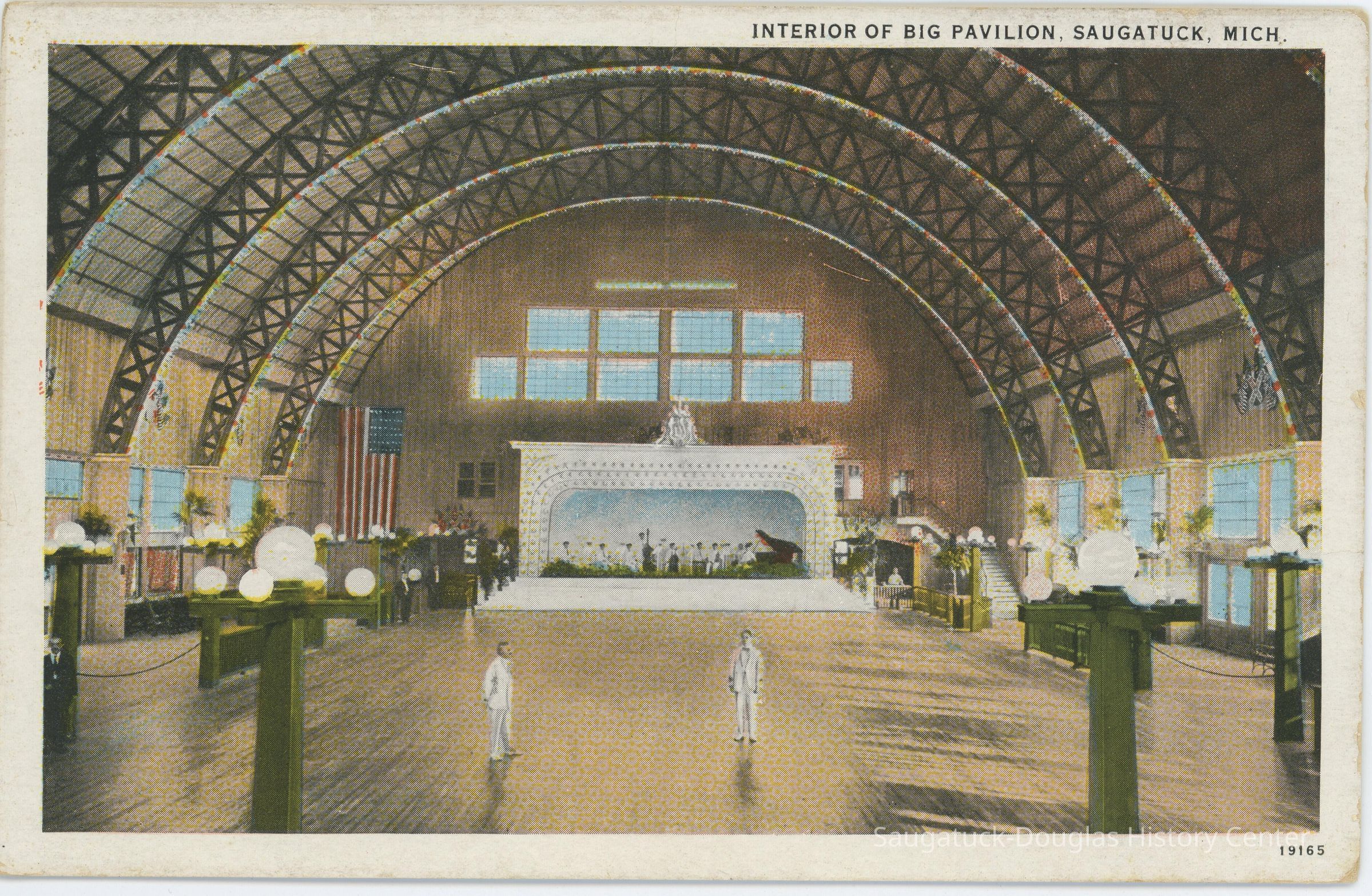 A color postcard showing the interior of the Big Pavilion. Two men dressed in white stand out in the center of the floor. A white stage rests at the end of the hall. Bright, electric lights illuminate the hall along with several large windows.
