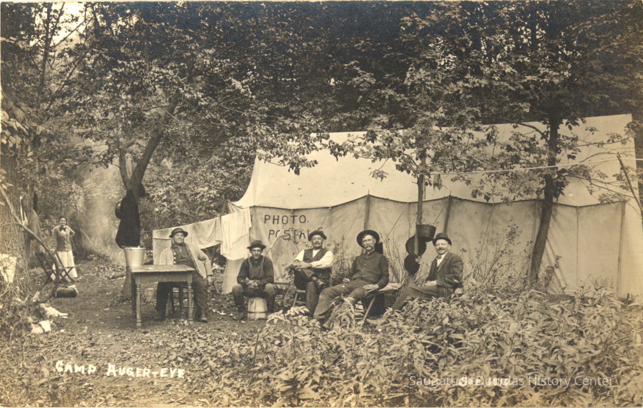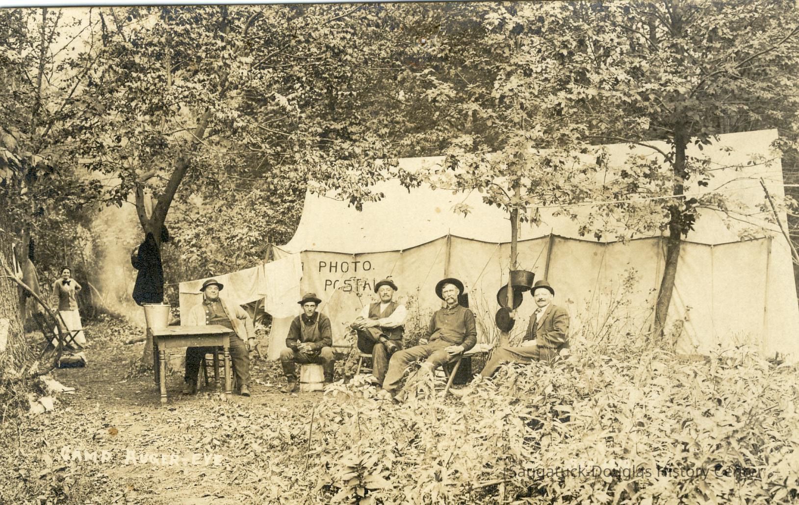 "The location is bordering the west side of the road [Park Street] somewhere between the Pumphouse museum and the Ox-bow property. The woman in the background left is Erma Crow Simonson, wife of Herman Simonson. I believe that the tent was an early photo studio open during the summer ca 1915. Possibly some of these people used it also for living quarters. The man on the left looks like Doc Heath but not sure. Herman's assistant, name of Olsen, might be next to him. Probably the camp name derives from the eyed auger tool. The photo itself can be identified by the printing style on the lower left, as a glass plate photo taken by Herman Simonson." - information via email from Jack Sheridan, March 2023