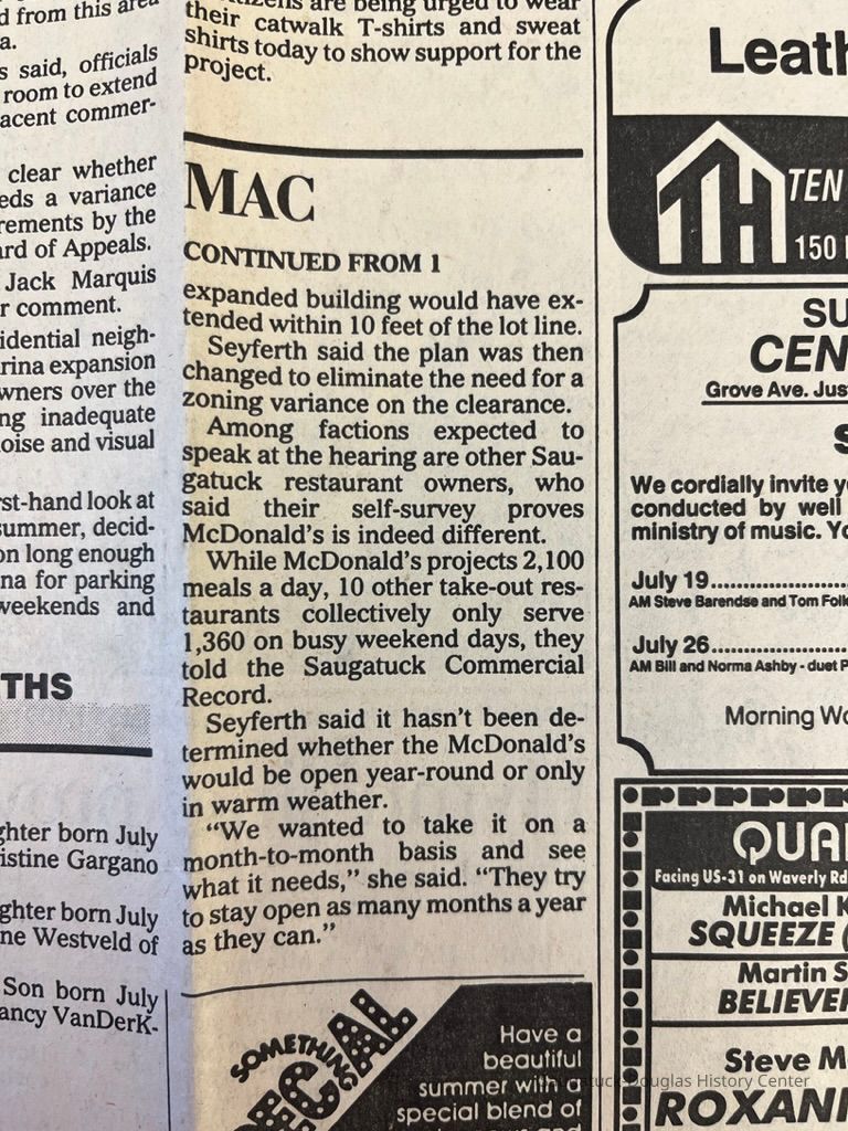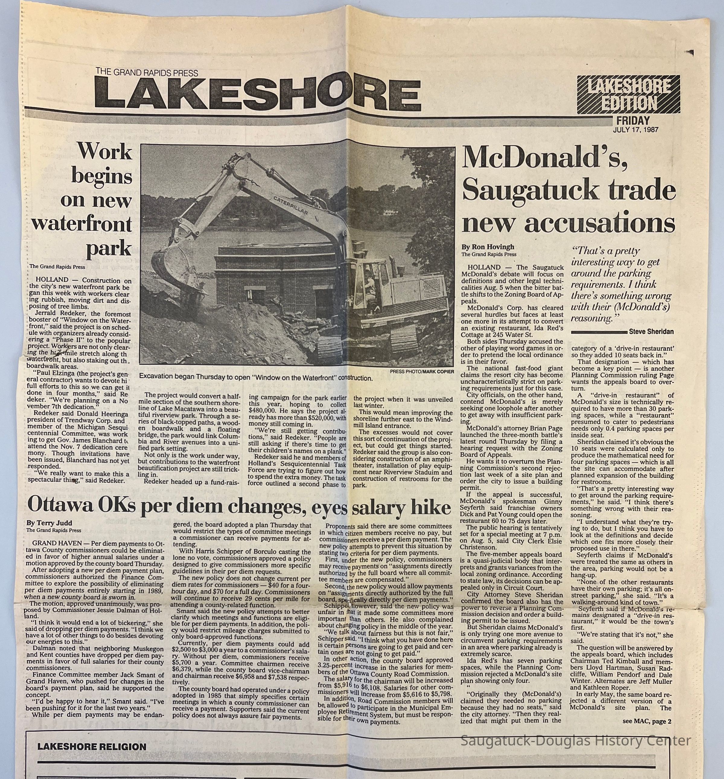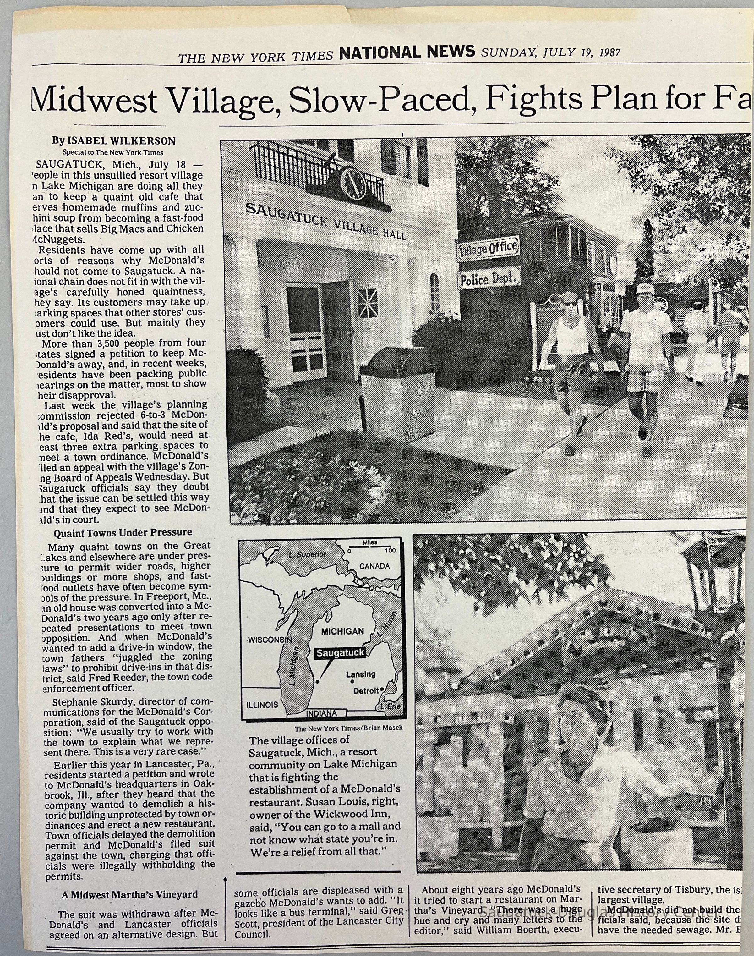 People in this unsullied resort village on Lake Michigan are doing all they can to keep a quaint old cafe that serves homemade muffins and zucchini soup from becoming a fast-food place that sells Big Macs and Chicken McNuggets. Residents have come up with all sorts of reasons why McDonald's should not come to Saugatuck. A national chain does not fit in with the village's carefully honed quaintness, they say. Its customers may take up parking spaces that other stores' customers could use. But mainly, they just don't like the idea. More than 3,500 people from four states signed a petition to keep McDonald's away, and, in recent weeks, residents have been packing public hearings on the matter, most to show their disapproval. Last week the village's planning commission rejected McDonald's proposal 6 to 3, and said that the site of the cafe, Ida Red's, would need at least three extra parking spaces to meet a town ordinance. McDonald's filed an appeal with the village's Zoning Board of Appeals on Wednesday. But Saugatuck officials say they doubt that the issue can be settled this way and they expect to see McDonald's in court. Quaint Towns Under Pressure Many quaint towns on the Great Lakes and elsewhere are under pressure to permit wider roads, higher buildings or more shops, and fast-food outlets have often become symbols of the pressure. In Freeport, Me., an old house was converted into a McDonald's two years ago only after repeated presentations to meet town opposition. And when McDonald's wanted to add a drive-in window, the town fathers ''juggled the zoning laws'' to prohibit drive-ins in that district, said Fred Reeder, the town code enforcement officer. Stephanie Skurdy, director of communications for the McDonald's Corporation, said of the Saugatuck opposition: ''We usually try to work with the town to explain what we represent there. This is a very rare case.'' Earlier this year in Lancaster, Pa., residents started a petition and wrote to McDonald's headquarters in Oakbrook, Ill., after they heard that the company wanted to demolish a historic building unprotected by town ordinances and erect a new restaurant. Town officials delayed the demolition permit and McDonald's filed suit against the town, charging that officials were illegally withholding the permits. The suit was withdrawn after McDonald's and Lancaster officials agreed on an alternative design. But some officials are displeased with a gazebo McDonald's wants to add. ''It looks like a bus terminal,'' said Greg Scott, president of the Lancaster City Council. A Midwest Martha's Vineyard About eight years ago McDonald's tried to start a restaurant on Martha's Vineyard. ''There was a huge hue and cry and many letters to the editor,'' said William Boerth, executive secretary of Tisbury, the island's largest village. McDonald's did not build there, officials said, because the site did not have the needed sewerage. Mr. Boerth said , ''We think the public outcry helped them come to that decision.'' Saugatuck considers itself the Martha's Vineyard of the Midwest. On a clear day yachts can be seen cruising up from Chicago and slowing as they get to the Kalamazoo River, where Saugatuck begins. Other people drive from as far as St. Louis and Cincinnati to shop for antiques, plow their Jeeps through pink sand dunes, and swim in the ''shining big sea water.'' Saugatuck was once a thriving lumber village. But ever since 1873 when, according to a book on Saugatuck history, ''a strange couple appeared,'' being ''recognized at once as city people by their clothes,'' the village has been a mecca for Midwestern city types. In 1892, The Grand Rapids Democrat observed that Saugatuck was becoming ''a summer resort for people who are tired of the world.'' That is precisely where McDonald's does not fit in, residents say. This is a place where some people are still sick about the twirling time-and-temperature clock at the bank and where people would rather drive halfway around the river to get to the beach than disfigure the landscape with a bridge. Not Why They Come Here The problem with McDonald's, said Fred Hellman, a local businessman, is that ''people can see McDonald's anywhere - they don't come to Saugatuck for fast food.'' Others have more practical concerns. ''I'm worried about delivery trucks unloading buns and frozen french fries and tying up traffic,'' said Art Daane, who owns several clothing boutiques here. Now residents are afraid that if McDonald's moves in, Wendy's and Burger King cannot be far behind. Already some property owners have been approached by interested chains, and, when a restaurant recently went on the market, a group of local businessmen bought it ''so it wouldn't be vulnerable'' said Mr. Hellman. No Arches, Company Says McDonald's officials say panic is unwarranted. The company says it will take care of its own litter, will bring deliveries at off-peak hours and intends to keep the the old-fangled charm of the building it wants to buy. ''We have no intention of knocking down the building or putting up a typical McDonald's sign or erecting golden arches,'' said James Flaum, McDonald's district manager for outstate Michigan. Still, some people see the coming of McDonald's as a metaphor for progress gone berserk. ''It's the Howard Johnson's, the McDonald's, the malls of the world that we're fighting against,'' said Susan Louis, owner of Saugatuck's Wickwood Inn. ''You can go to a mall and not know what state you're in. We're a relief from all that.'' Some merchants say the fight against McDonald's is not over. Some say they have retained lawyers and are looking for any way they can to keep McDonald's from coming in. ''McDonald's could buy the town if they wanted to,'' Mrs. Louis said. ''And they may have to.'' A version of this article appears in print on July 19, 1987, Section 1, Page 16 of the National edition with the headline: Midwest Village, Slow-Paced, Fights Plan for Fast-Food Outlet. https://www.nytimes.com/19