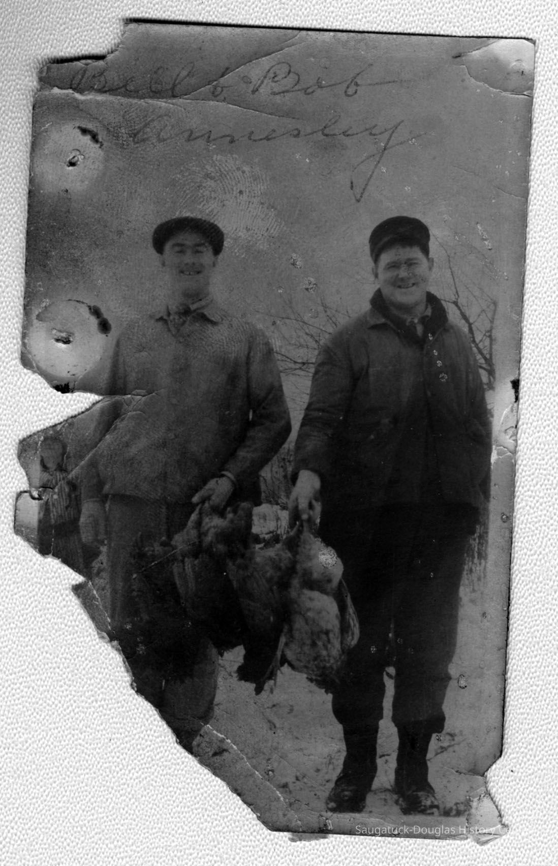 Partial B/W photo of two smiling men holding the feet of chickens or game birds. Snow on the ground and bare branches suggest the photo was taken in the winter.