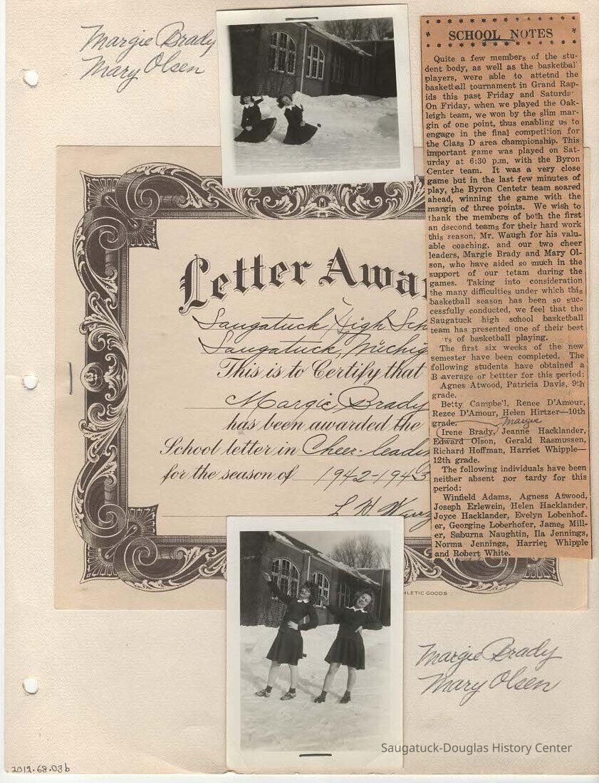 Photos and documents of two pages from a scrap book belonging to Margie Bradly. It includes three photos of SHS cheerleaders, Margie Brady and Mary Olsen 1942-43.