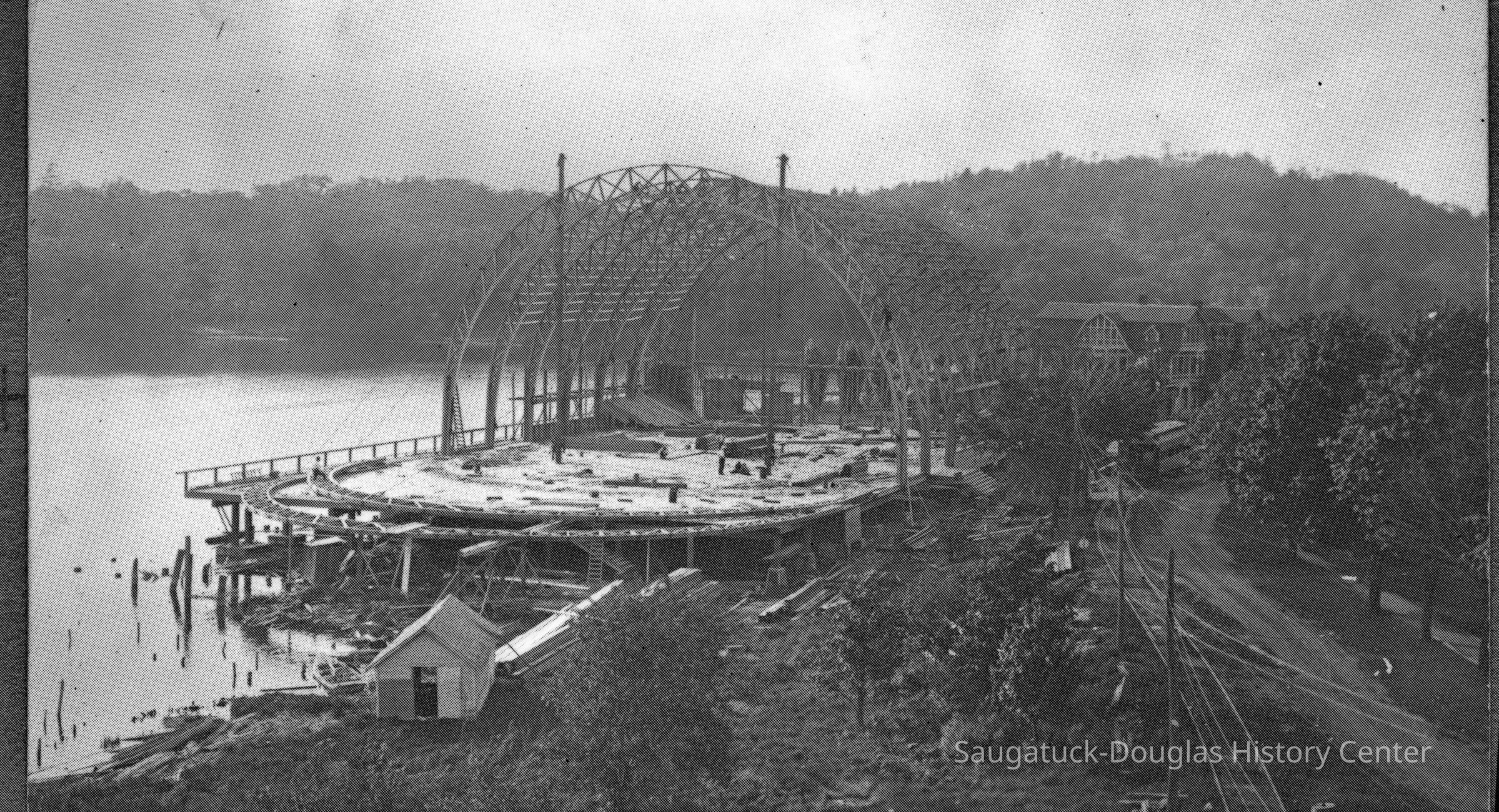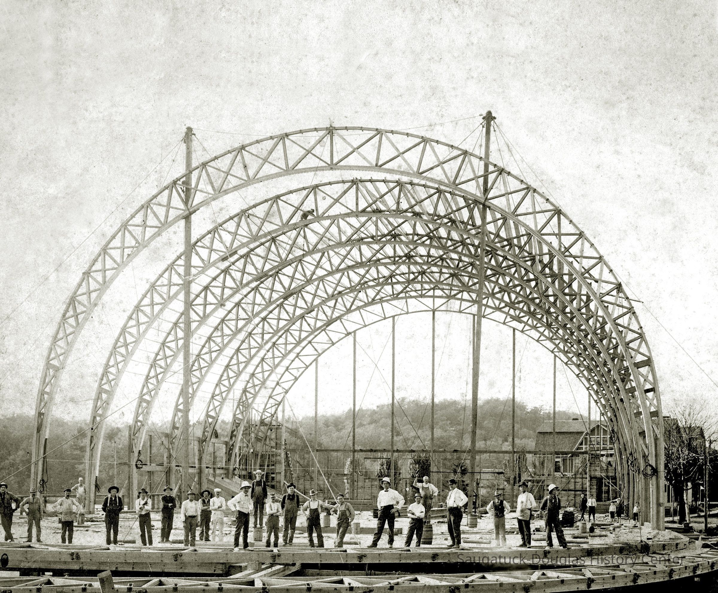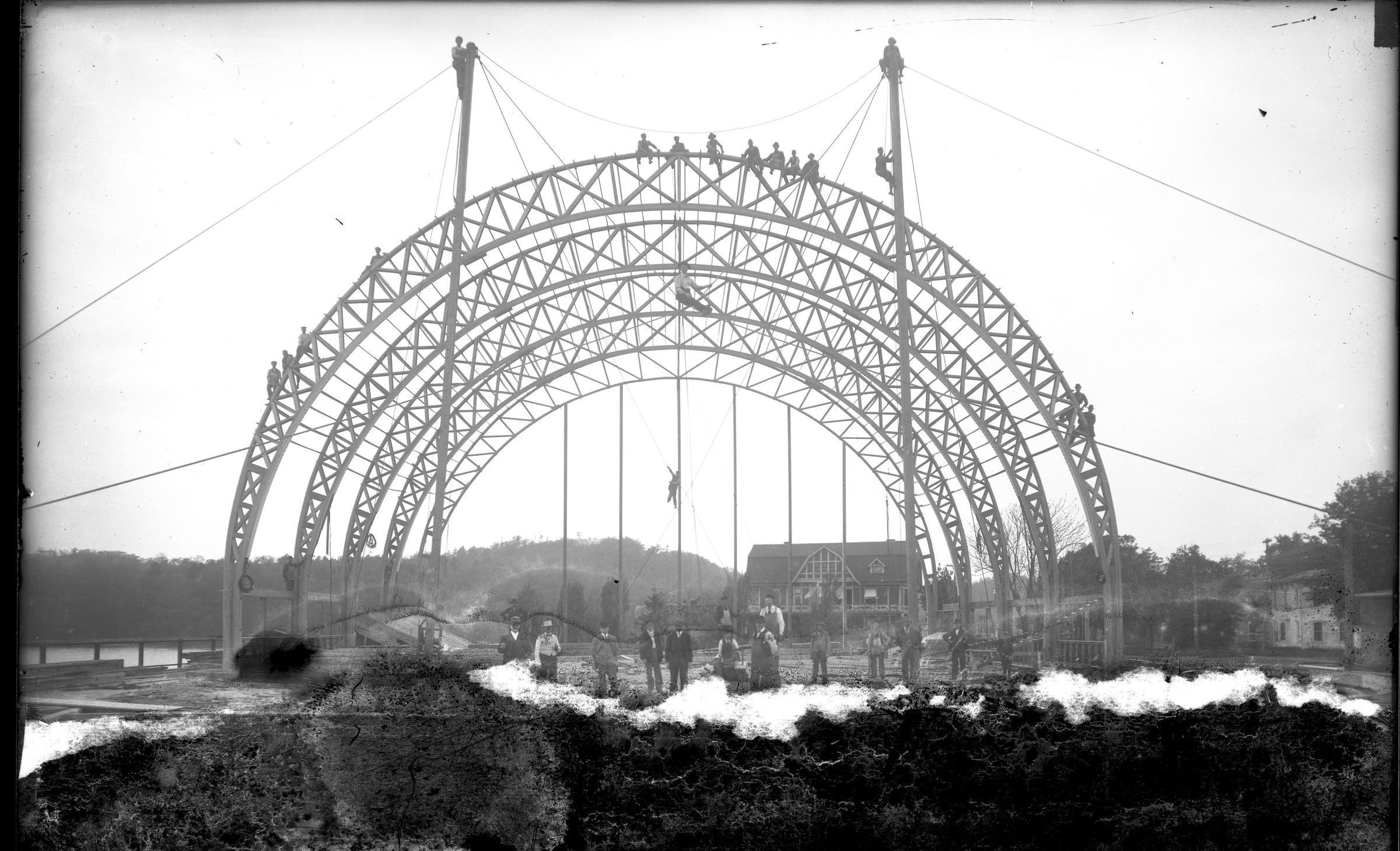 Photos of the construction of the Big Pavilion from the raising of the curved trusses, crisscrossed with X-shaped struts, to the raising of the flags in 1909.