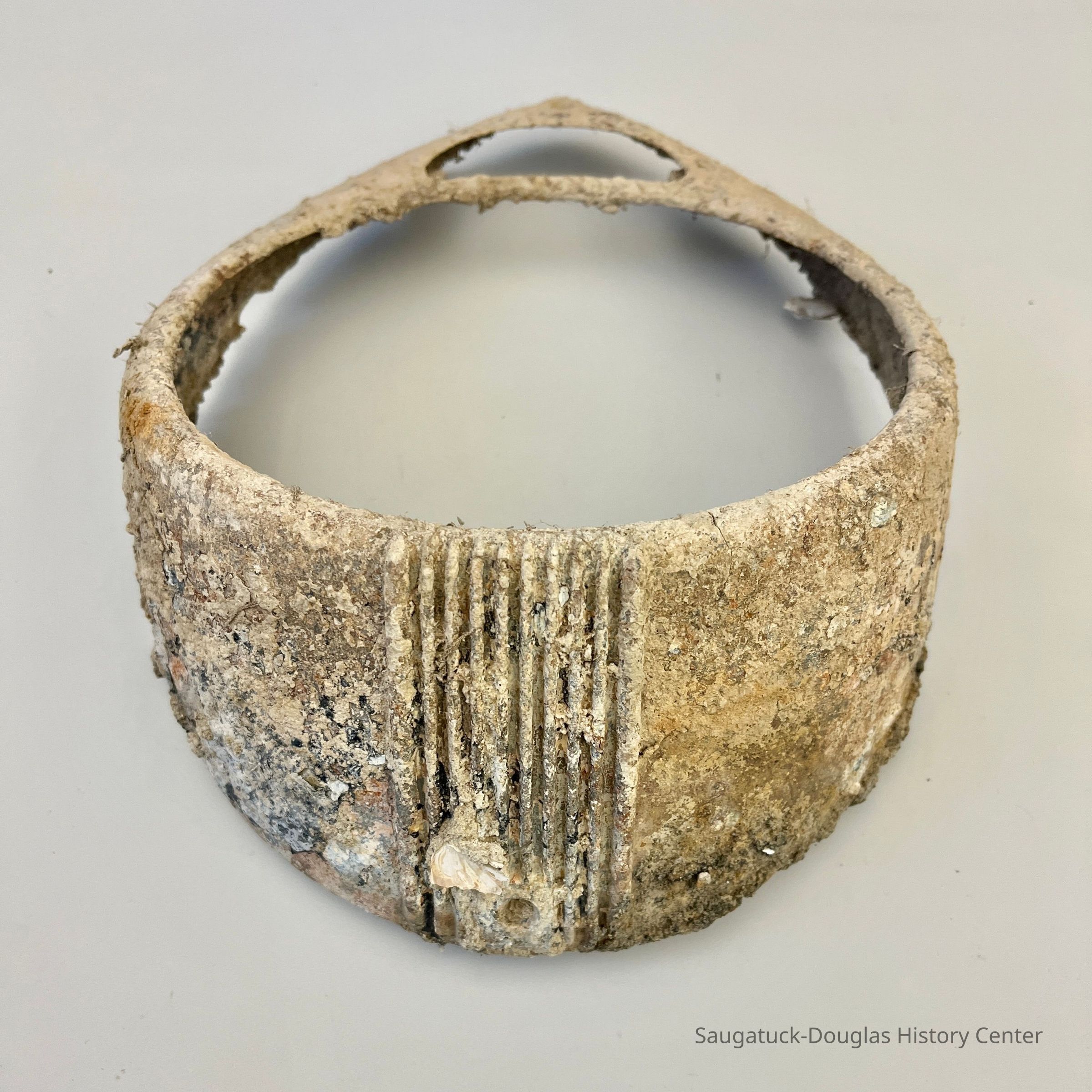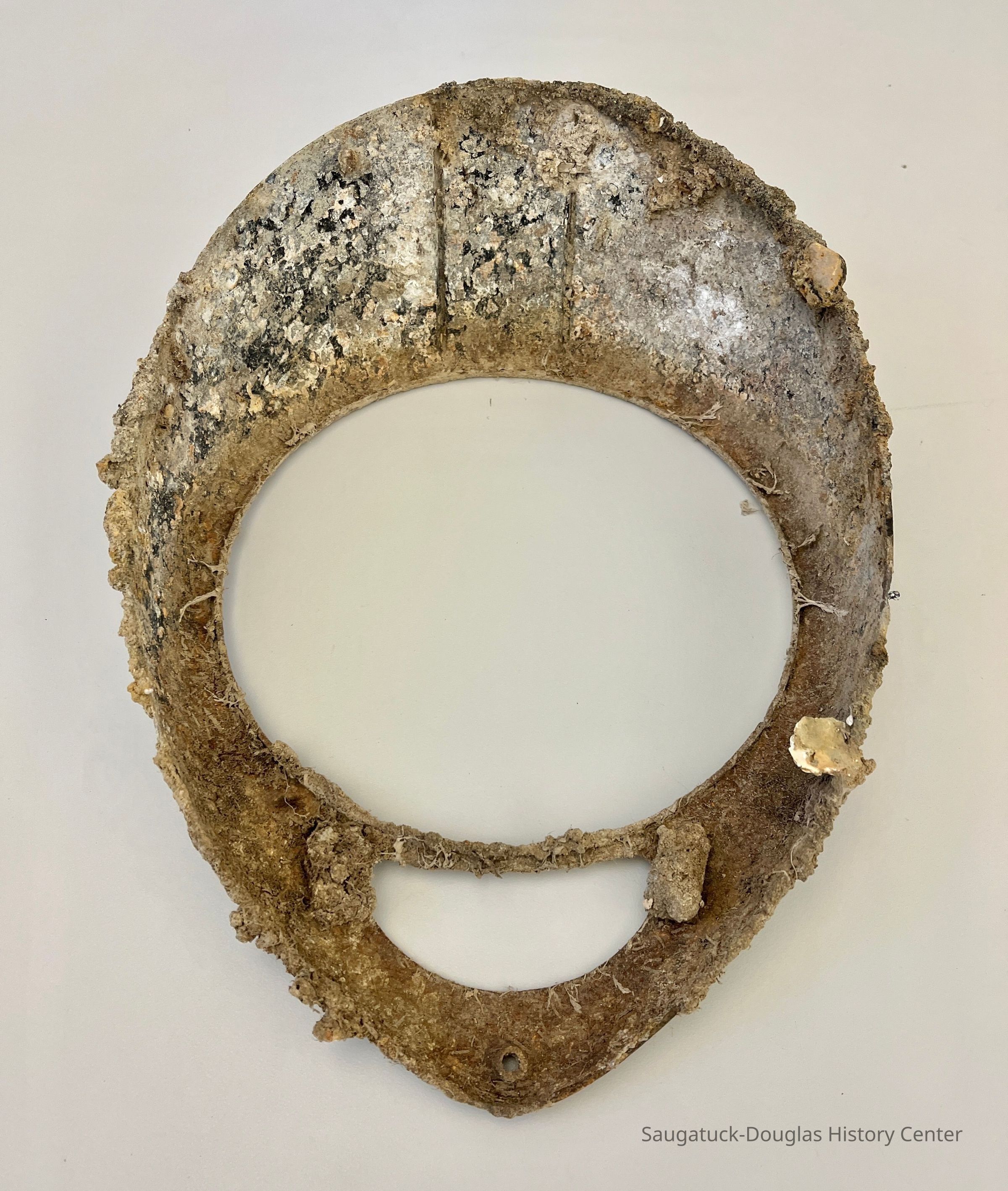 Six heavily rusted and/or encrusted items, thought to have been salvaged from the river. All have a similar amount of orange rust or gray encrustation that easily flakes off.