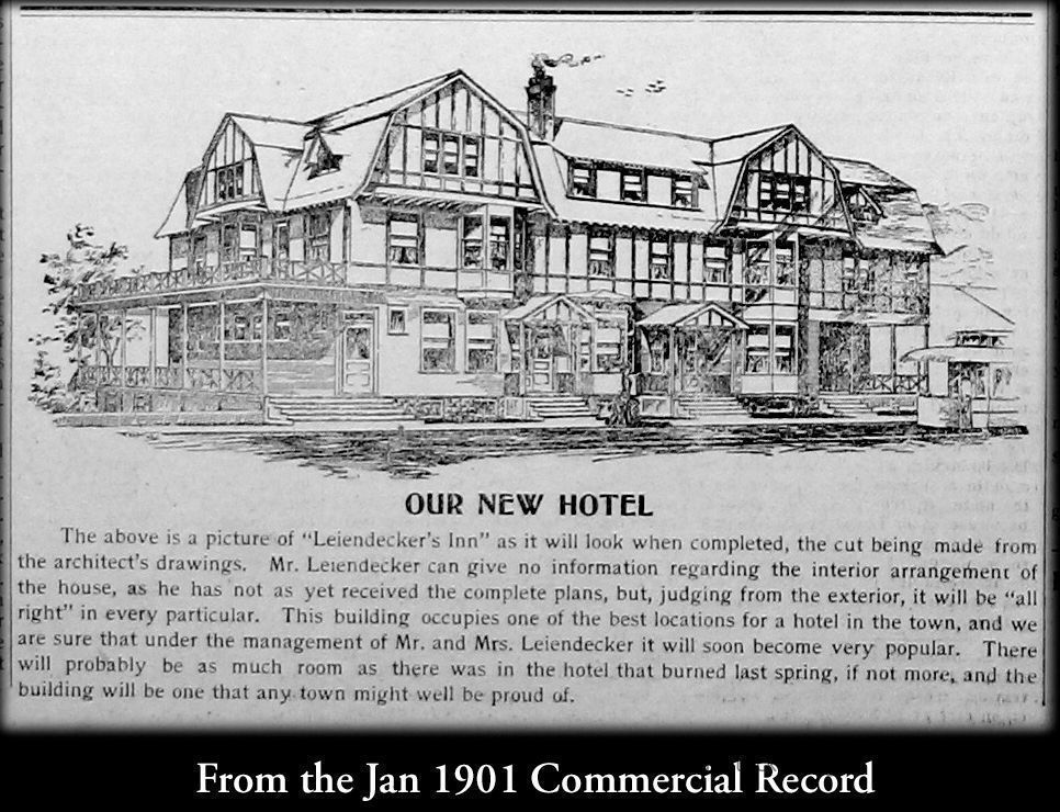 1905 Commercial Record ad that includes an architect's rendering of the Leiendecker's Inn after the proposed addition of a second gable on the north side of the building.