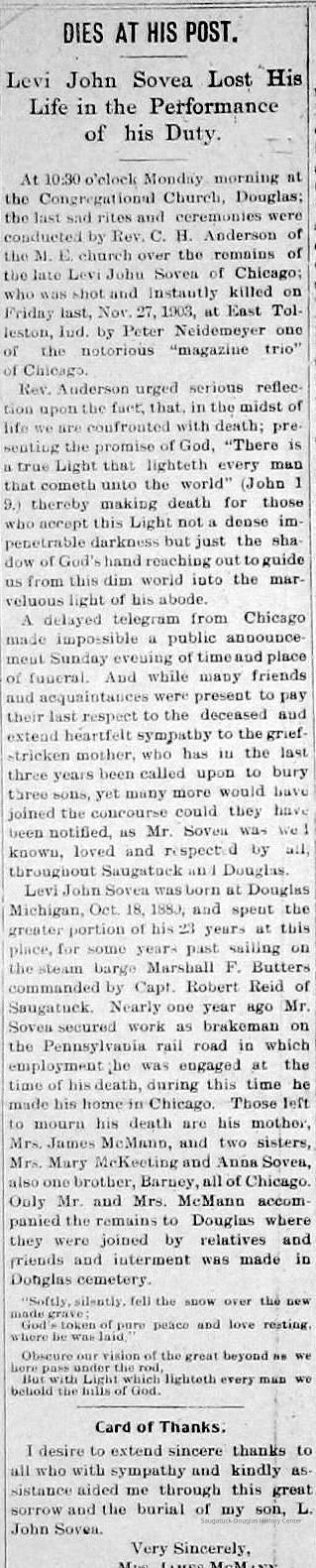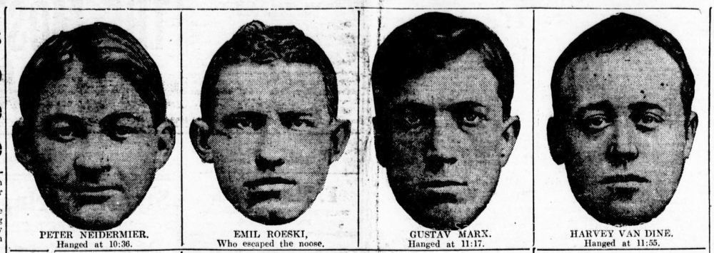 The Chicago Car Barn Bandits and Murderers, 1903 Story by Thomas Duke, 1910 “Celebrated Criminal Cases of America” Part III: Cases East of The Pacific Coast During the months of July and August, 1903, a reign of terror prevailed in Chicago similar to that which prevailed in San Francisco shortly after the great earthquake when Seimsen and Dabner, the “gas pipe” thugs, were plying their vocation. The gang responsible for this condition consisted of four very young men named Gustave Marx, Harvey Van Dine, Peter Neidemeyer and Emil Roeski. While this gang consisted of four members, there was no instance where less than two or more than three participated in any one crime. Their criminal career began in 1901, when Neidemeyer, Van Dine and Marx stole some lead pipe from the Audubon School in Chicago, for which they were sent to the “Bridewell” jail for three months. On the night of July 3, 1903, Neidemeyer and Roeski held up L. W. Lathrop and Martin Doherty while they were engaged in their duties at the Clybourn Junction station of the Chicago and Northwestern Railroad in Chicago. Lathrop offered resistance and was shot, but not fatally wounded. After obtaining $70 the bandits escaped. On July 9, Marx, Van Dine and Roeski held up the saloon conducted by Ernest Spires at 1820 North Ashland Avenue. Roeski went into the saloon and ordered a glass of beer. At that time the proprietor and a young man named Otto Bauder were the only other persons in the place. Van Dine and Marx then entered and ordered them to throw up their hands. Bauder tried to escape but Roeski shot him in the back, inflicting a fatal wound. Less than $50 was taken from the proprietor and the bandits departed. On the following night, Van Dine and Roeski entered Greenberg’s saloon at Robey and Addison Streets, and after forcing the bartender, Louis Cohen, who was the only one in the saloon, into the large ice chest, they took $25 from the cash register and disappeared. On the night of July 12, the same pair entered Charles Alvin’s saloon at Sheffield Avenue and Roscoe Street, and after drawing their automatic revolvers, which they habitually displayed on such occasions, ordered the proprietor and four patrons to hold up their hands while one of the robbers searched them. About $125 was obtained and again the pair escaped. On July 20, the same two entered Peter Gorski’s saloon, located at 2611 Milwaukee Avenue. The proprietor, who was alone at the time of their entry, attempted to hide behind the bar, but was shot in the head, a serious but not fatal wound being inflicted. The robbers obtained less than $5 from the cash register and fled. On the night of August 1, Van Dine and Neidemeyer entered the saloon conducted by Benjamin La Cross, located at 2120 West North Avenue, where the proprietor and Adolph Jennsen were playing a game of cards. Without the slightest provocation the blood-thirsty bandits opened fire, inflicting wounds from which both men died within twenty-four hours. Sixty-four dollars was obtained on this occasion. About 3 a. m. on August 30, 1903, Marx, Van Dine and Neidemeyer approached the car barn of the Chicago Street Railroad Company at Sixty-first and State Streets. In the office of the company, William Edmund, Frank Stewart and Henry Biehl were engaged in balancing up the day’s receipts, and J. Johnson, a motorman, was asleep in a chair in an adjoining room. Neidemeyer stopped at a side window of the office where he could observe all that transpired inside, while Marx and Van Dine, who carried a sledge hammer, proceeded to the entrance. The former pointed his automatic revolver through the receiving window at the occupants of the office and commanded them to throw up their hands, while Van Dine broke in the door with his sledge hammer, which was left in the office. As the clerks attempted to defend the company’s money, a fusillade of bullets was fired, both from the bandits in the office and from Neidemeyer, who fired through the window from the outside. On hearing the shots, motorman Johnson came into the room, the final result of the firing being that Stewart and Johnson were killed and Edmund and Biehl were seriously wounded. The bandits then gathered $2,250 and went to Jackson Park, where the money was divided. In the early part of November, 1903, Assistant Chief Schuettler learned that Marx was a frequenter of numerous resorts on the west side, and although out of employment, he was spending money recklessly. It was also ascertained that while under the influence of liquor he exhibited an automatic revolver. Detectives John Quinn and William Blaul of the 42nd Precinct were detailed to locate and arrest this fellow. On the night of November 21, 1903, he was located in Greenberg’s saloon, the same place which Van Dine and Roeski held up on July 10. It was arranged that Blaul should enter the side door at the same instant Quinn entered the front door of the saloon. Marx saw them as they entered, and like a flash he fired at Quinn, killing him instantly. Blaul fired and slightly wounded Marx. The officer then leaped forward and overpowered the bandit before he had an opportunity to fire again. Marx was manacled and taken to jail, where Assistant Chief Schuettler subjected him to a severe examination. At first the thug was non-committal, but when he realized that he would probably hang for the murder of Quinn and believing that his companions had deserted him, he finally made a complete confession of the crimes committed by the gang, as heretofore related in this narrative. In addition, it was learned that the sledge hammer used in the car barn robbery, which had a letter “N” burned in the handle, was stolen by Van Dine from the Northwestern railroad shops, where he was formerly employed. Shortly after the confession was made, it became public property and the pictures of the missing bandits were obtained by the police and published in the papers. Van Dine, Roeski and Neidemeyer t