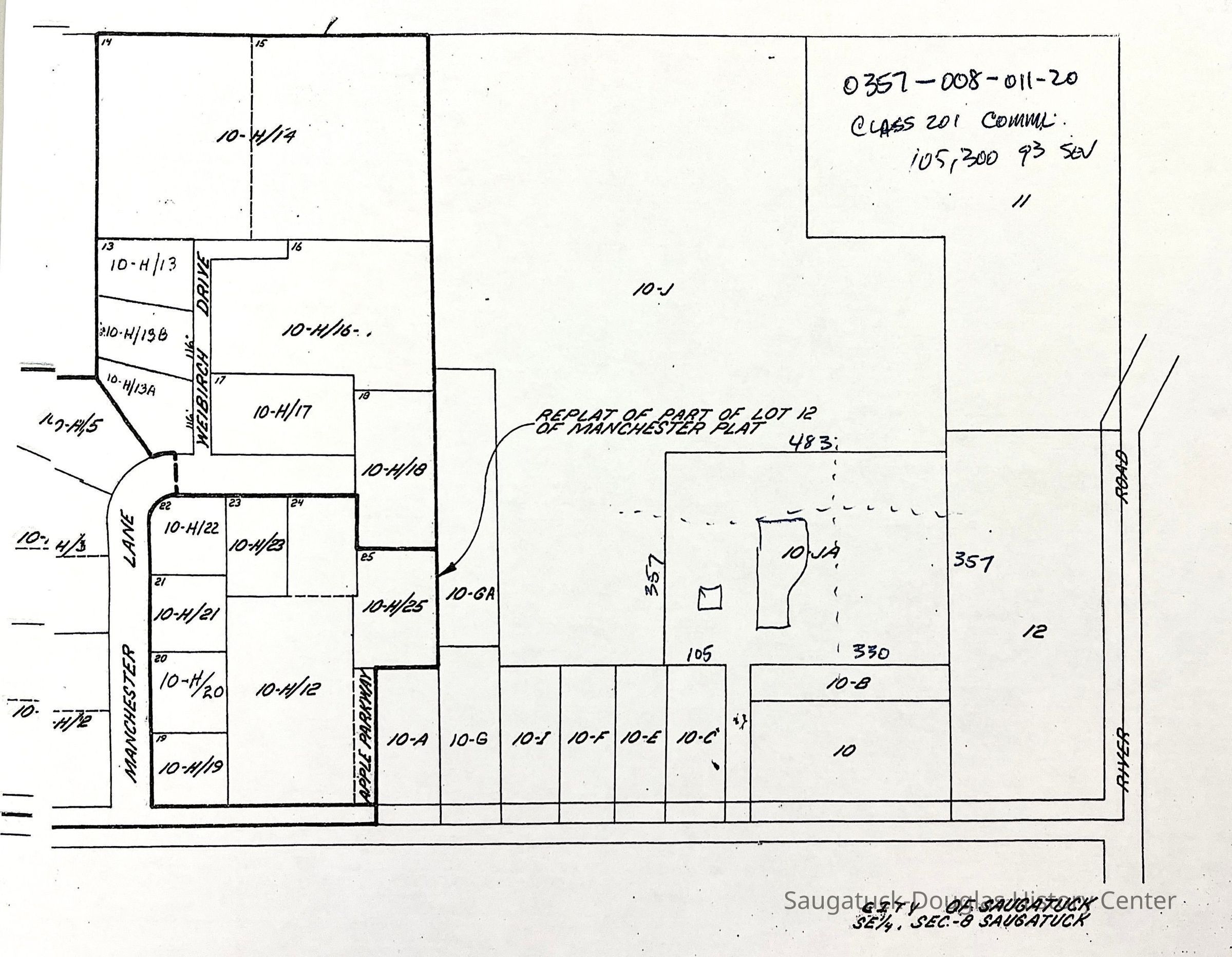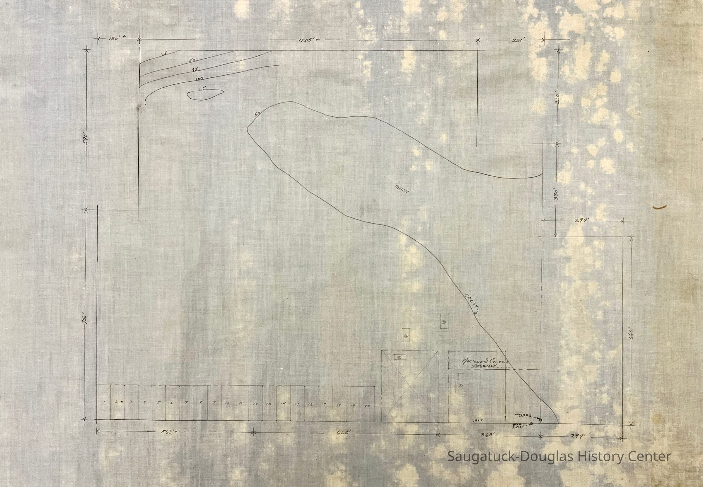 According to Cynthia Sorensen, the site was once an orchard owned by Edwin House and his brother. Later, the land belonged to Mark Atwood. In the mid 1940s, William Sorensen and his brother Walter Sorensen attempted to purchase the entire parcel in a land contract, but in the end, William purchased only a section in the southeast corner. In the late 1950s, Bob Kobernik purchased the middle of the parcel and built a house that is still there. The west portion was purchased by Don Manchester who developed Manchester Lane. A rectangle labeled number 2 is within a lot purchased by Art and Nancy Francis. This lot is west of the Sorensen lot. The two-story part of the barn was remodeled by William Sorensen to make a dwelling. A chicken coop was demolished but its cement pad was reused. A rectangle labeled number 3 marks about where a motel was built. The motel did not succeed and was foreclosed.The property was next purchased by Lloyd J. Harriss to use as a residence. He kept the motel section to house visiting business people. Today [2024] the site is known as the Secret of Saugatuck Suites . A rectangle labeled number 4 marks where a fruit storage building that was remodeled into a rental duplex. The line of 20 small lots facing Campbell were not developed as draw. But at least five houses were built along Campbell including those occupied by Merle Malmquist, Saugatuck Councilperson Mark Bekken, and John Geier, a Citizens Bank manager.