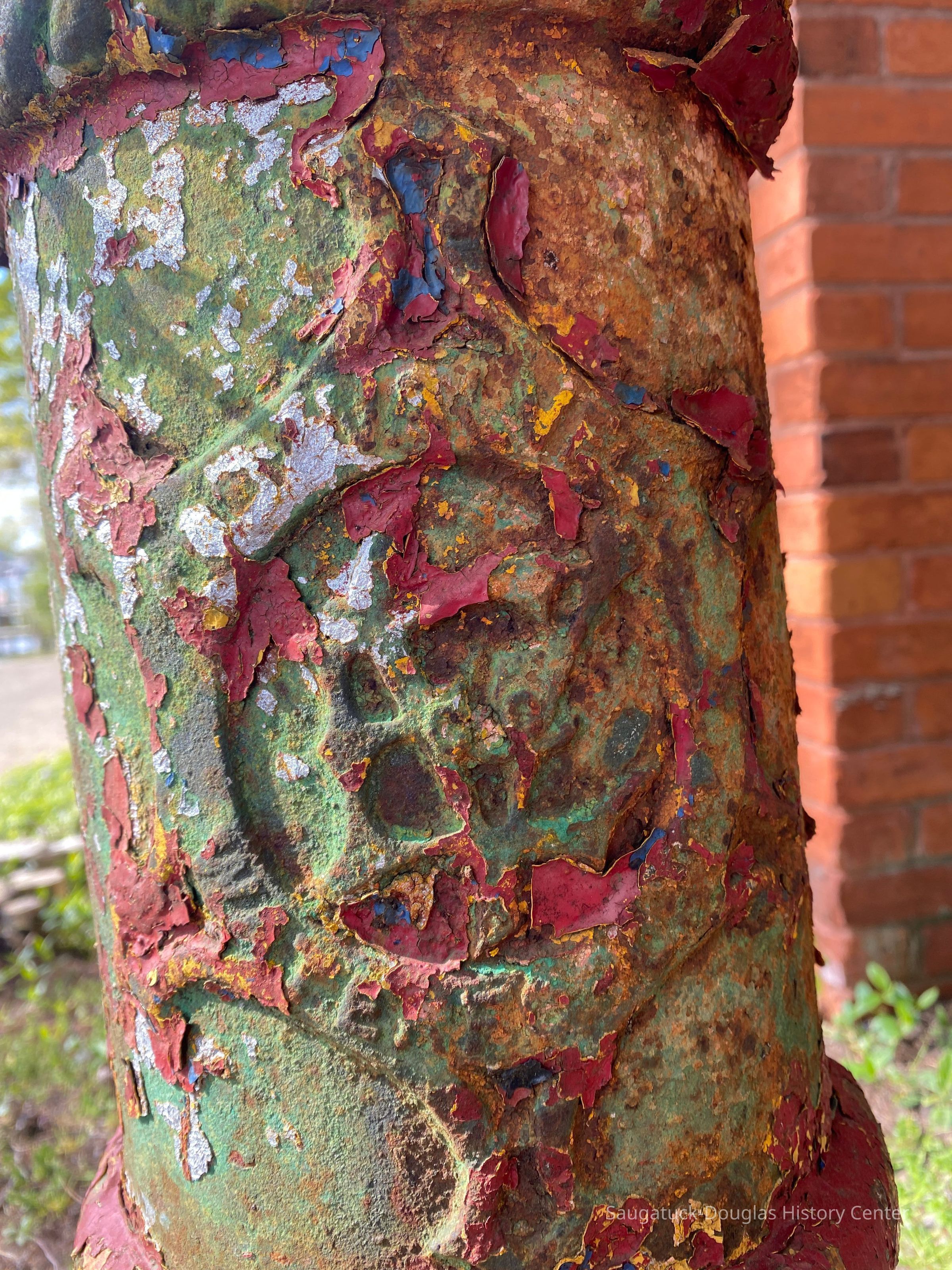 According to Vic Bella, for many years this hydrant laid in the museum garden, along the north wall of the building. In 2015, Erik Kirchert "planted" the hydrant to stand upright in its current location. The hydrant is not connected to a water supply. The original source of the hydrant is unknown. Most of these hydrants have been replaced with newer hydrants that support a greater water flow. This hydrant may have been one of the"double hydrants" noted in the 1910 and 1916 Sanborn Fire map [see 2009.15.02 and 2009.15.04]. According to Erik Kirchert of the Saugatuck Township Fire District, no hydrants of this type are in use as of 2023.
