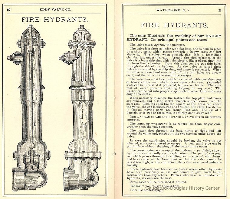 http://www.firehydrant.org/pictures/eddy_valve01.html: Eddy Valve was established in 1847 in Waterford, NY. Eddy Valve manufactured fire hydrants until the 1940s when the company that had previously been distributing their fire hydrants, James B. Clow and Sons, purchased the company and began selling the hydrants as their own line. James B. Clow and Sons eventually became Clow Valve who currently sells fire hydrants. According to Clow sales literature, the Eddy-style hydrant has been serving communities since 1875.