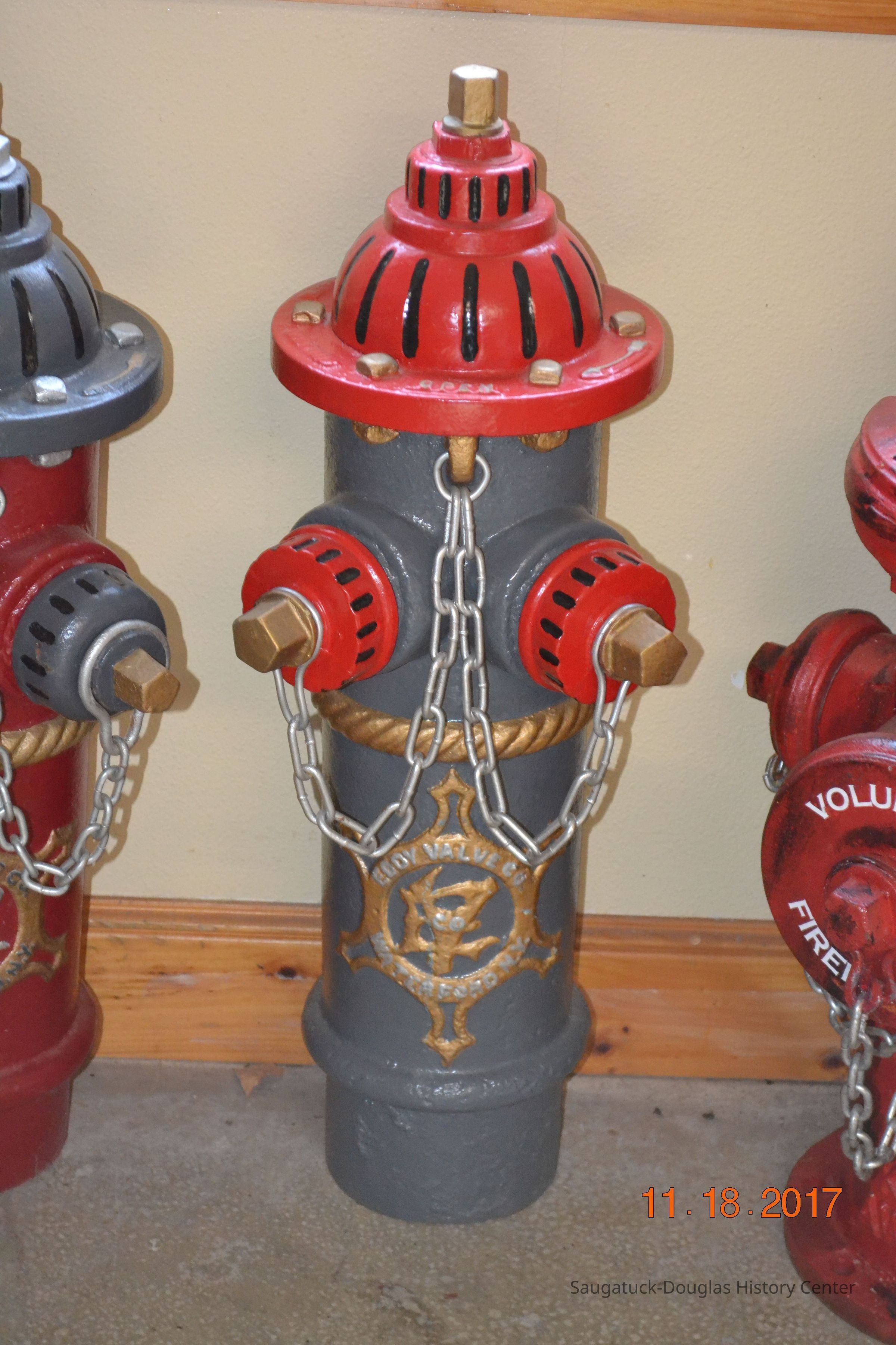 According to Vic Bella, for many years this hydrant laid in the museum garden, along the north wall of the building. In 2015, Erik Kirchert "planted" the hydrant to stand upright in its current location. The hydrant is not connected to a water supply. The original source of the hydrant is unknown. Most of these hydrants have been replaced with newer hydrants that support a greater water flow. This hydrant may have been one of the"double hydrants" noted in the 1910 and 1916 Sanborn Fire map [see 2009.15.02 and 2009.15.04]. According to Erik Kirchert of the Saugatuck Township Fire District, no hydrants of this type are in use as of 2023.