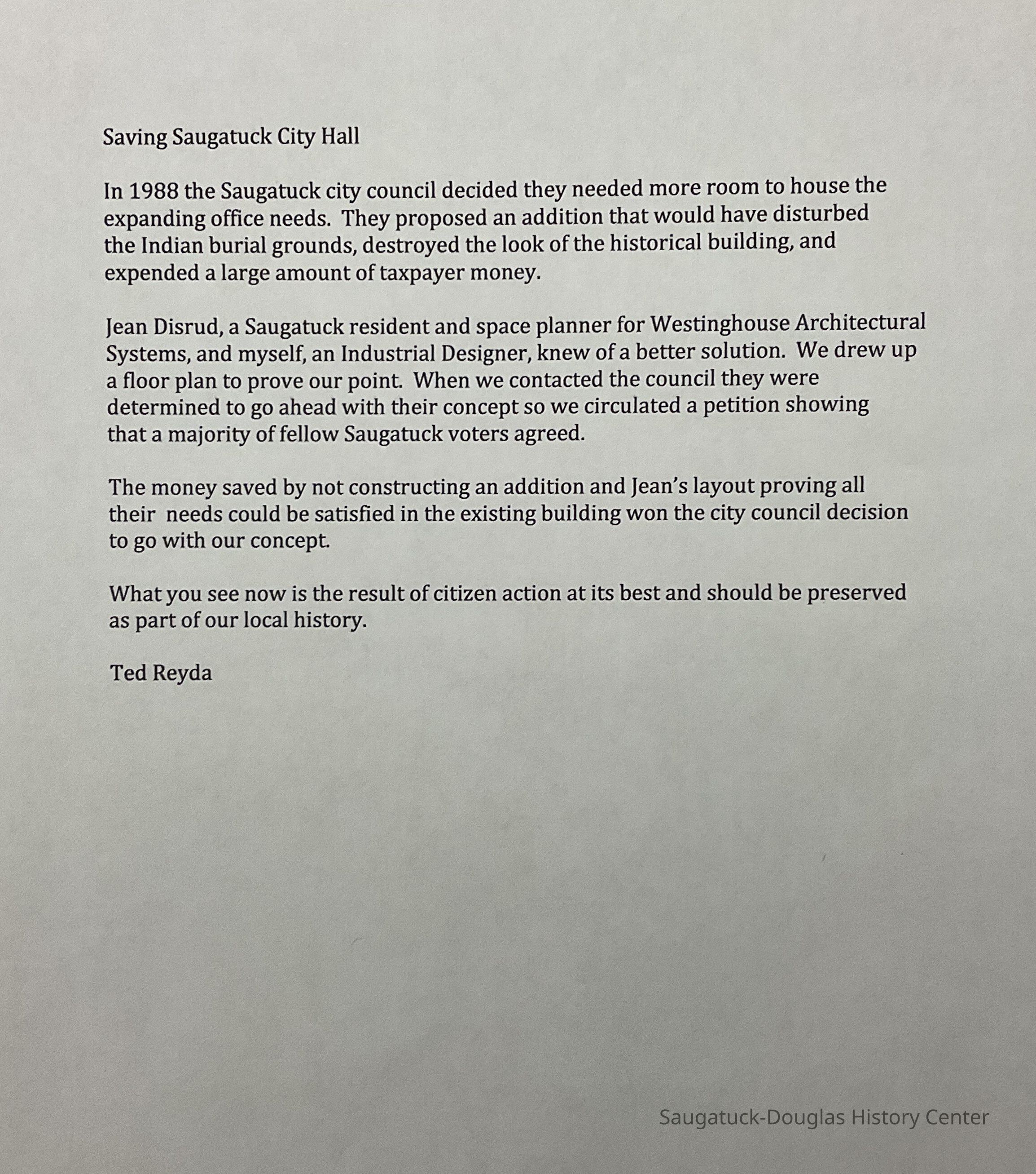 In 1988 the Saugatuck City Council decided they needed more room to house their expanding office needs. The proposed addition would have disturbed the Indian burial grounds and destroyed the look of the historical building. Reyda and Disrud came up with an alternative plan at a much lower cost. After initial resistance and a petition showing that the majority of Saugatuck voters agreed, the plans were approved.