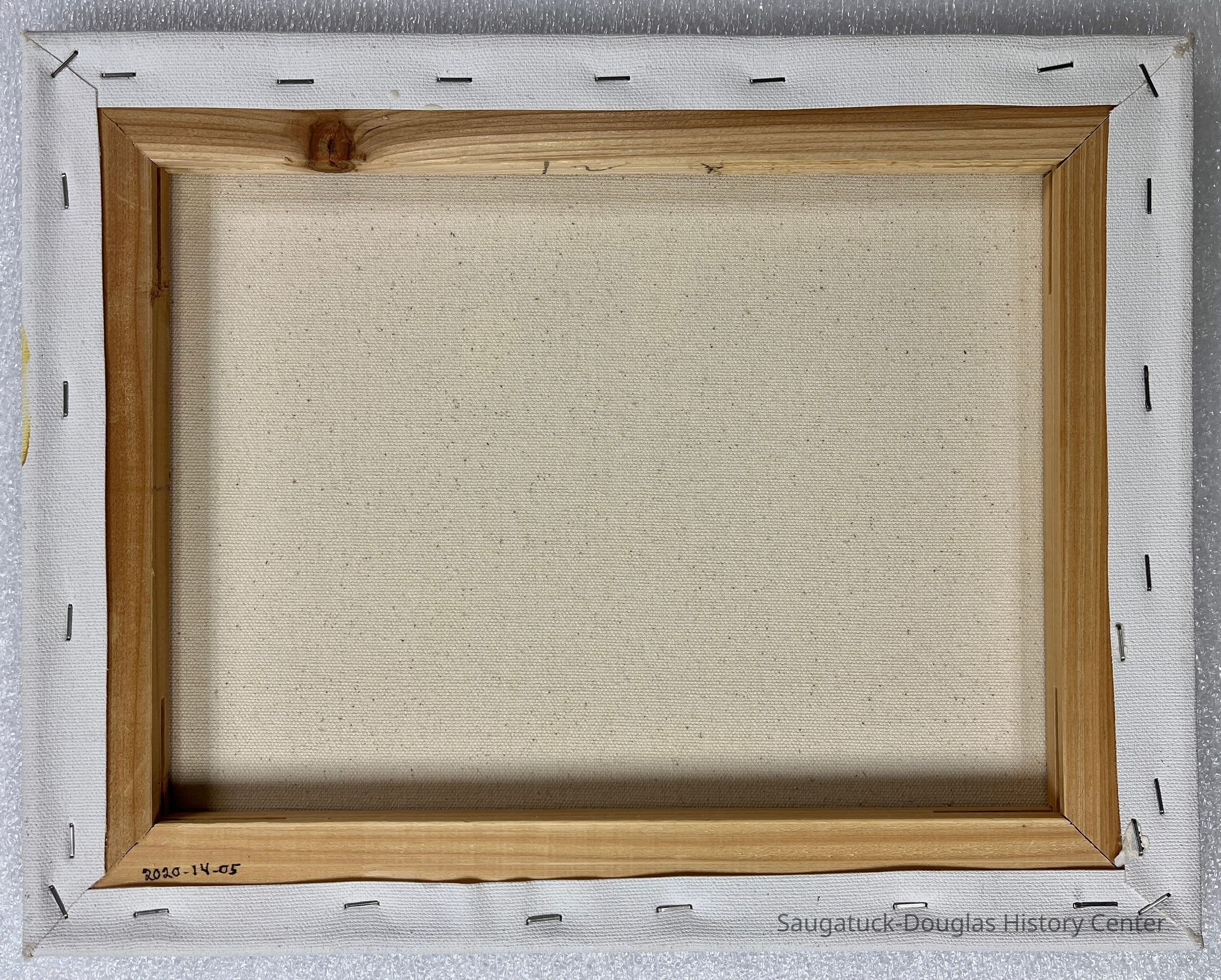 Humorous painting of two squirrels playing cards. The two rodents sit on a tree trunk with branches for chairs. They are betting with nuts. One squirrel is wearing green glasses, they other is wearing a red baseball cap backwards. The background is blue with mottled with black and white. Unframed mass-produced canvas stapled on wooden stretchers
