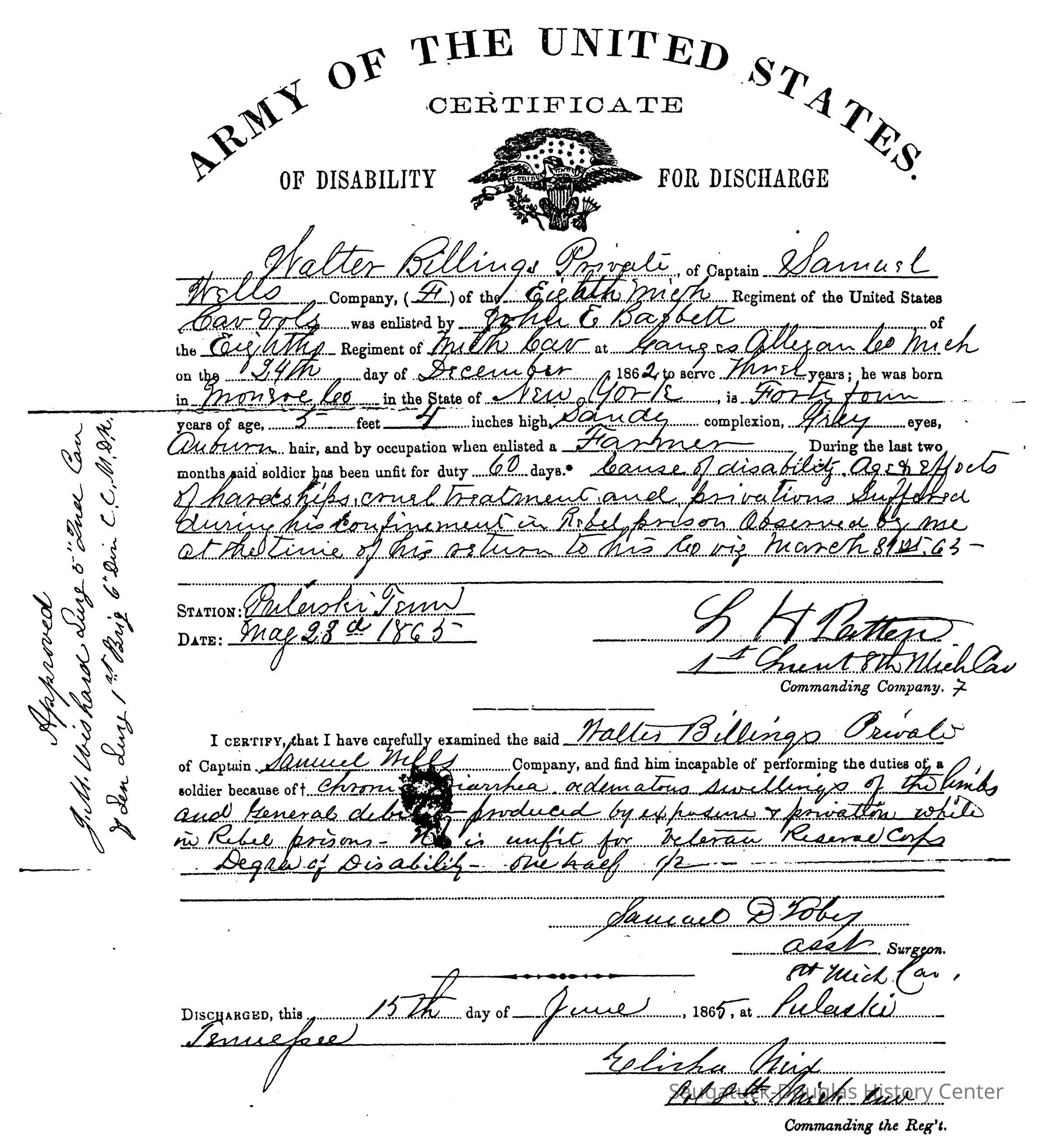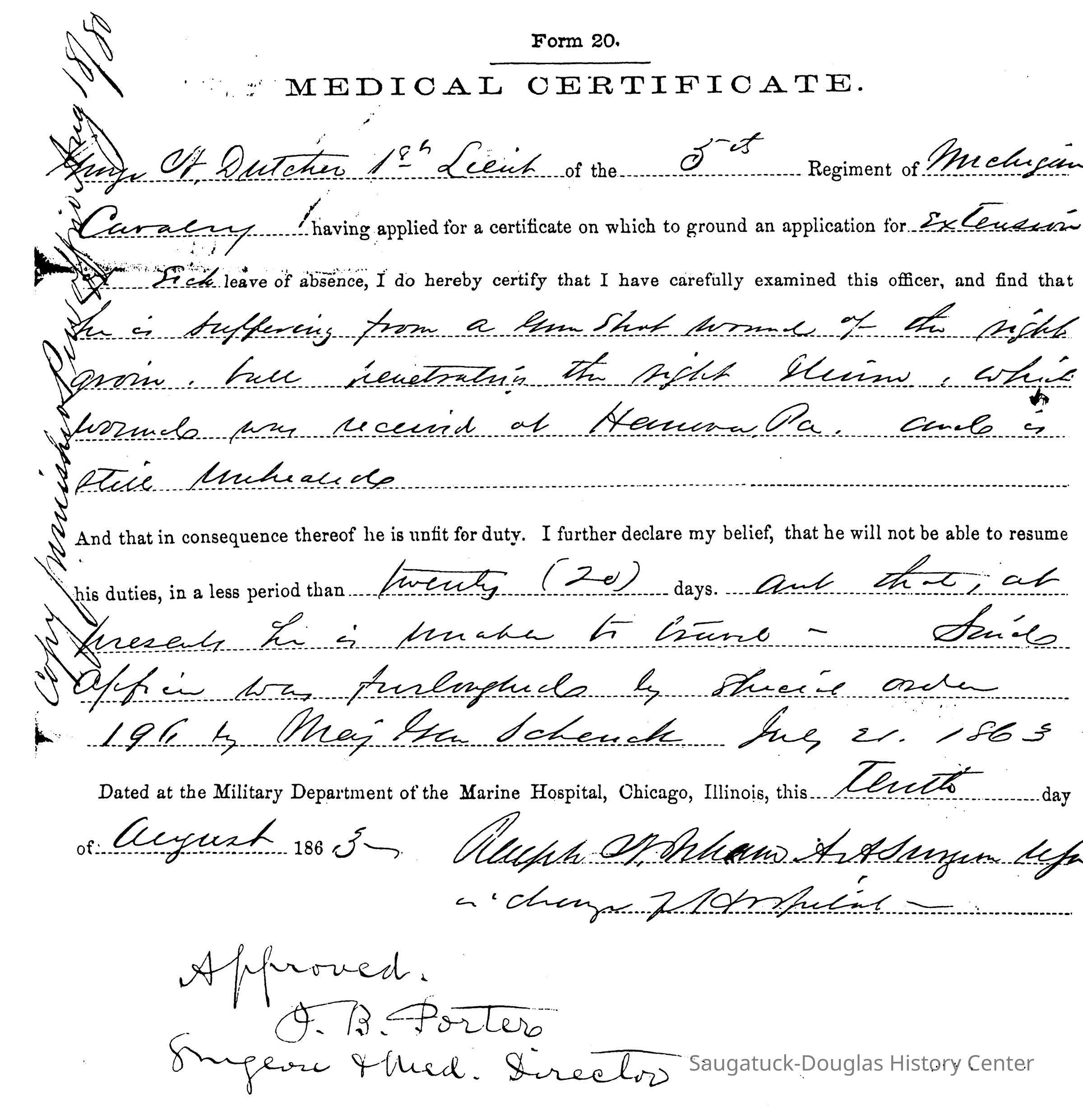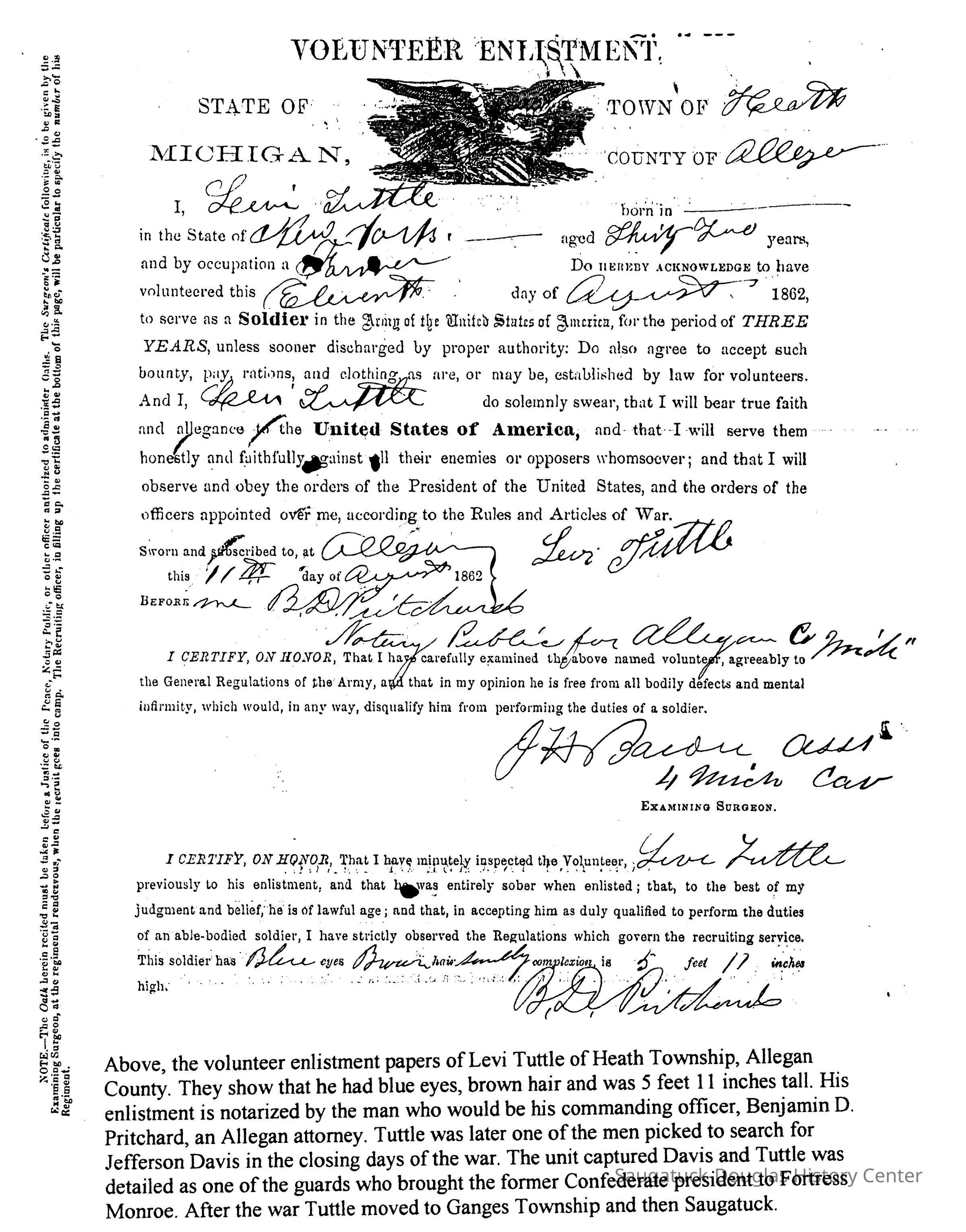 President Abraham Lincoln in the early days of the American Civil War met with a group of officers from the Michigan cavalry units and remarked that while other states had to train soldiers those from Michigan seemed to be "born ready made." There was some truth to this. The rigors of the Michigan frontier were excellent training for the trenches. Well over half of the recruits in Allegan County were farm boys who had been riding horses all of their lives. They had grown up in the forests and fields hunting deer, rabbits and other small animals - superb training for the infantry. These farm boys were hankering for adventure, for some action that did not involve plowing or harvesting. They got plenty of it. Their history, which will be the basis of the 2005 exhibit at the museum is told in tons of paper, now in the National Archives. Here is a sample of the documents that tell their story.