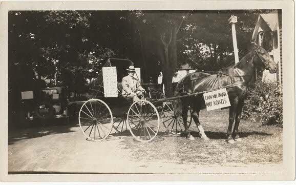 A photograph of Dr. Walker and his horse Prize and buggy in the Saugatuck Centennial parade 7/15/30. The notation on the back of the photo said they could navigate any roads — none impassable. "Can Negotiate Any Roads"